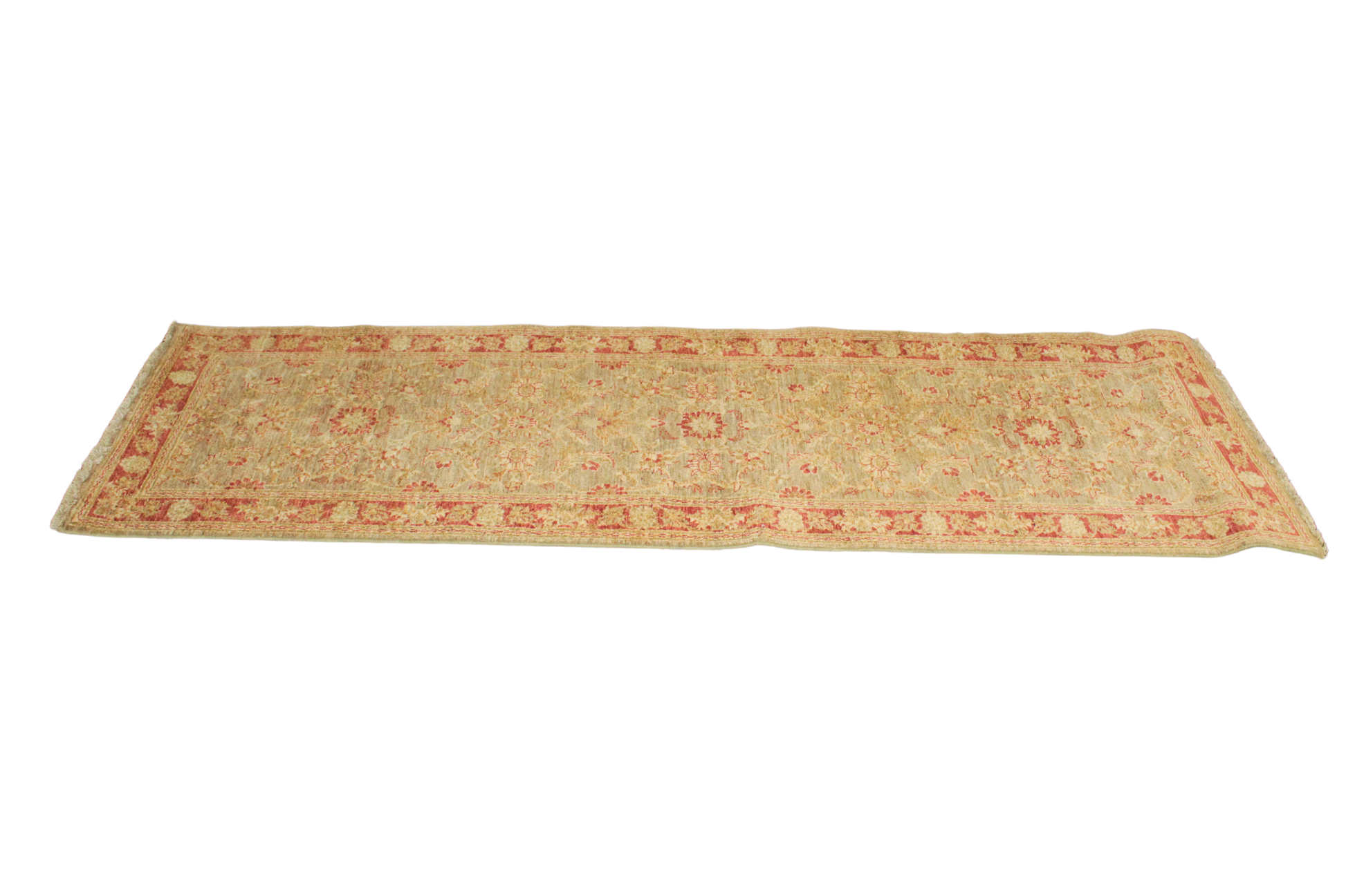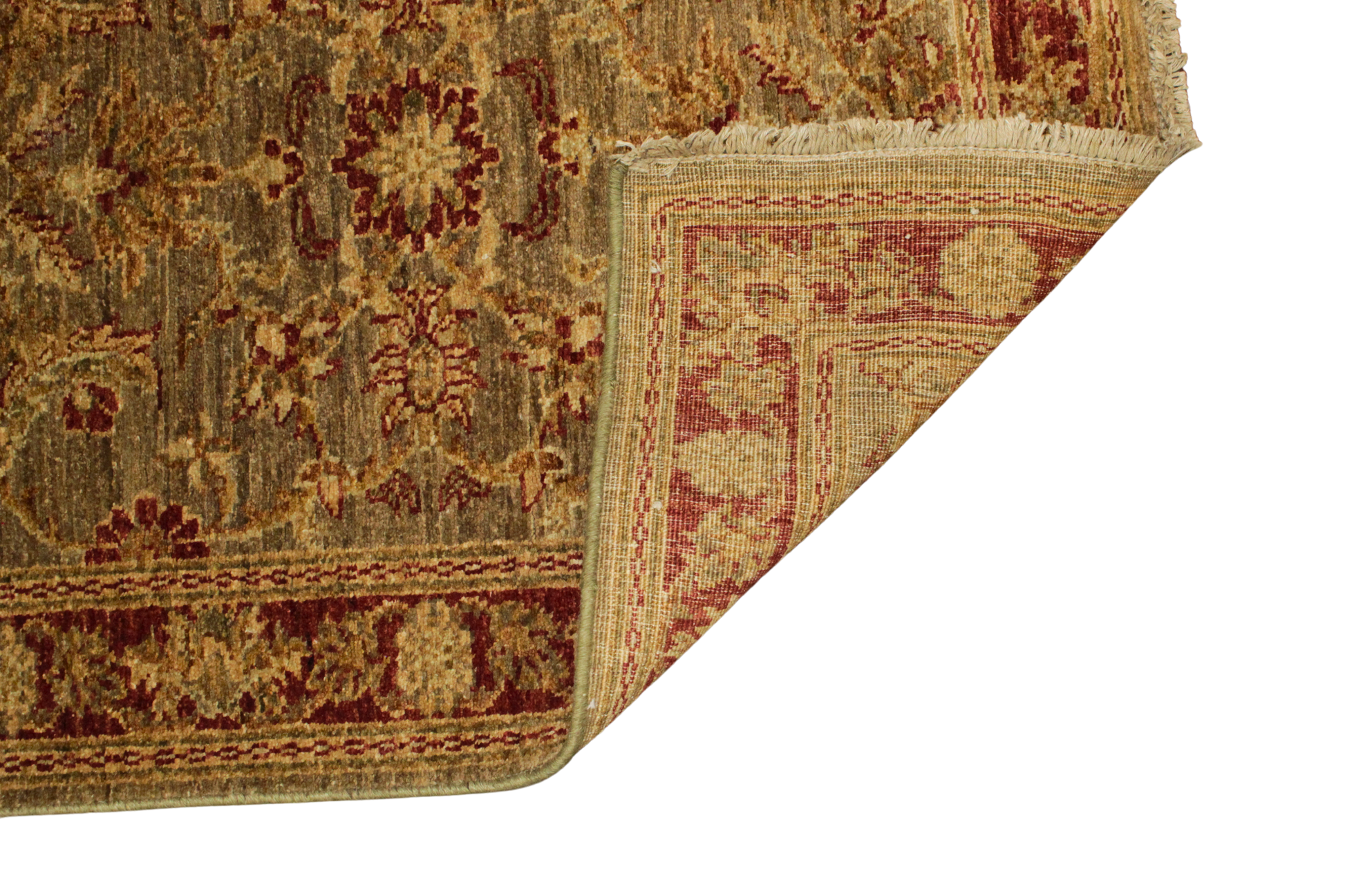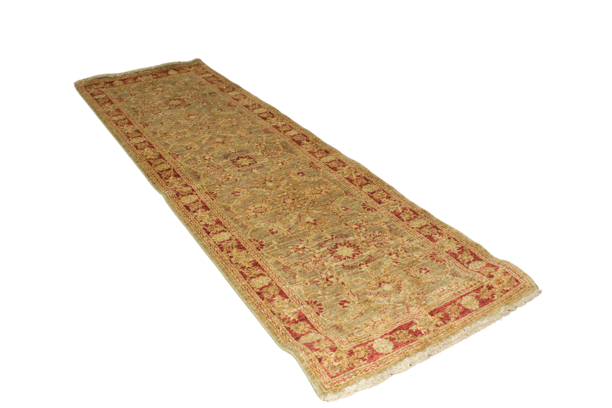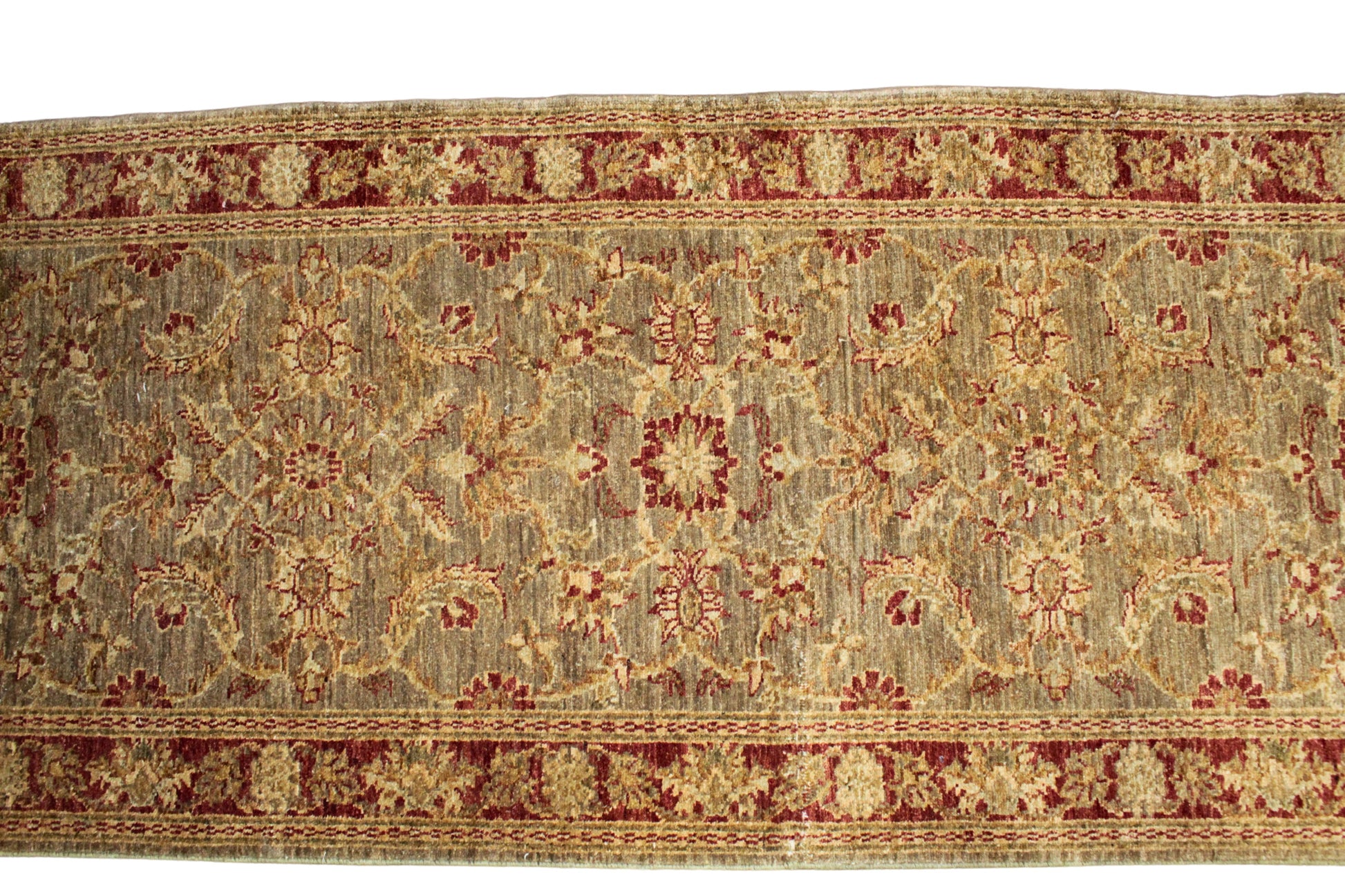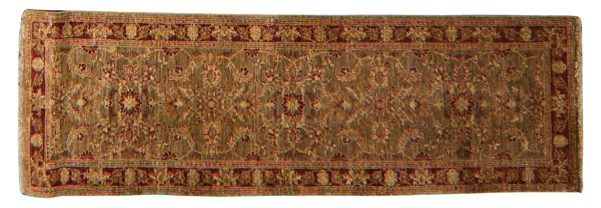 Infused with the warmth of russet and olive tones, this Pakistani Oushak runner blends classical charm with understated sophistication. The floral and vine motifs dance across a gently striated field, bordered by a bold rust frame adorned with rosettes. The wool's soft luster and earthy hues evoke the glow of a late afternoon sun, bringing cozy richness to hallways or transitional spaces.