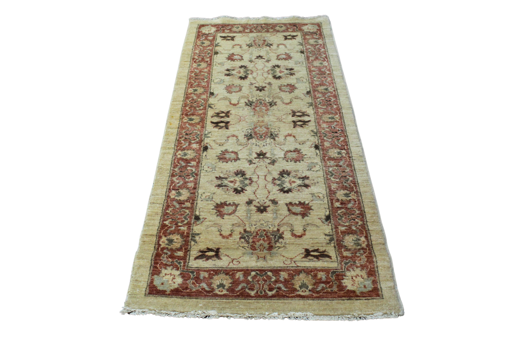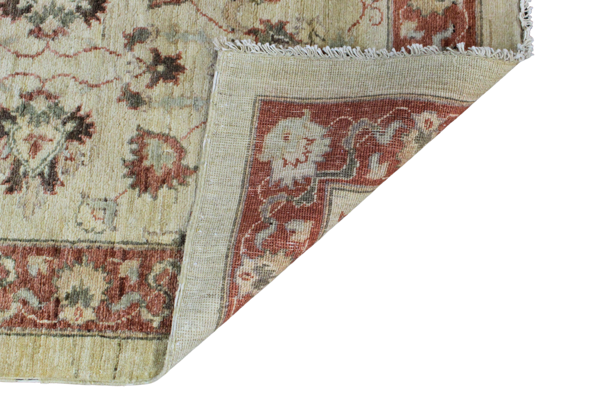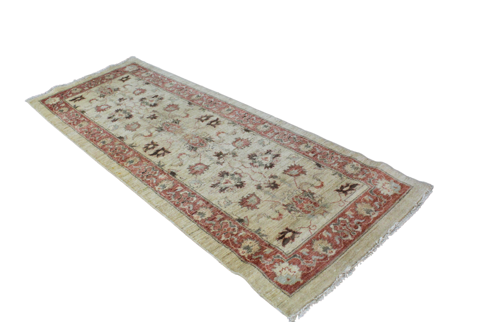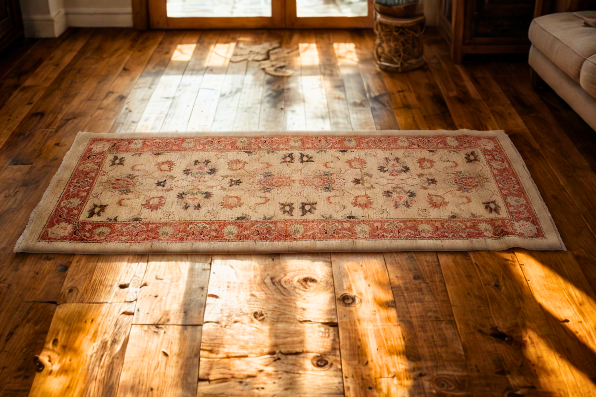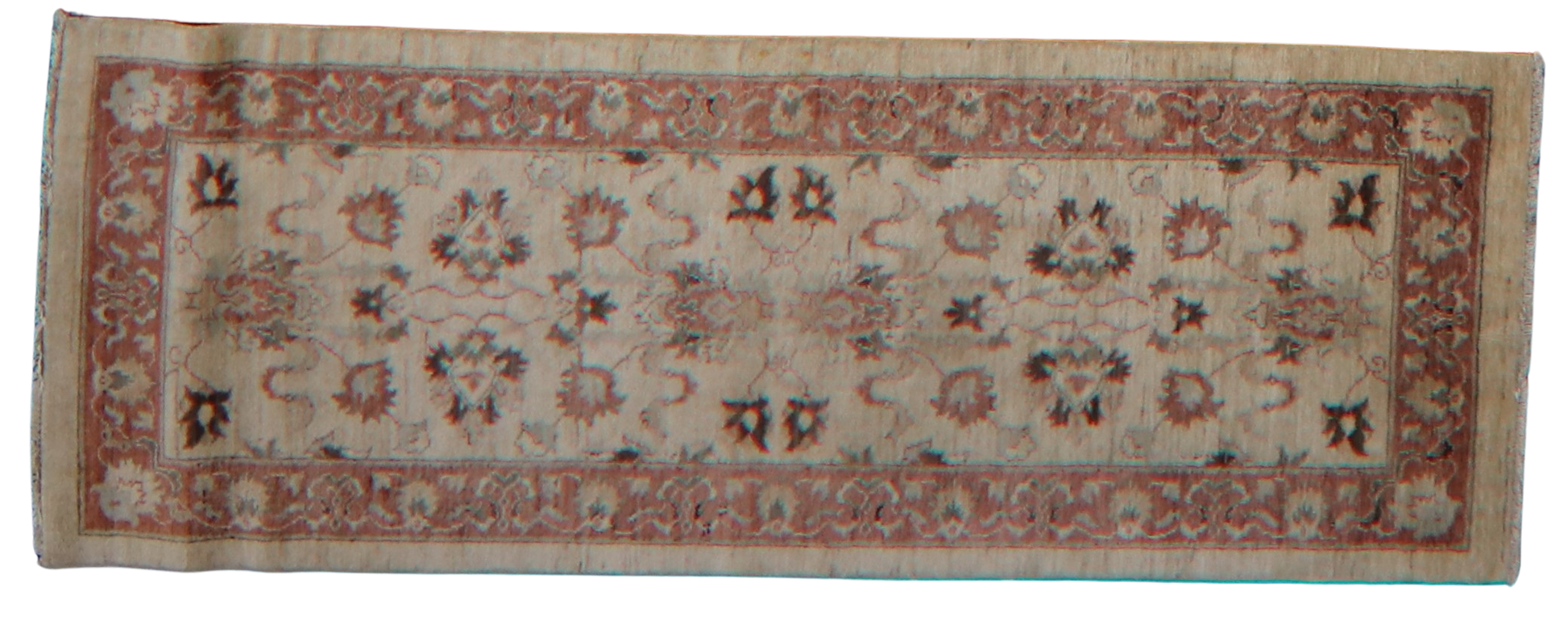 With its delicate floral tracery and gently faded colors, this Pakistani Oushak runner feels like a vintage garden walk. A warm ivory background sets the stage for stylized floral sprays in dusty rose, faded walnut, and hints of teal. The rust-toned border provides a grounded frame, subtly contrasting the floating botanical motifs at the center.