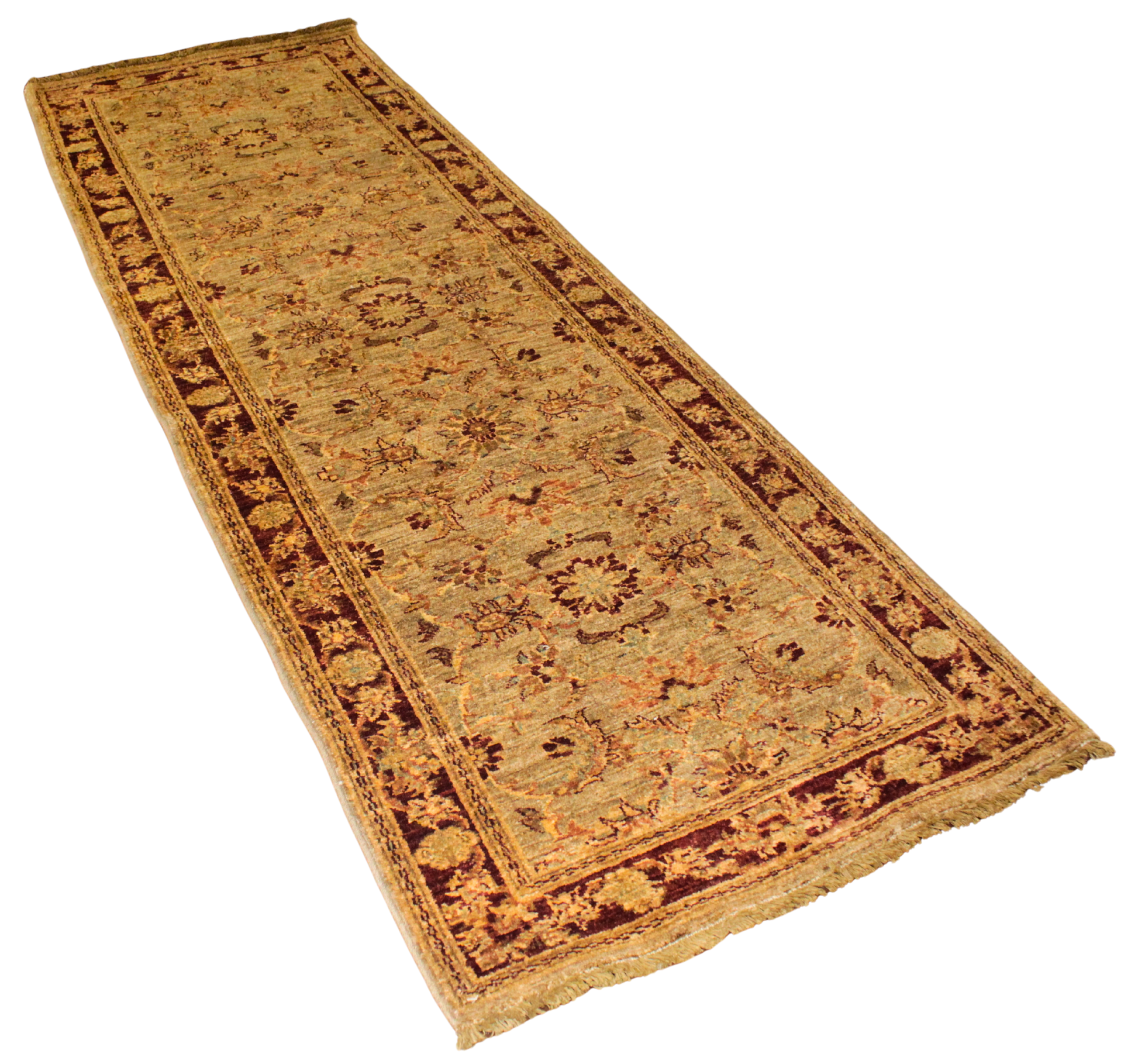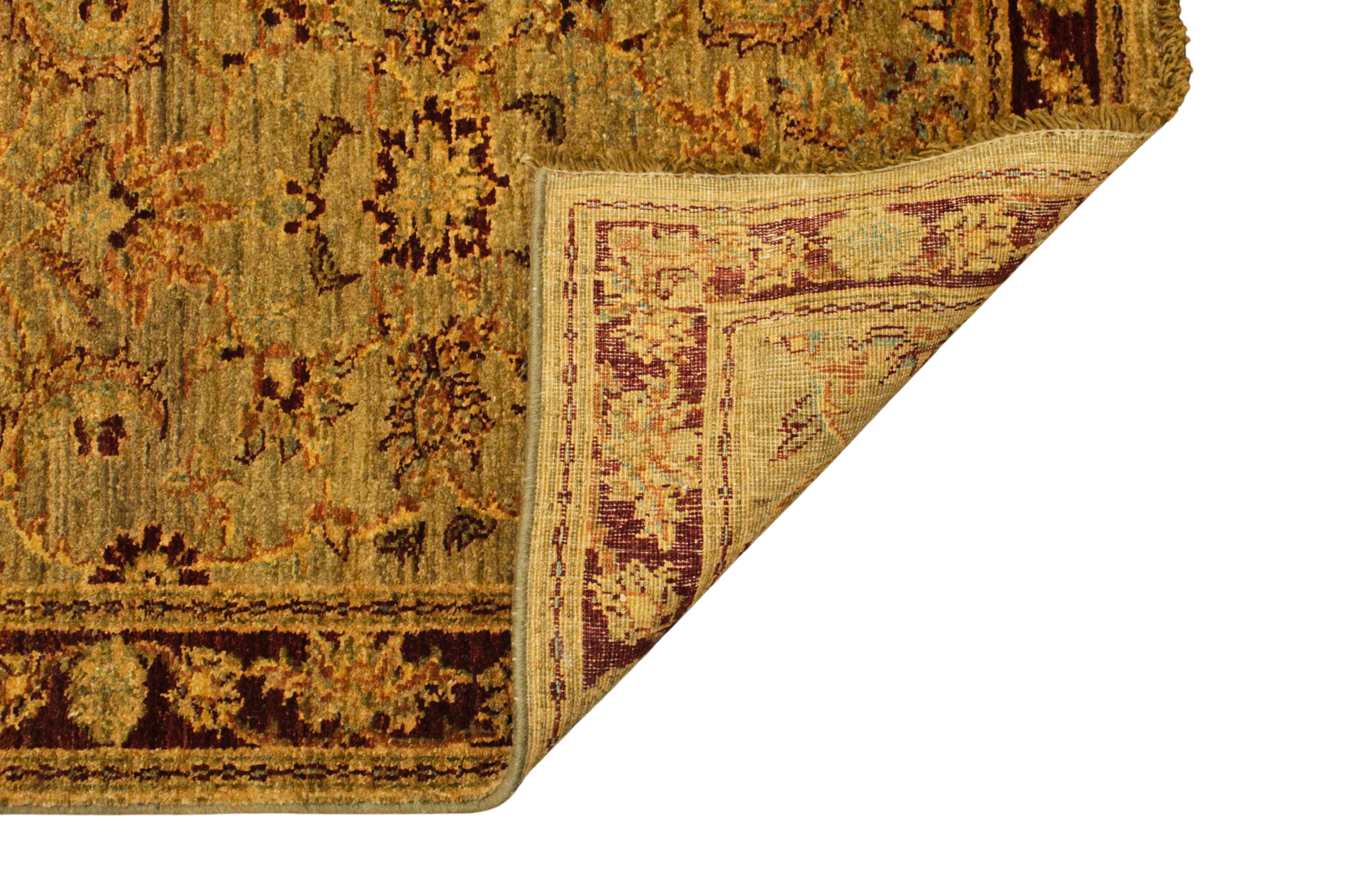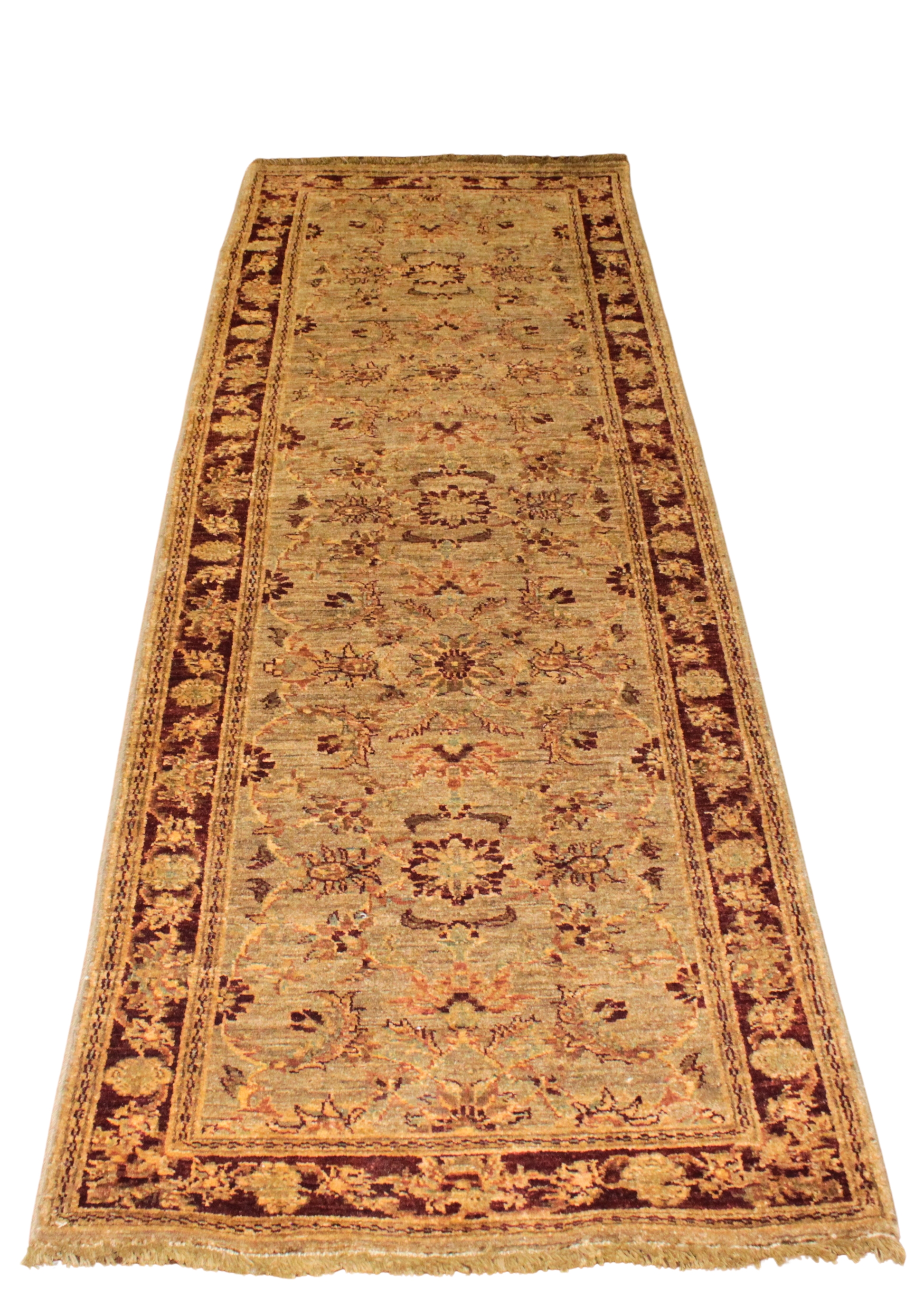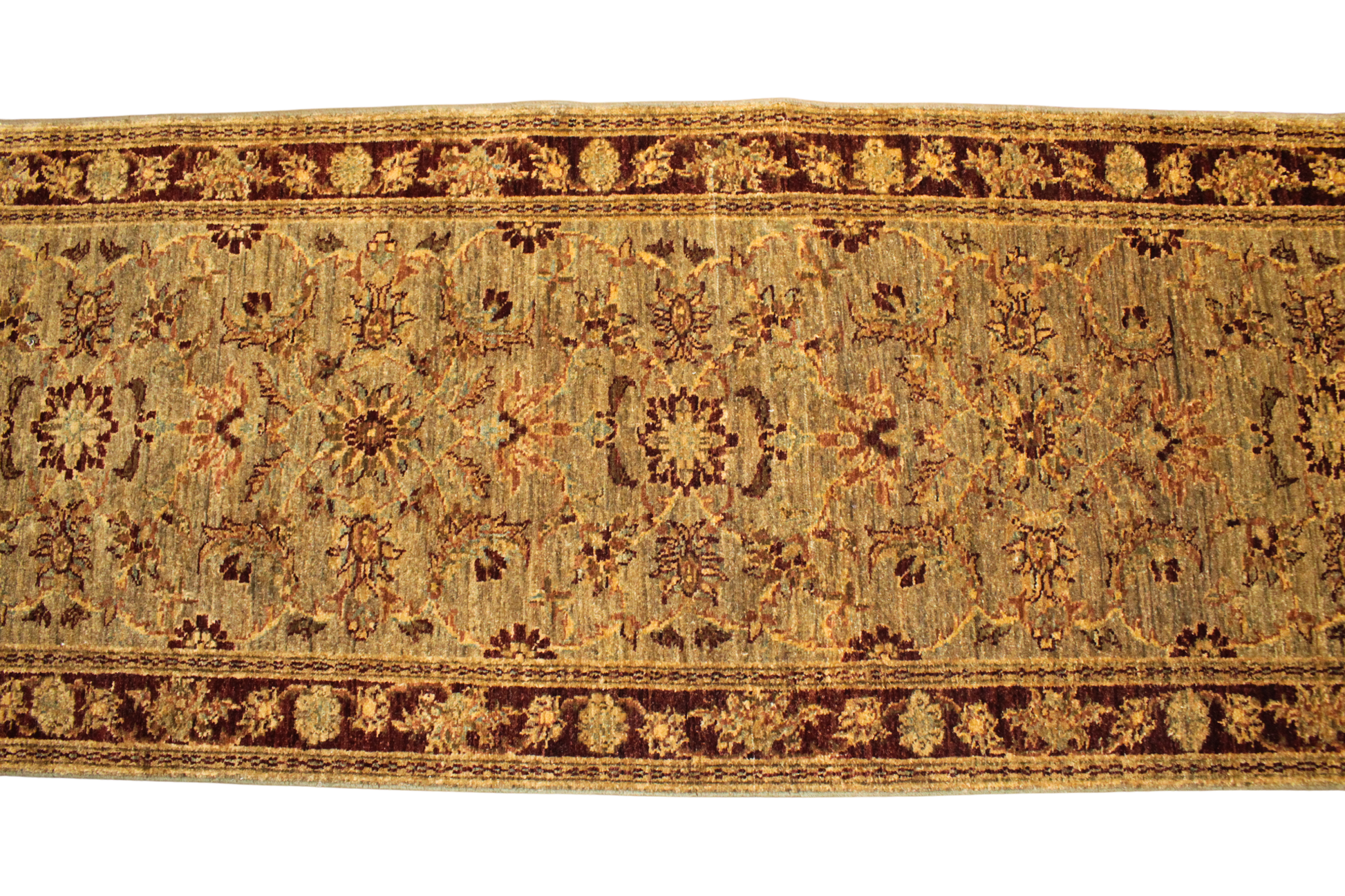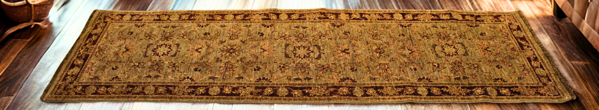 Subtle sophistication defines this elegant Pakistani Oushak runner, rendered in a gentle blend of sage, olive, and earthy tan. The all-over floral design is anchored by palmettes and rosettes, artfully arranged in a symmetrical flow. A deep terracotta-toned border dotted with stylized lotus blossoms gives it a grounded, vintage feel.