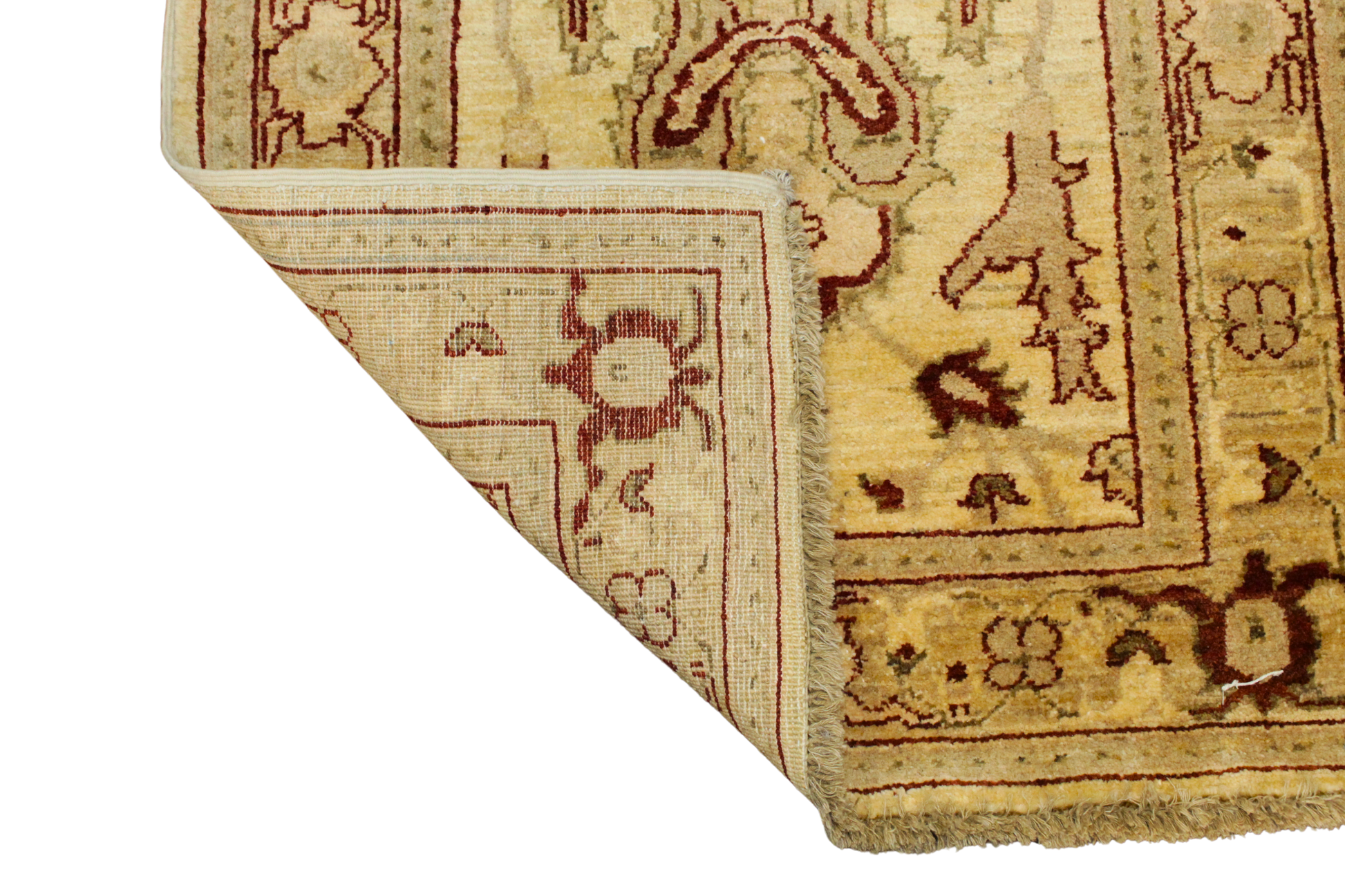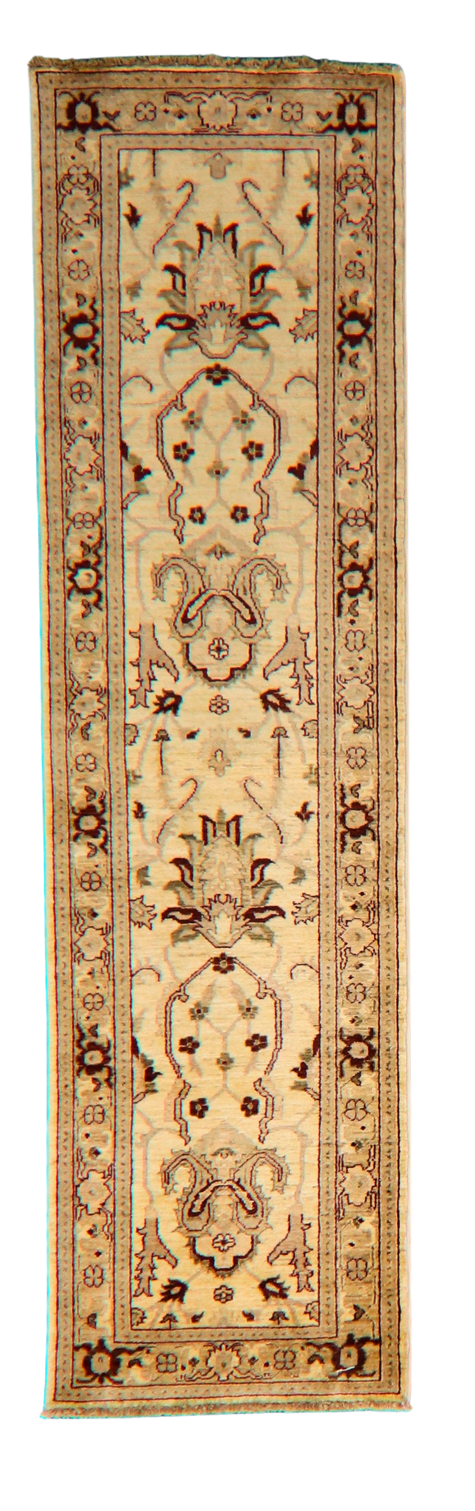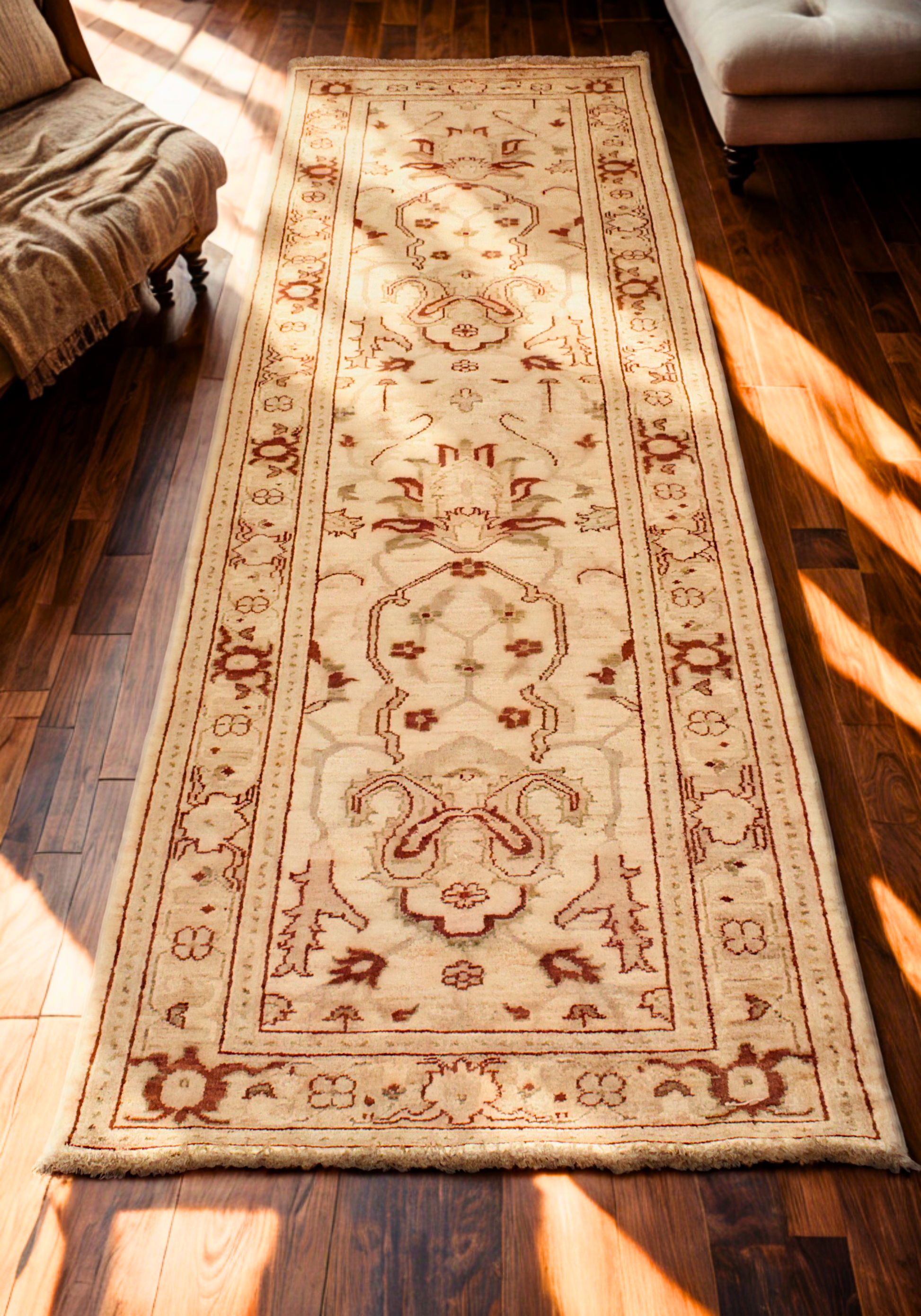 This refined Pakistani Oushak runner showcases an elegant play of soft ivory tones contrasted with warm mocha, olive, and rust accents. The large-scale floral motifs are gracefully flanked by vine-like structures, giving the rug a flowing, symmetrical rhythm. A lightly decorated border with stylized rosettes and blossoms adds a finished, regal frame.