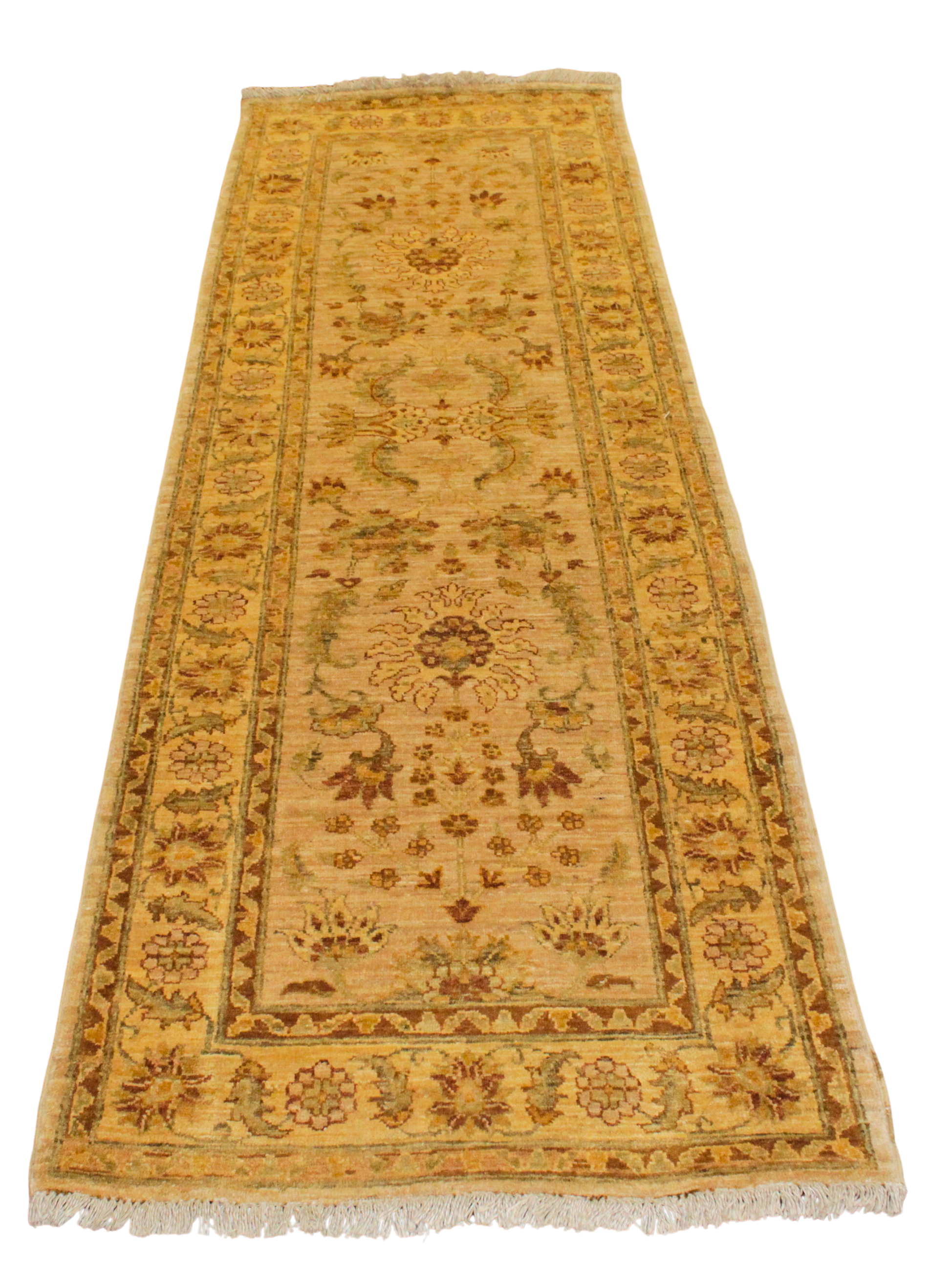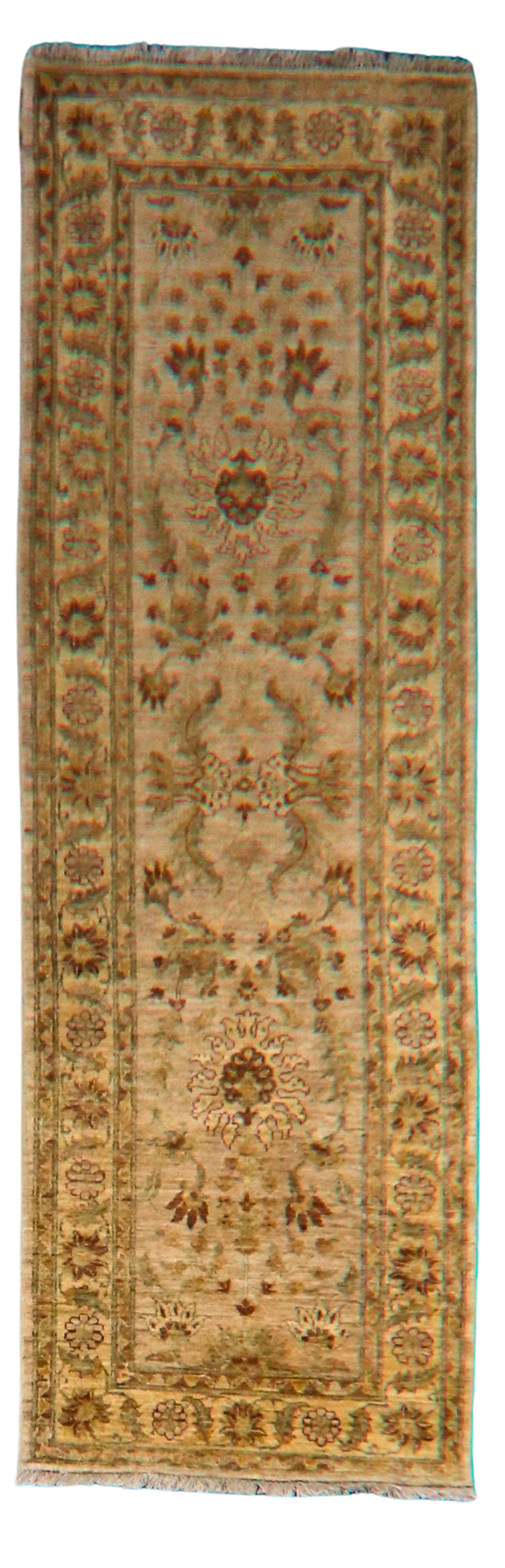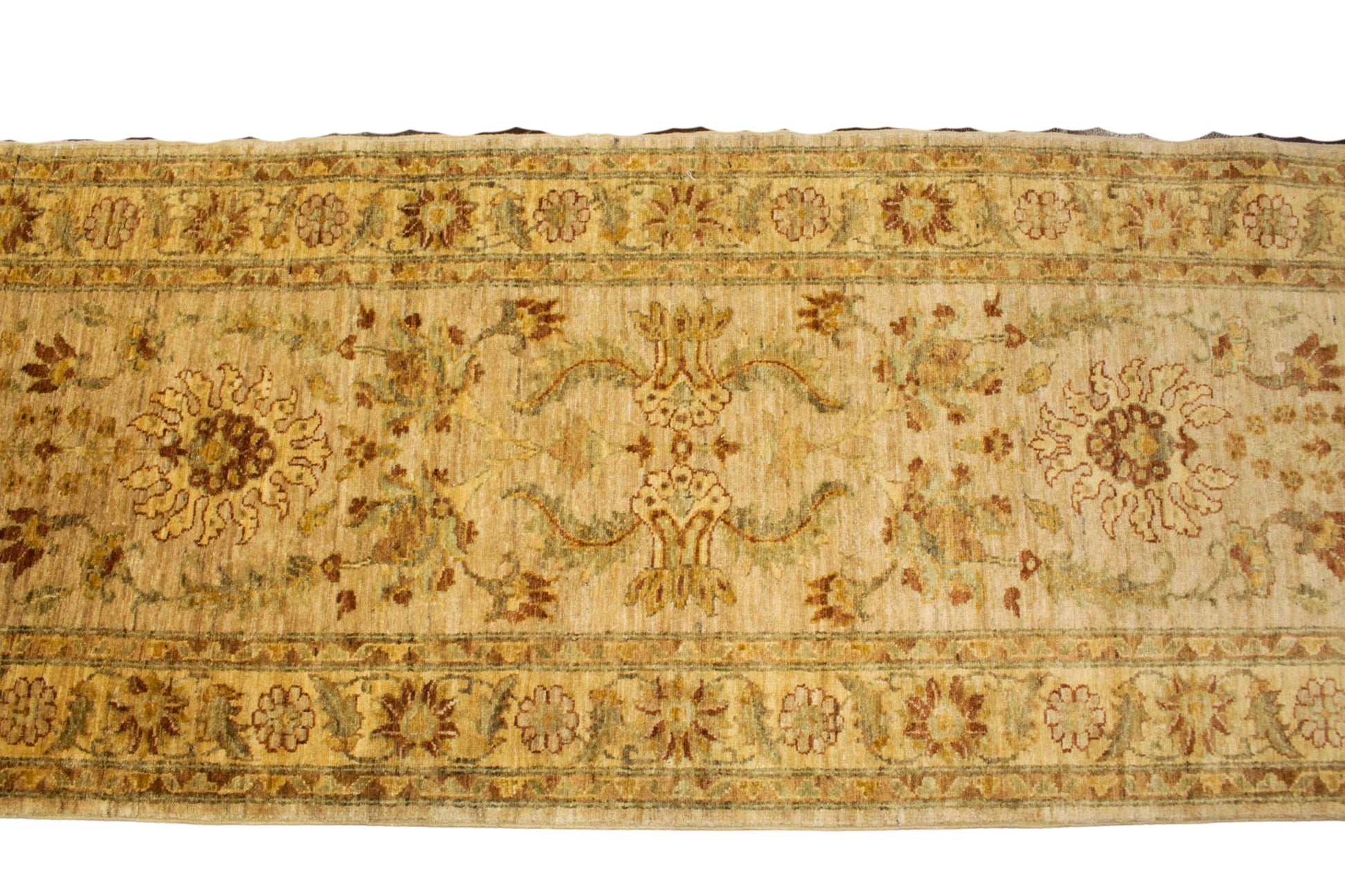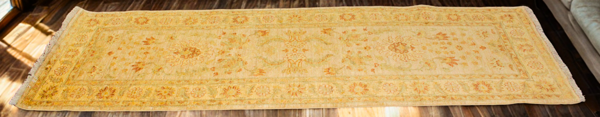 Warm and quietly sophisticated, this hand-knotted Oushak runner features a sunwashed palette of soft gold, beige, and muted terracotta. The central floral medallions are surrounded by delicately scrolling vines and palmettes, bordered by a frame of stylized rosettes. Its aged finish and tonal design give it a graceful, antique-like presence.