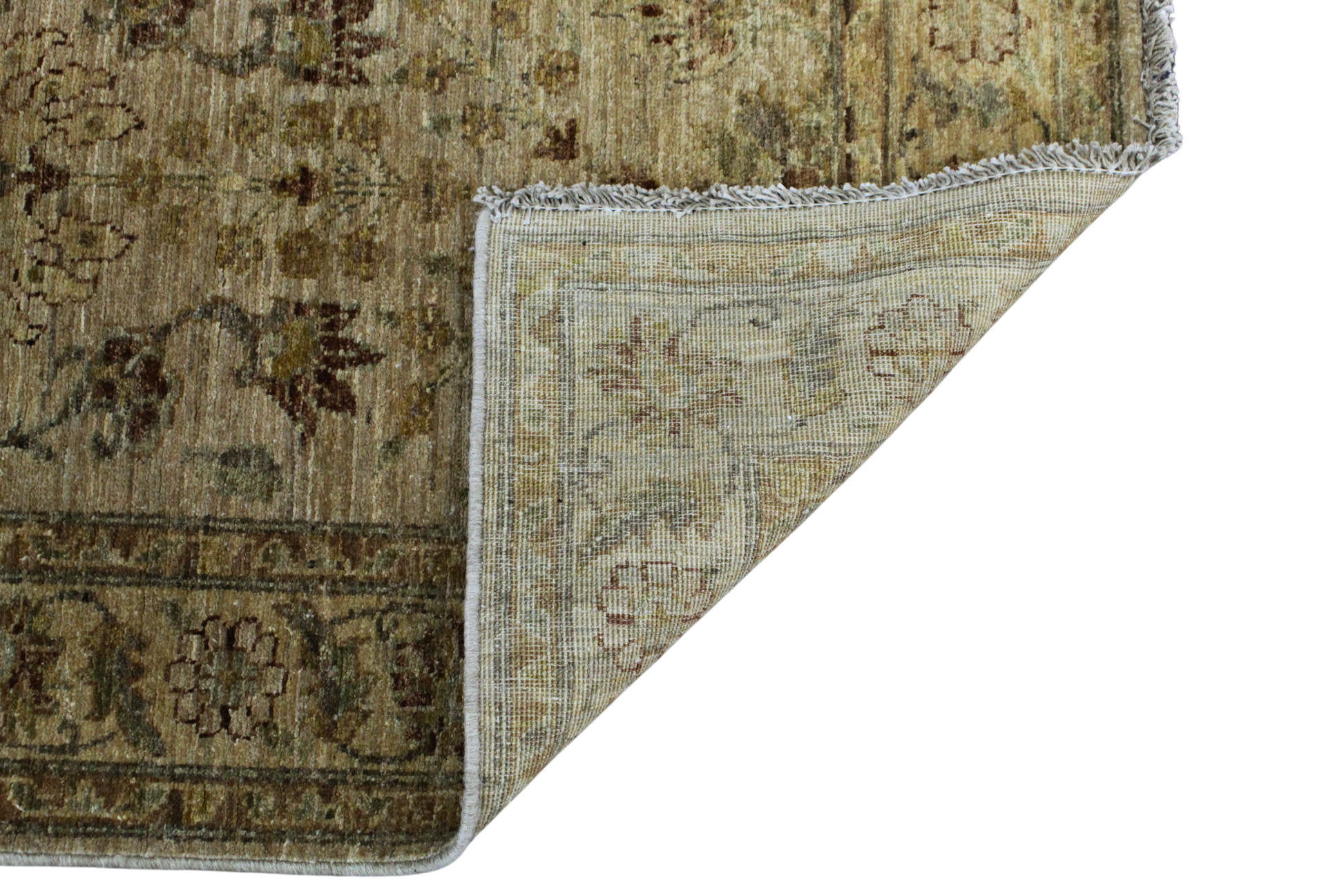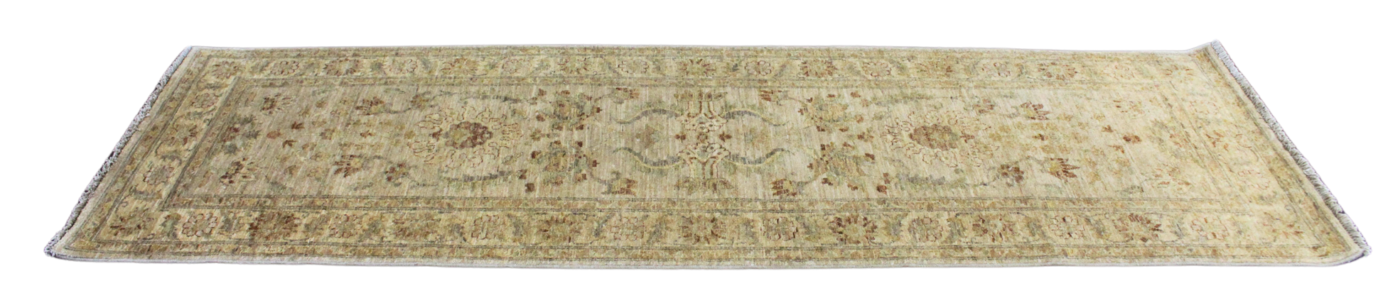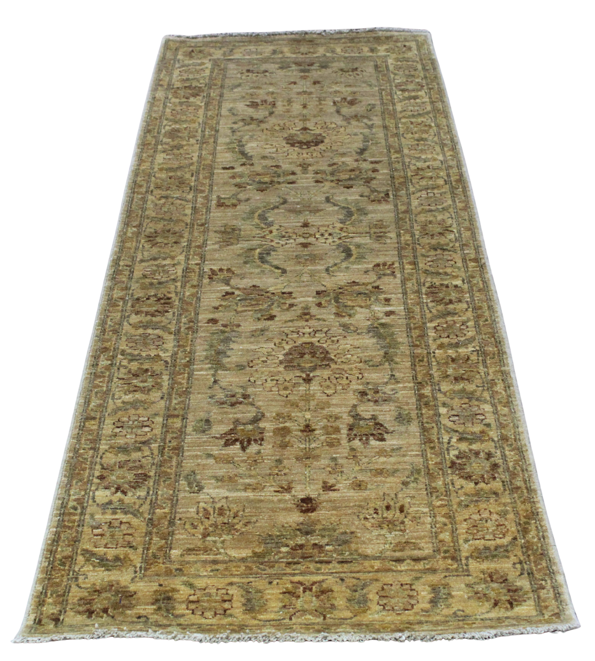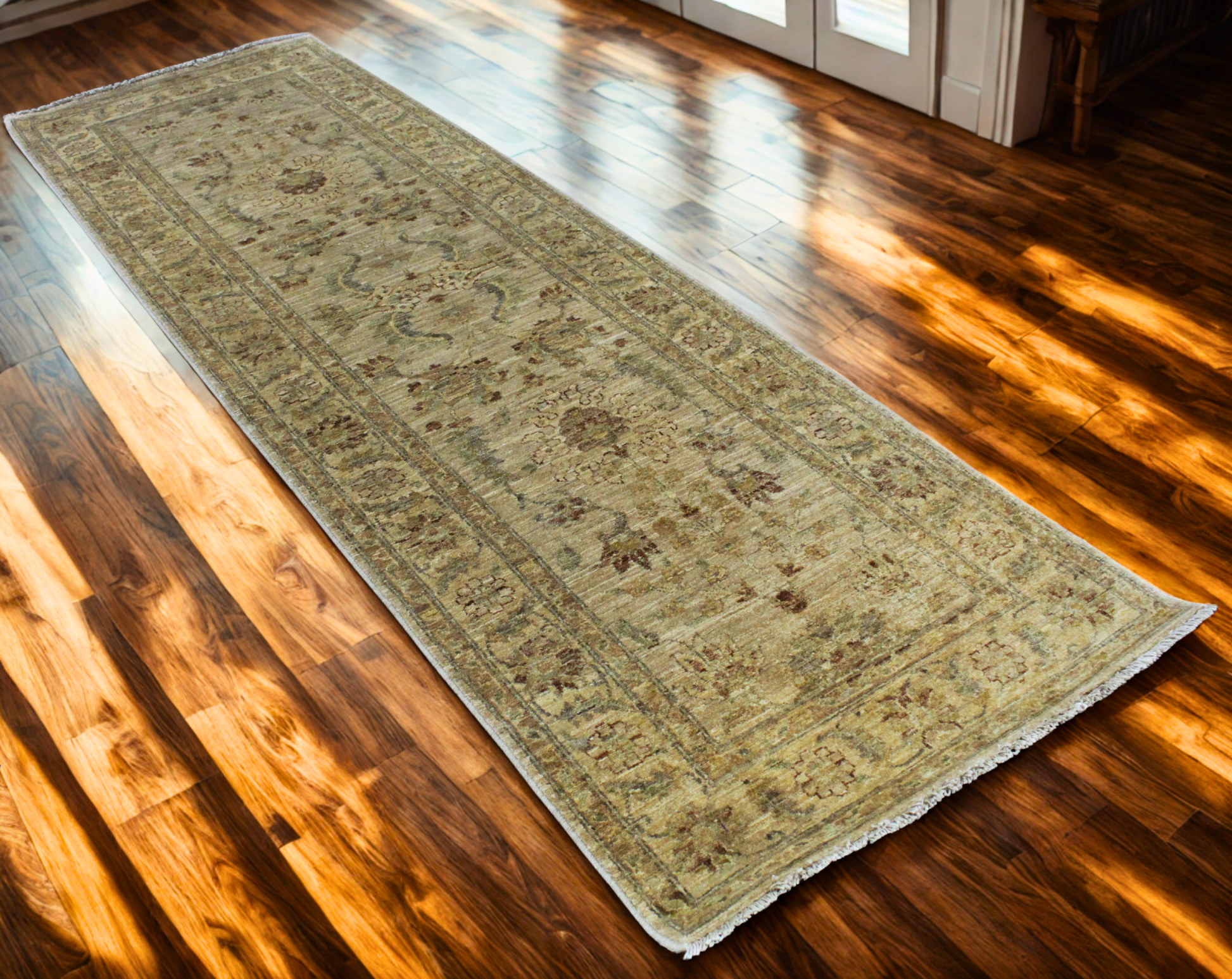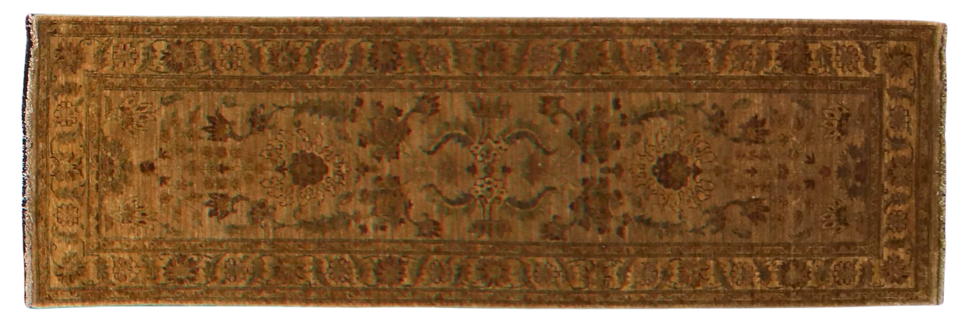 This Afghan Oushak runner delivers a grounded, sophisticated aesthetic with its richly muted palette and commanding design. The deep chocolate brown field is subtly layered with soft medallions and stylized floral motifs in tones of olive, terracotta, and camel, all arranged in a symmetrical, balanced composition. A classic border of rosettes and vinework completes the piece with a sense of timeless formality.