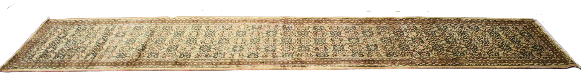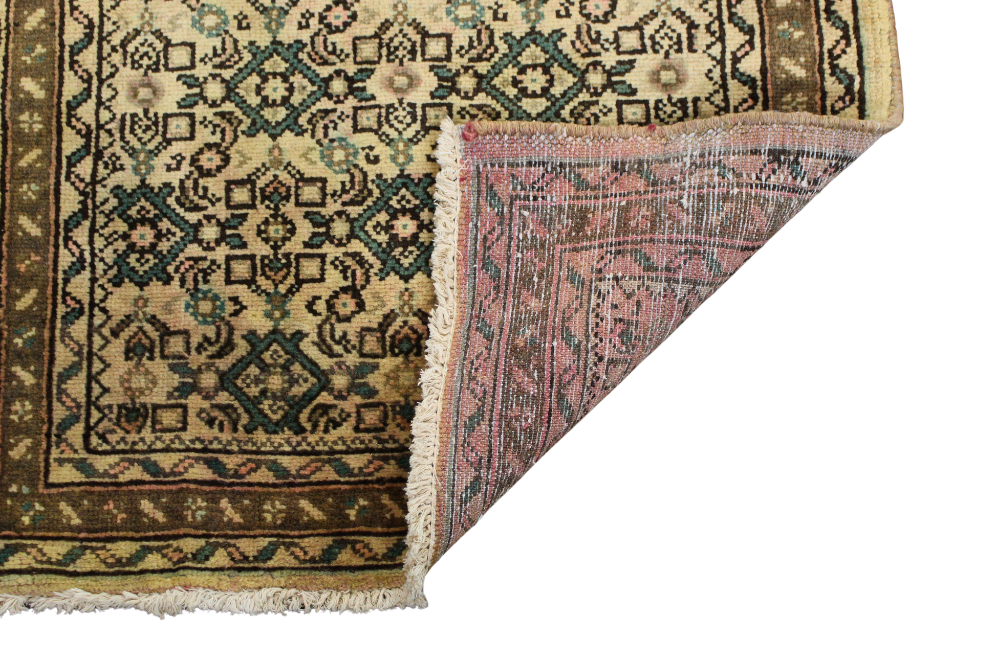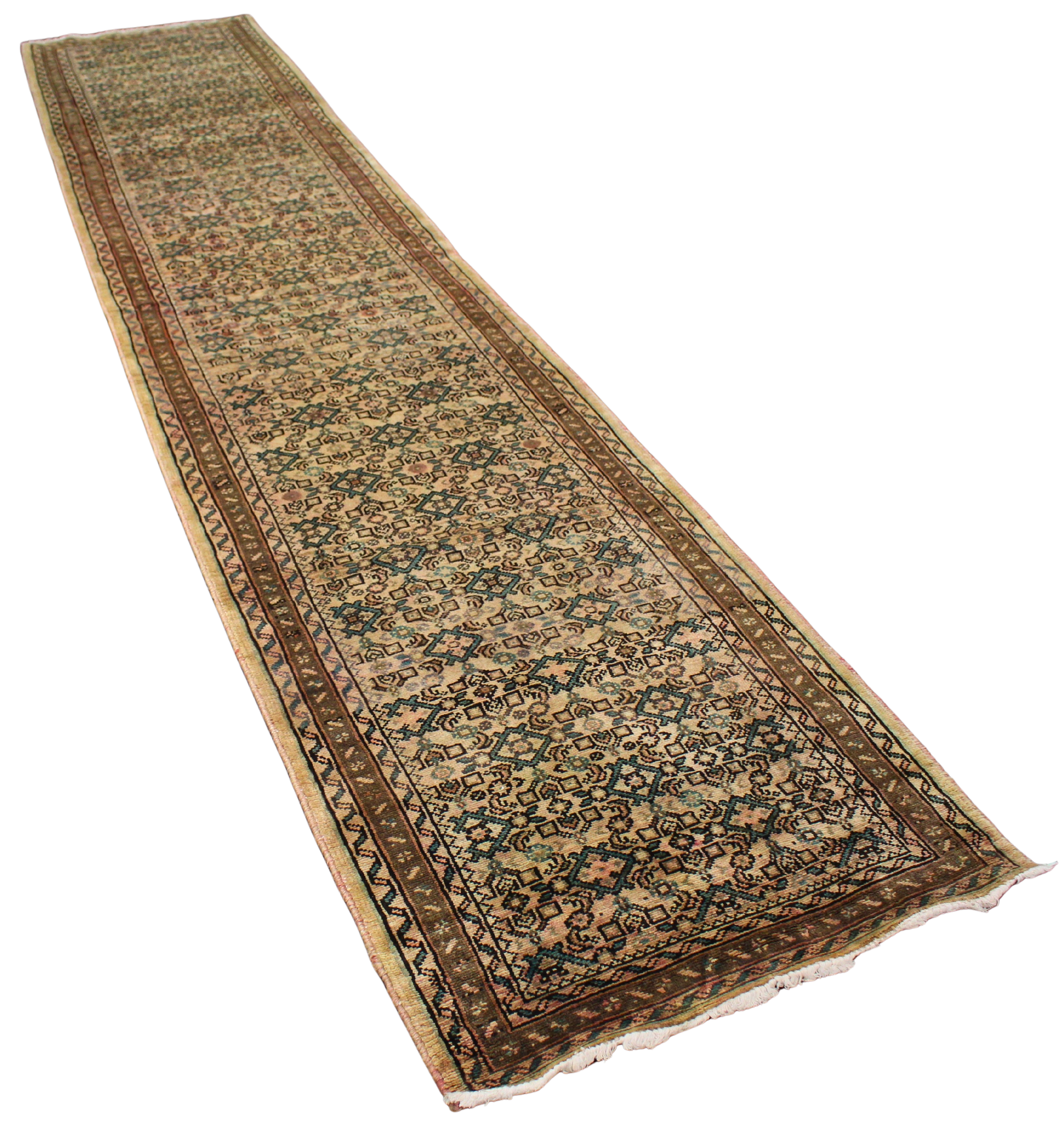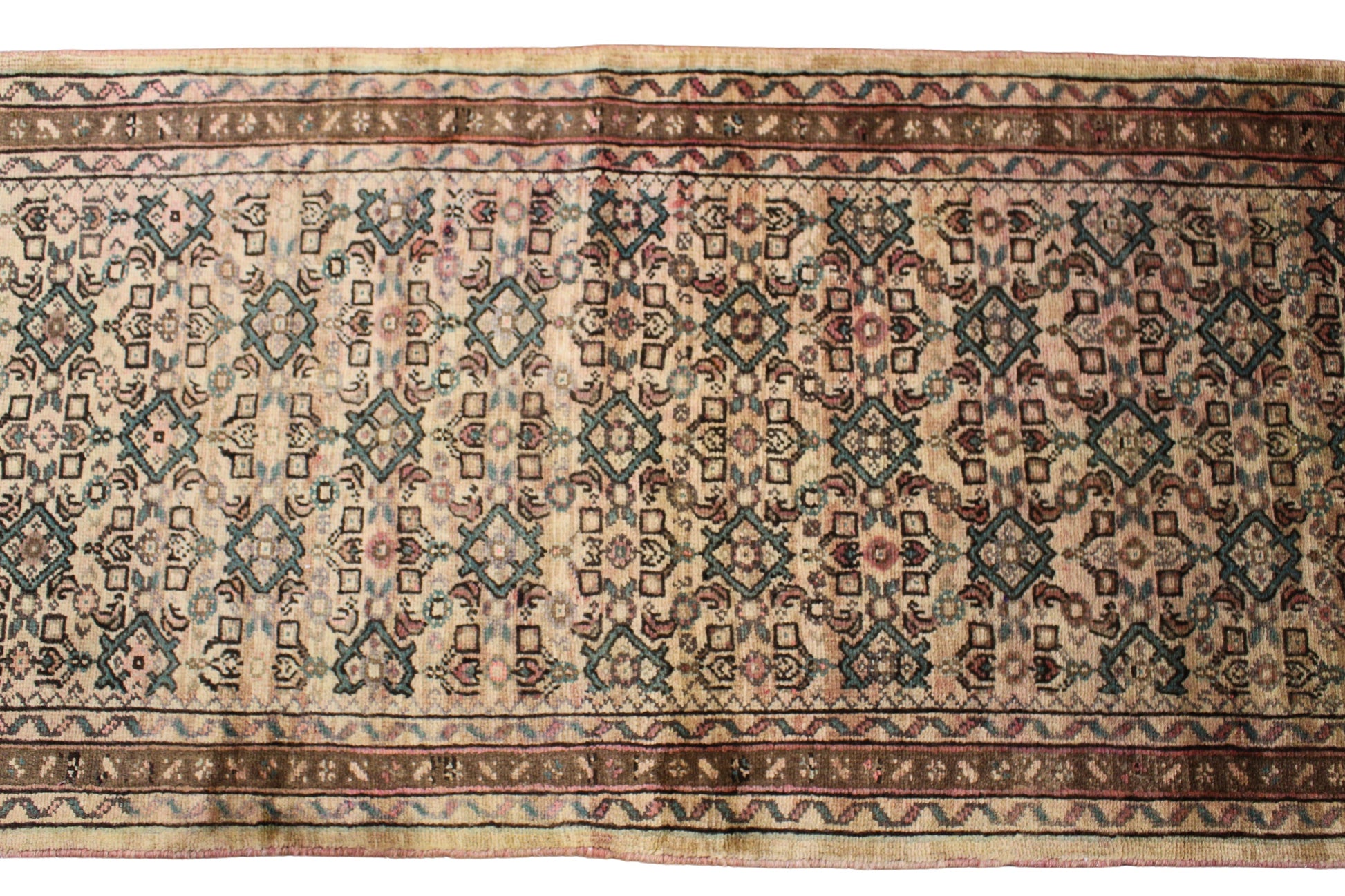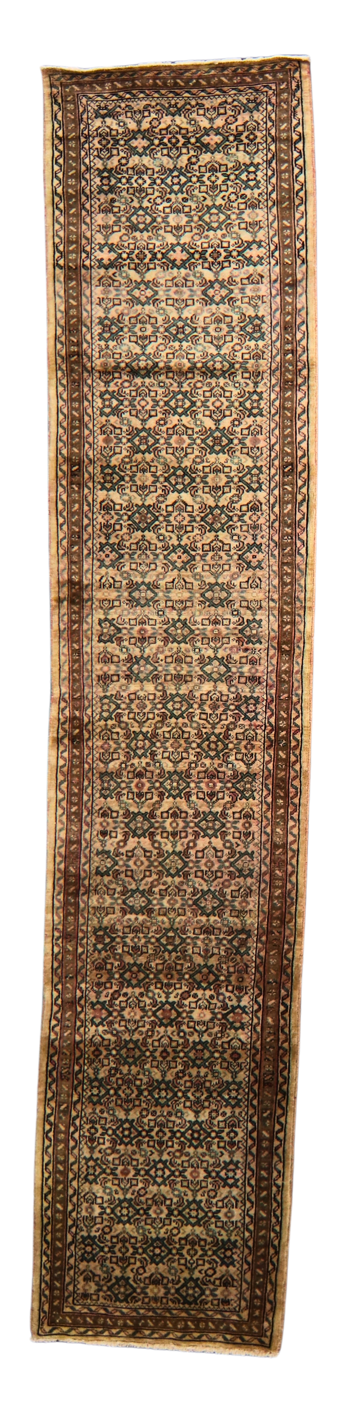 Understated elegance defines this antique Persian Hamedan runner (2.9 × 13 ft), where an intricate matrix of geometric medallions repeats with quiet rhythm across a softly aged ivory-tan field. Woven with precision and purpose, the motif structure reflects the tribal influences of Hamedan weavers, who often blend linear order with rich symbolic patterning.