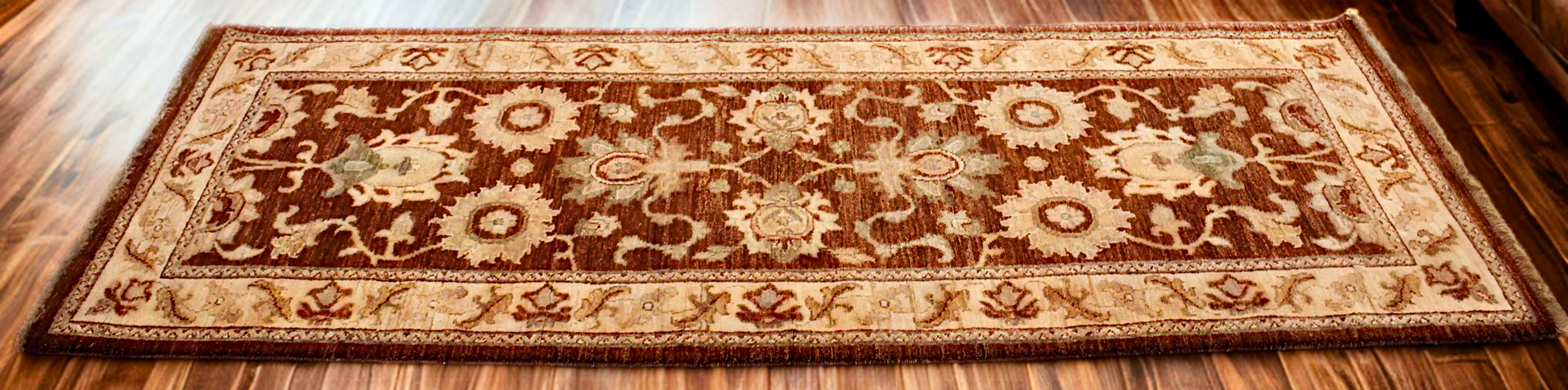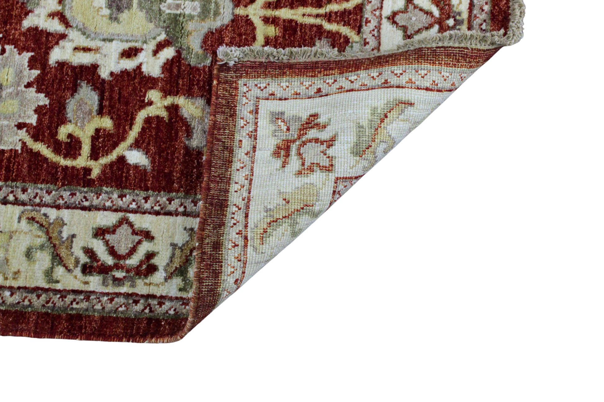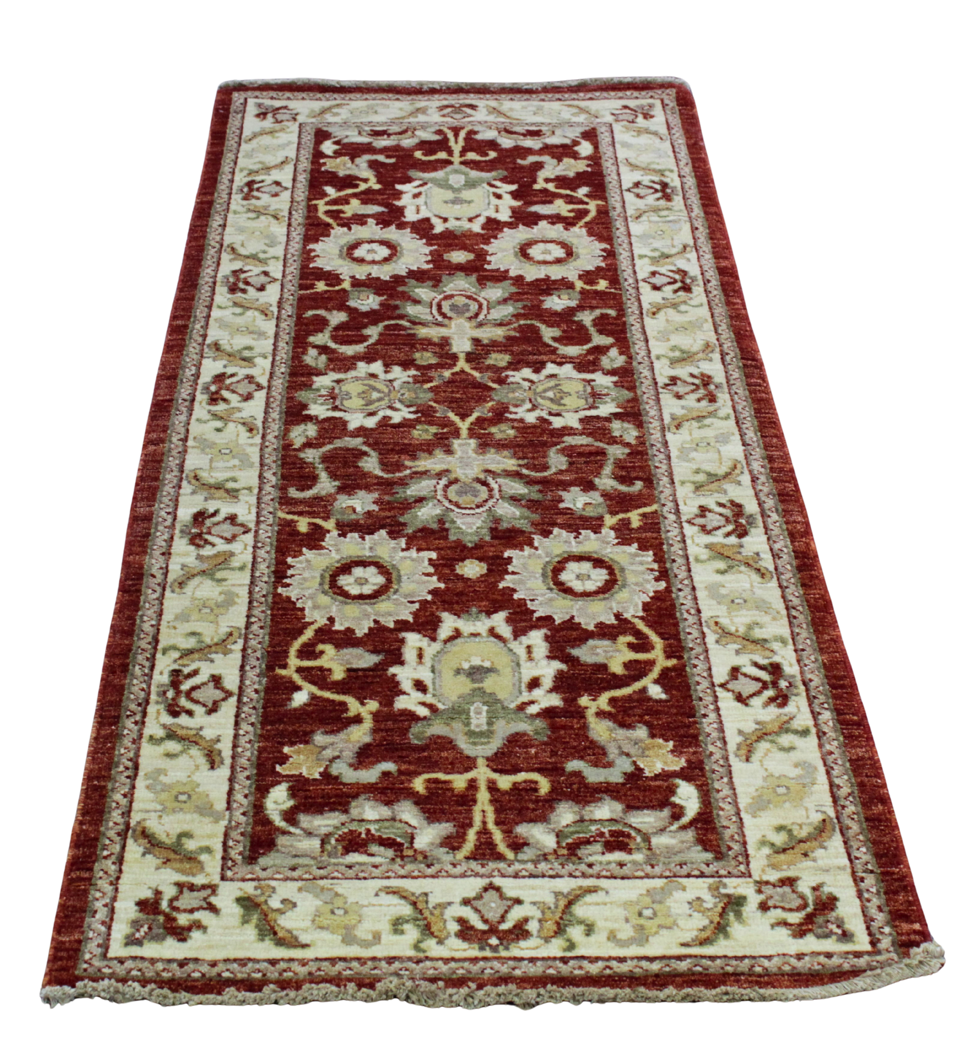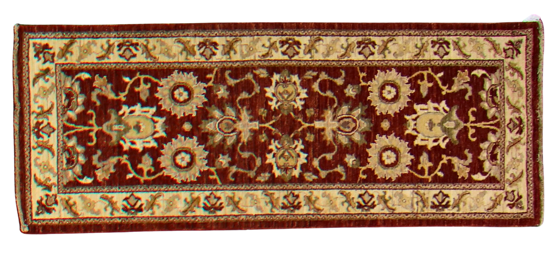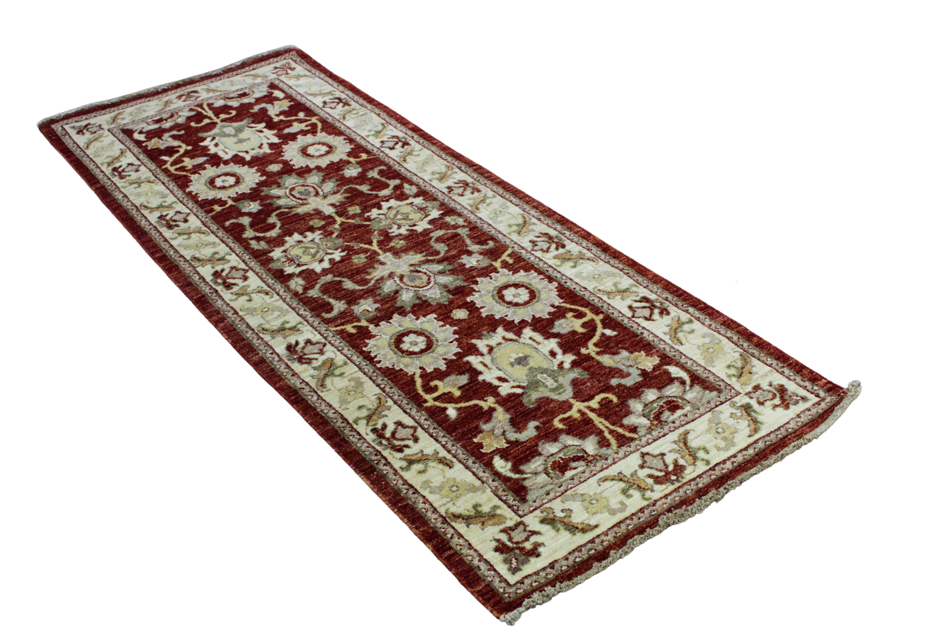 Bold yet classic, this richly colored Oushak runner from Pakistan makes an immediate impact with its deep crimson field and luminous floral medallions. Cream and soft gold motifs radiate with symmetry across the vibrant red background, accented by a traditional border of scrolling vines and floral rosettes. The strong color contrast gives the piece a regal presence while remaining grounded in traditional design.