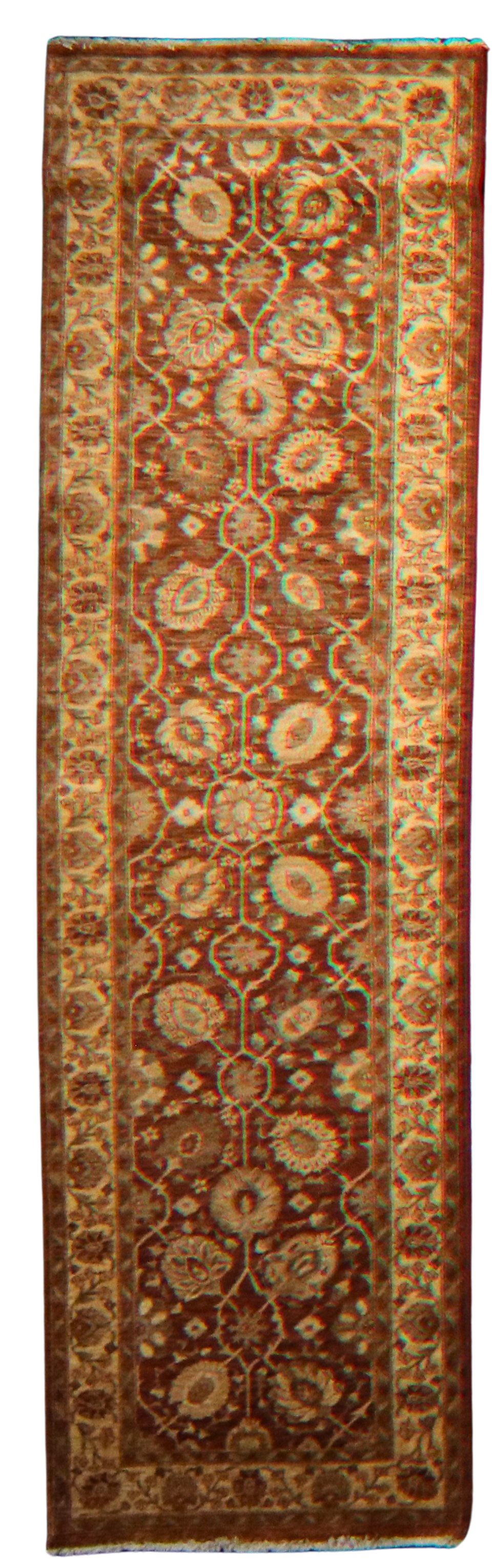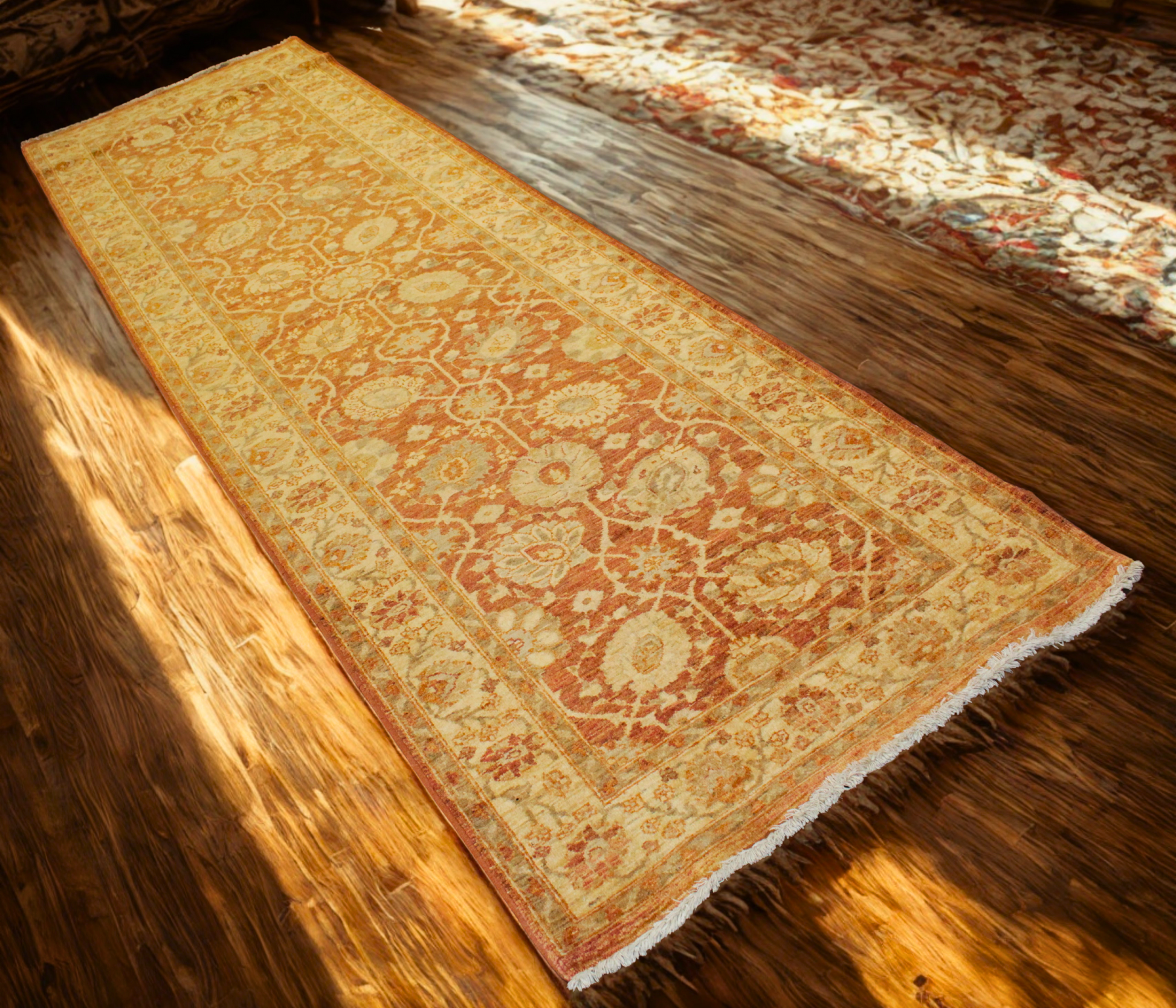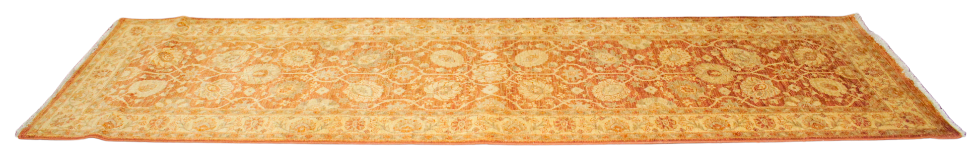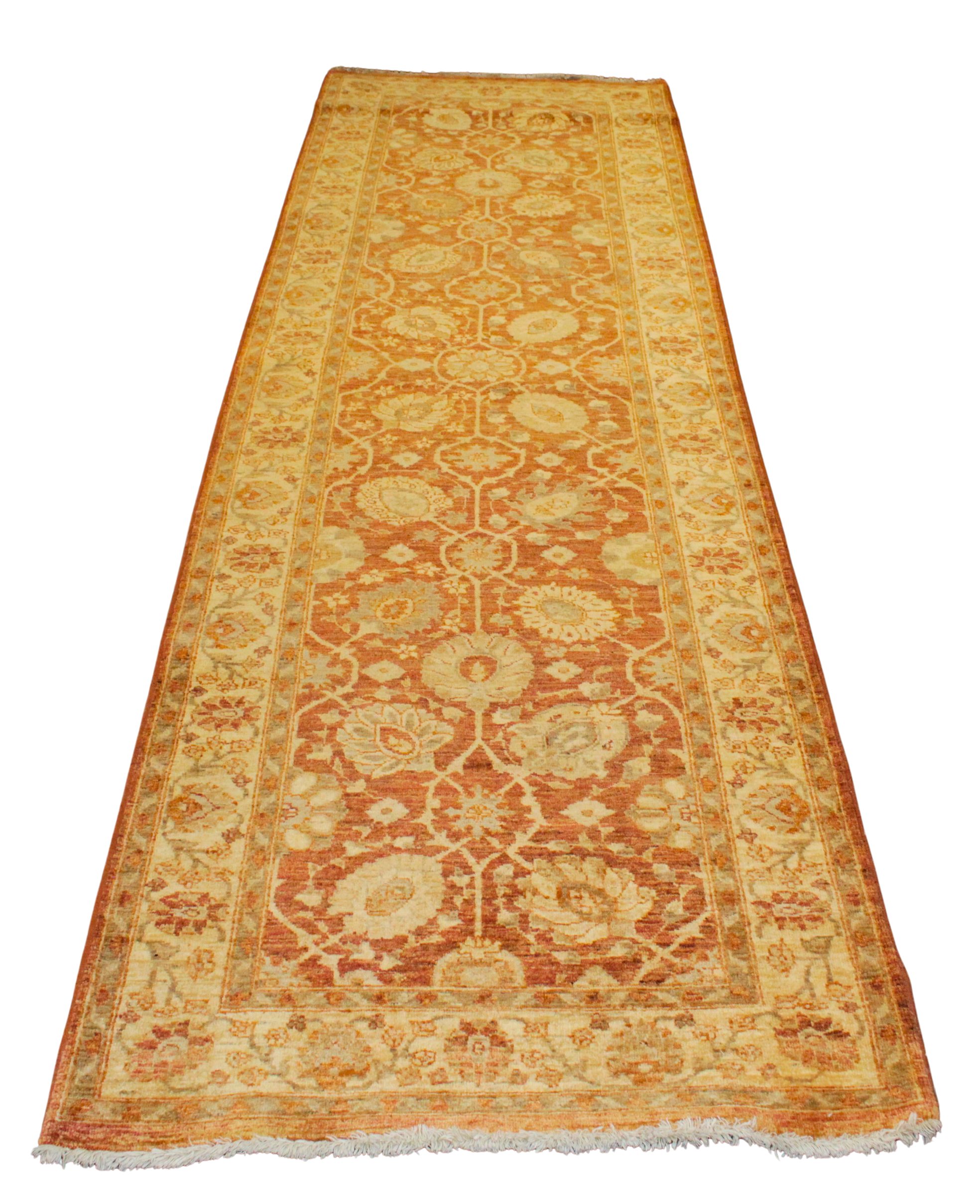 Warm, earthy, and intricate, this elegant Oushak runner from Pakistan showcases a stunning rust-red field adorned with a winding lattice of floral medallions and palmettes. The rhythmic vinework and open, botanical motifs lend the rug a refined sense of balance and grace, while the soft gold and ivory border adds a glowing contrast that frames the design beautifully.