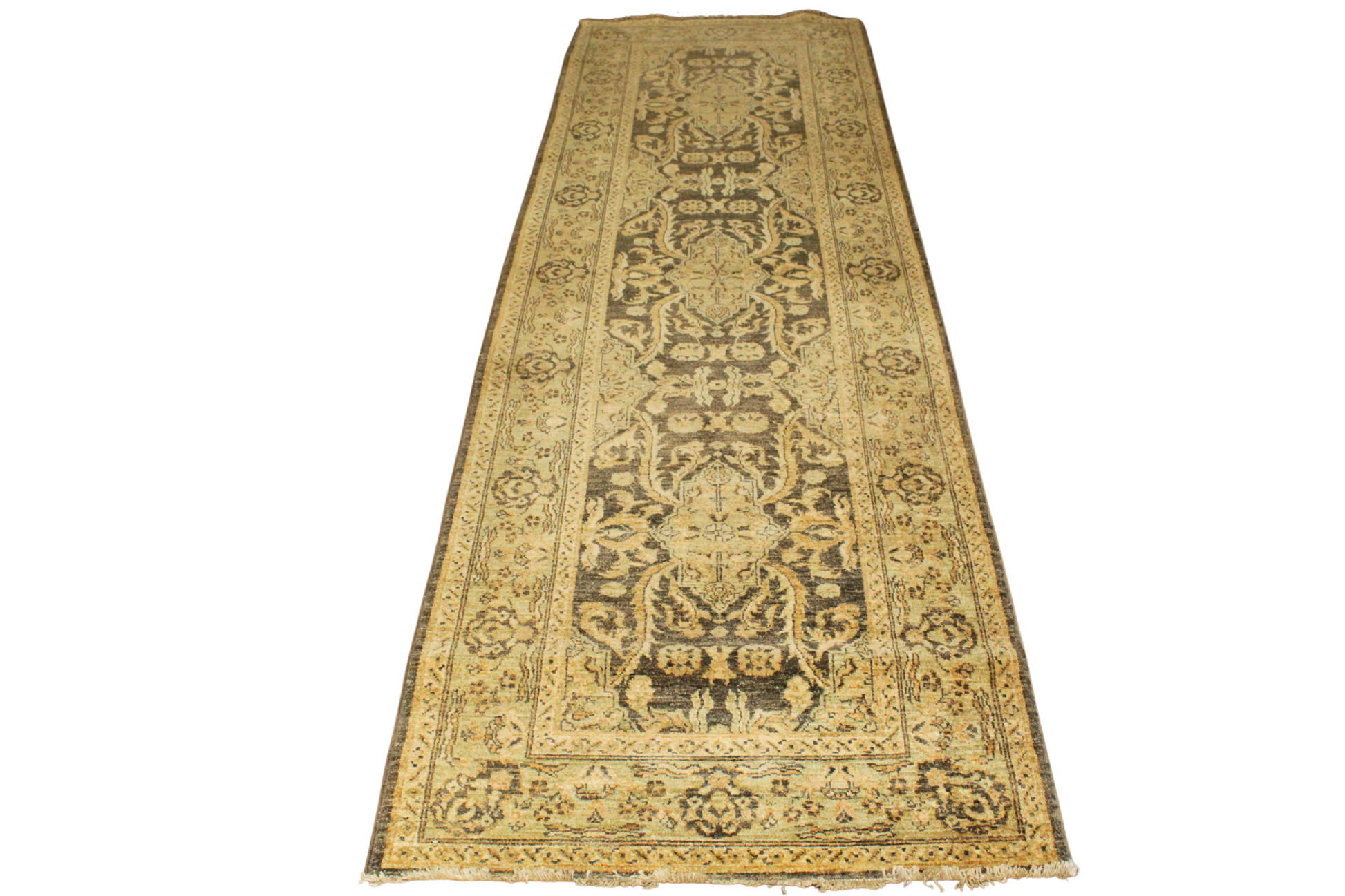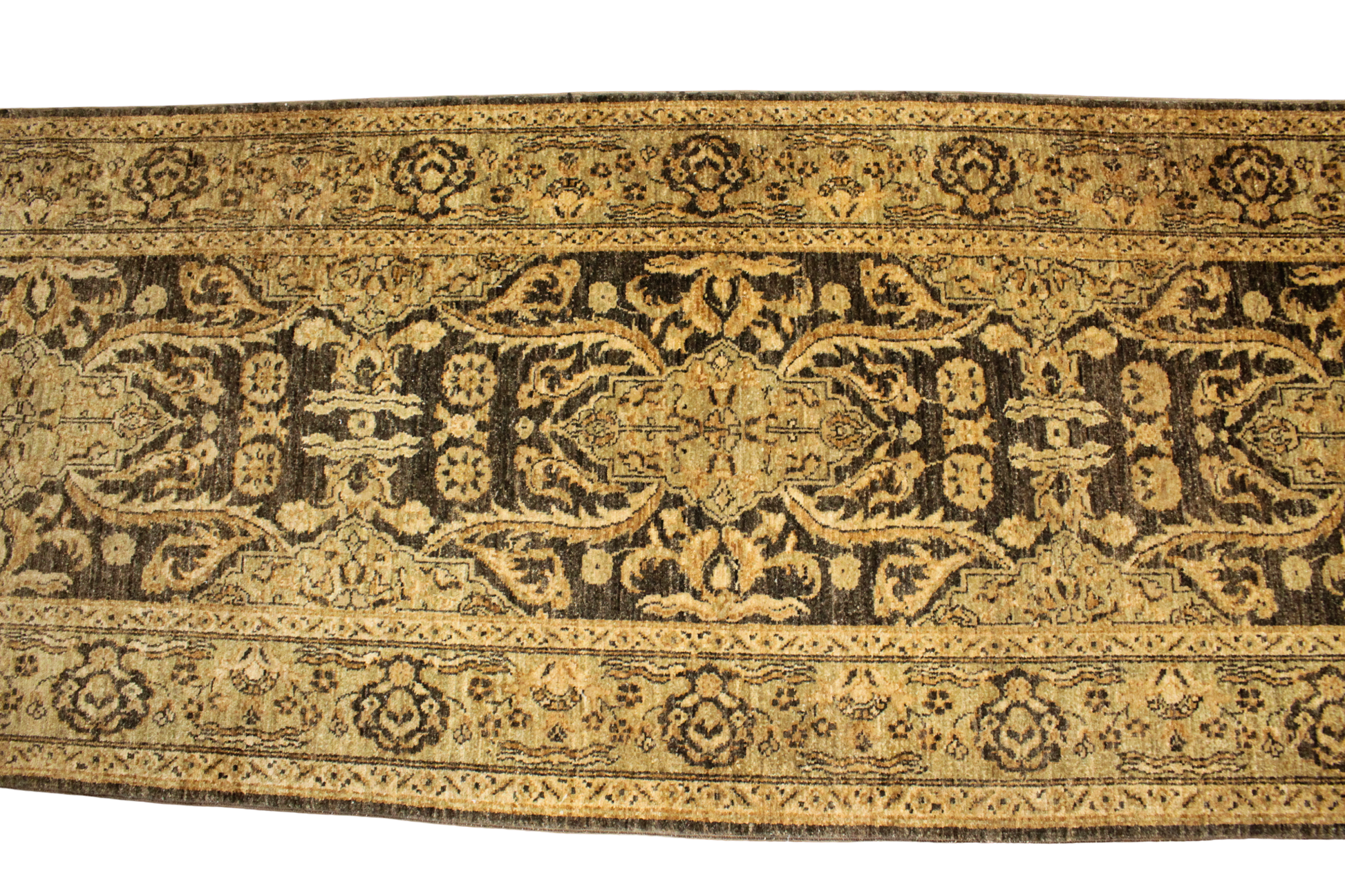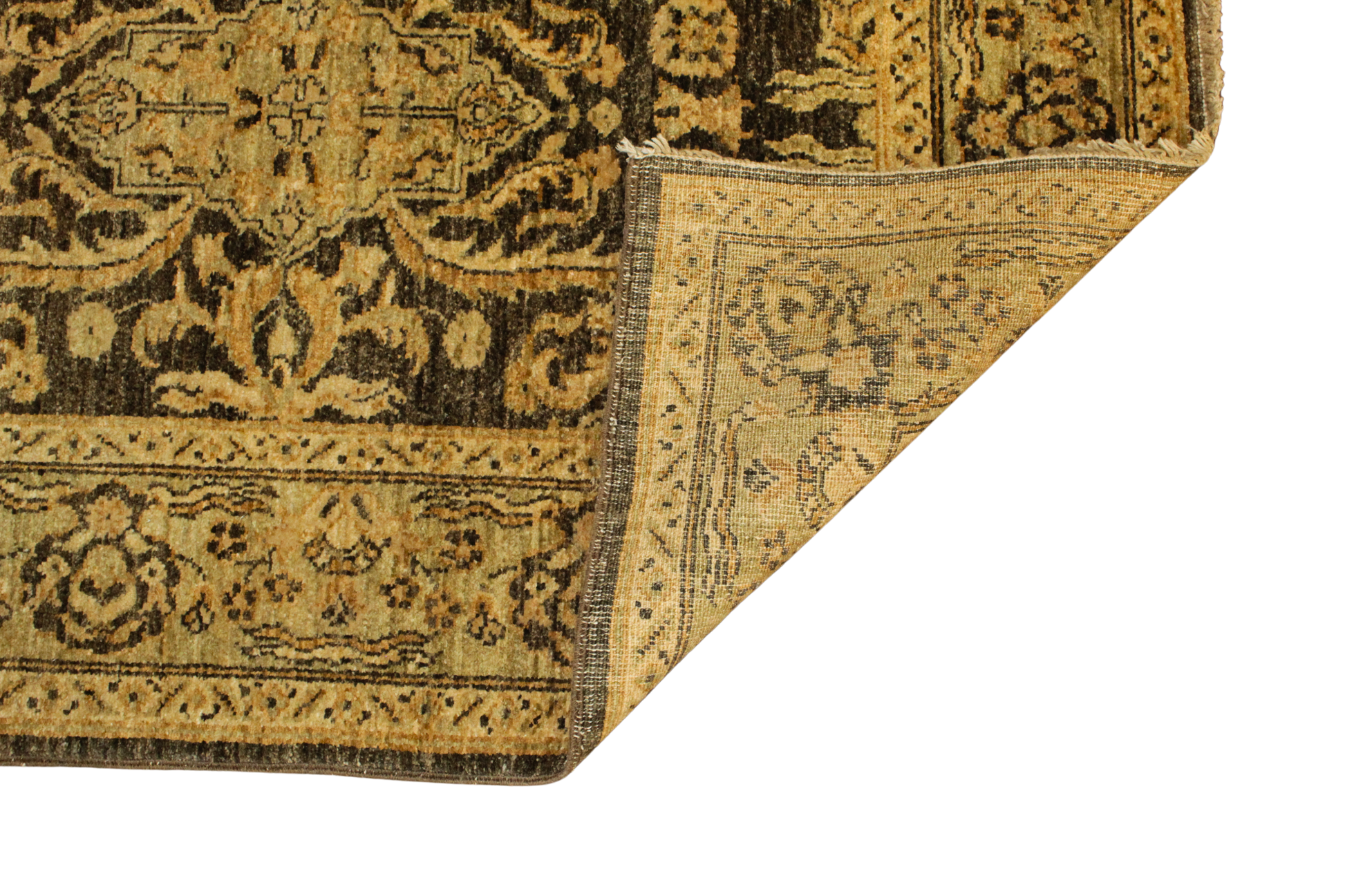 Bold and architectural, this striking Oushak runner from Pakistan features a rare deep espresso-brown field contrasted with symmetrical geometric motifs in olive, ivory, and muted gold. The interplay between angular floral medallions and structured palmette forms gives the rug a regal and grounded presence, while the floral border adds just the right amount of softness to the composition.