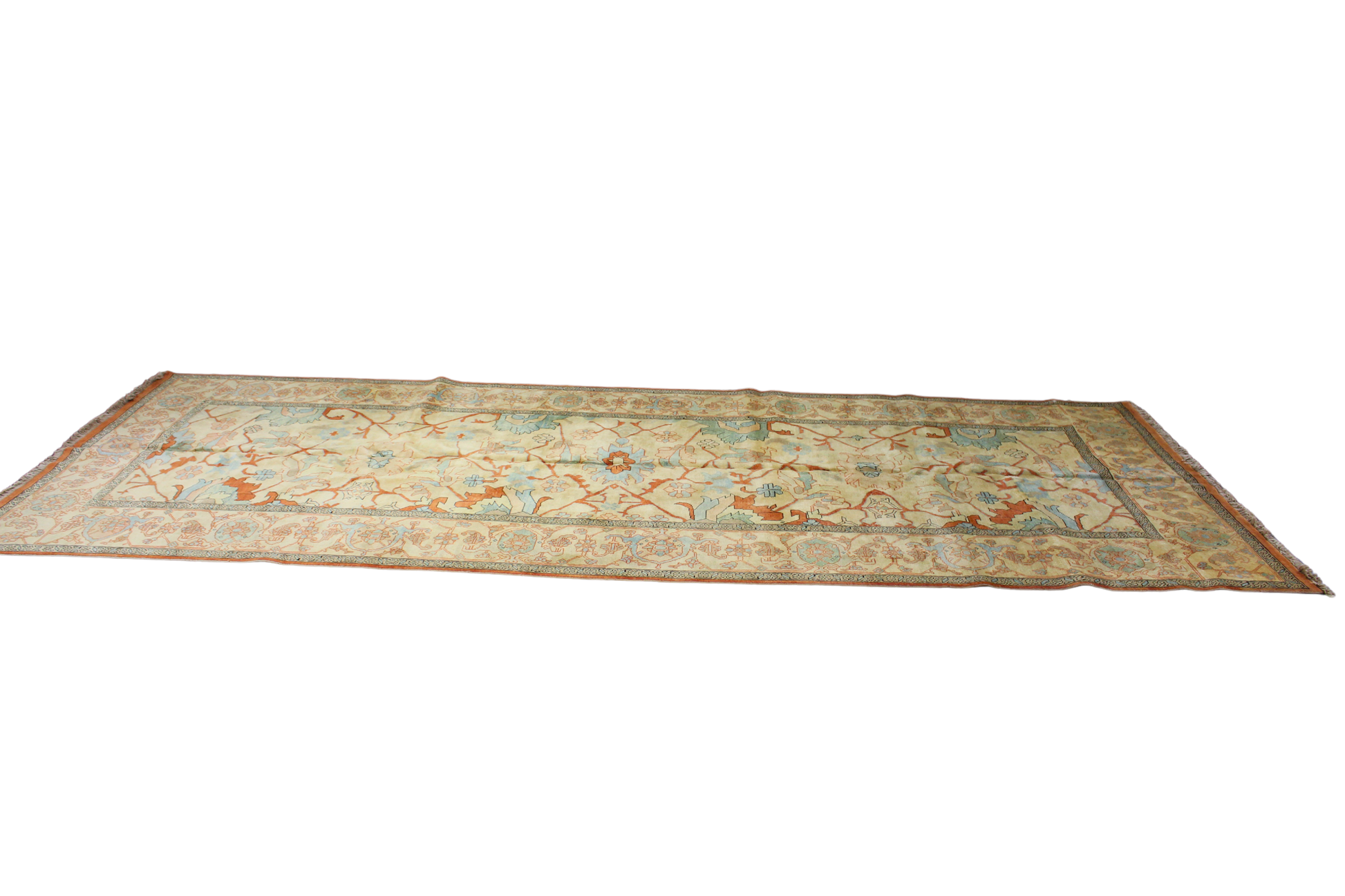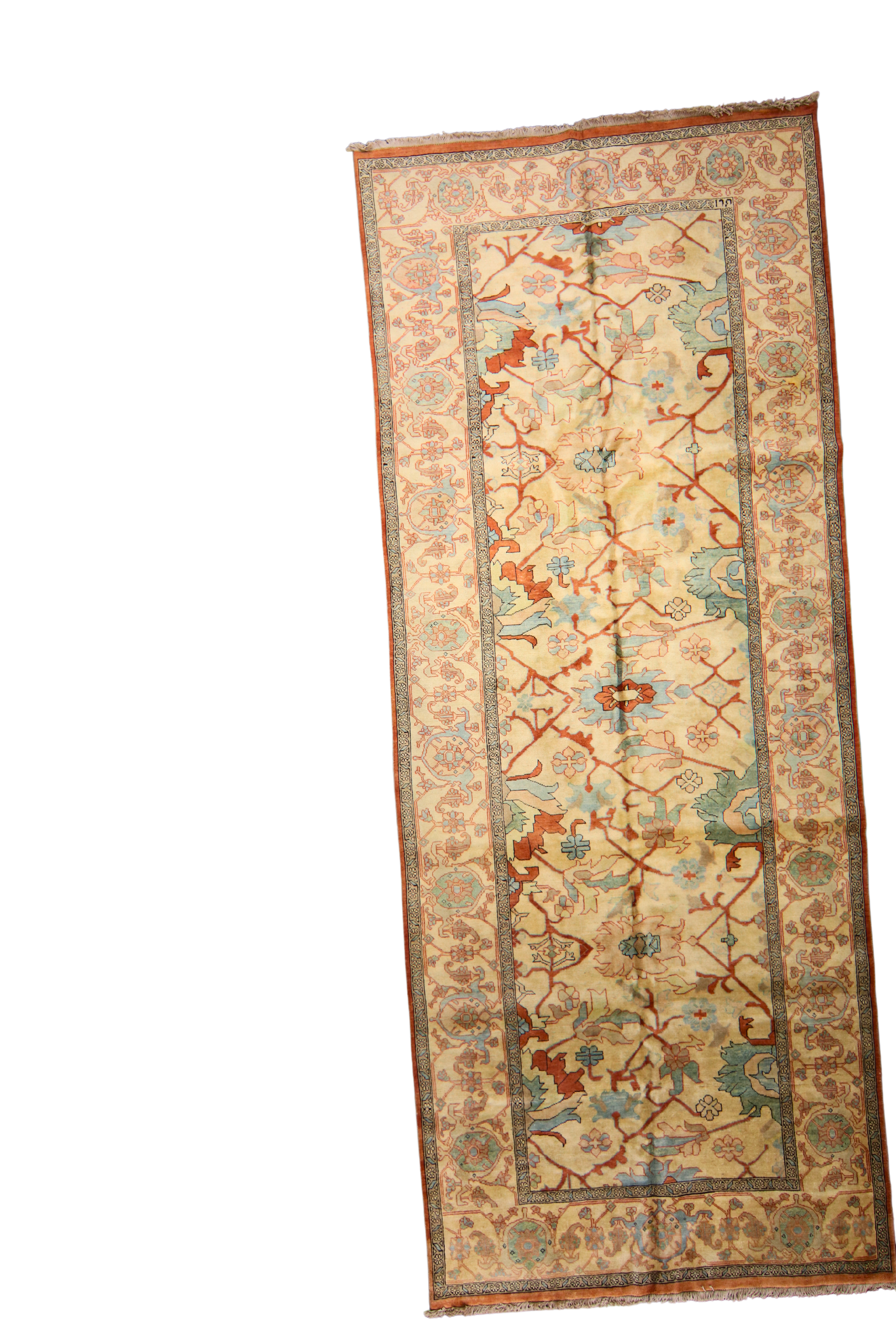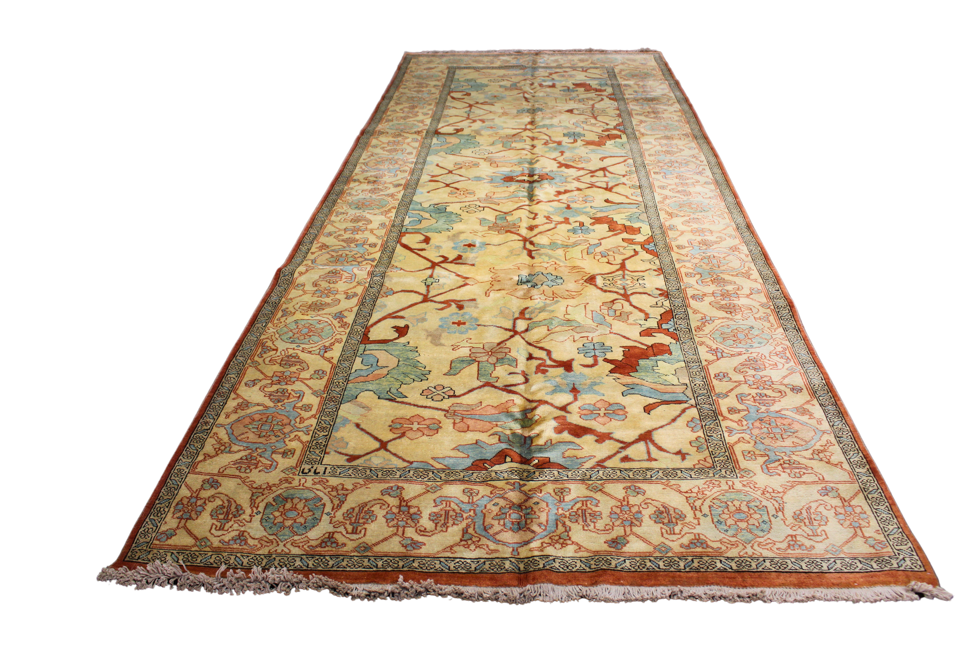 The spacious ivory ground allows the angular motifs to breathe, while the scrolling botanical border offers a striking contrast, tying the composition together with rhythmic movement. At over sixteen feet in length, this substantial runner makes an impressive statement in grand entryways, long corridors, or open transitional spaces, pairing antique authenticity with timeless design.