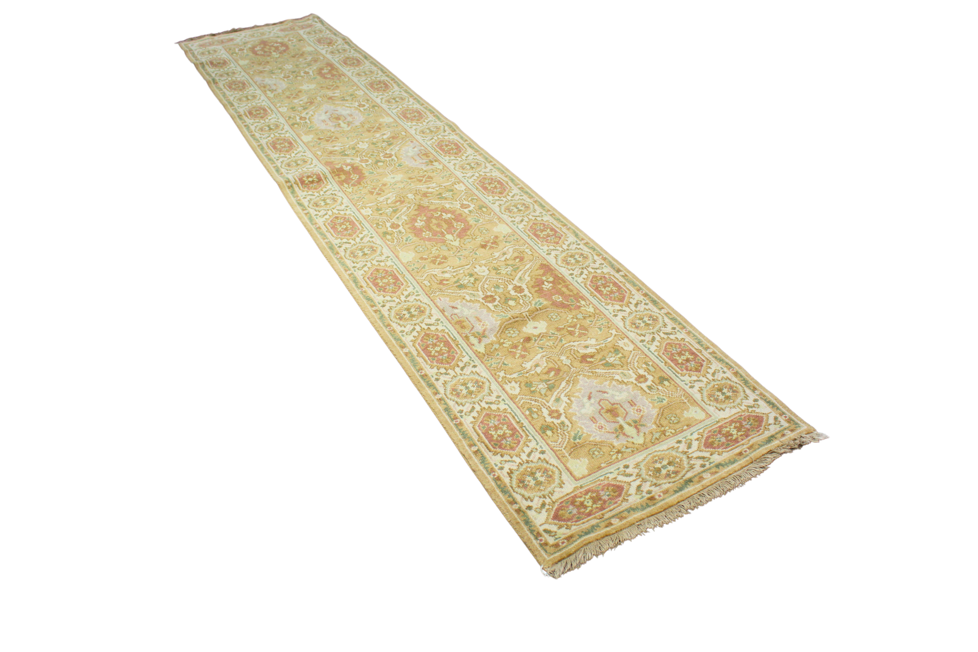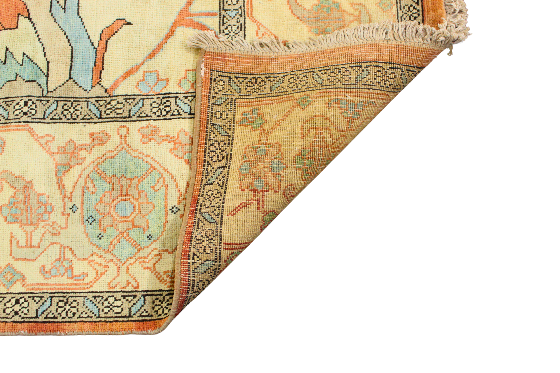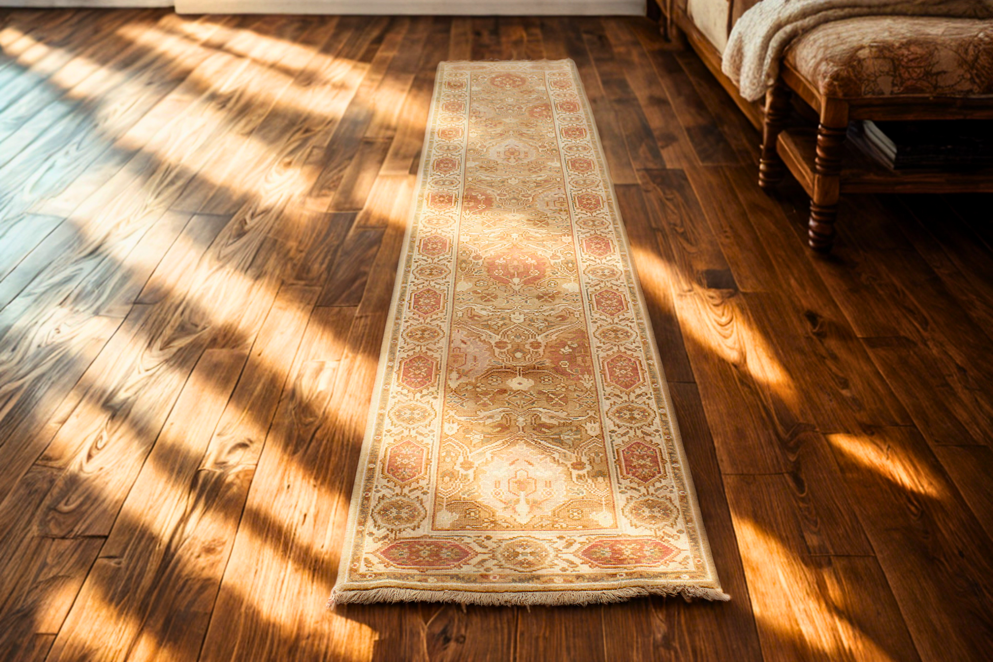 The spacious ivory ground allows the angular motifs to breathe, while the scrolling botanical border offers a striking contrast, tying the composition together with rhythmic movement. At over sixteen feet in length, this substantial runner makes an impressive statement in grand entryways, long corridors, or open transitional spaces, pairing antique authenticity with timeless design.