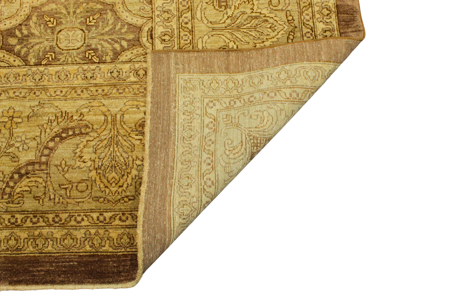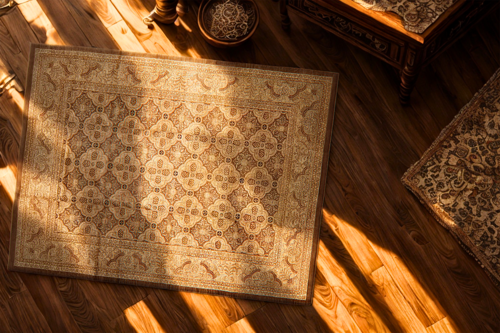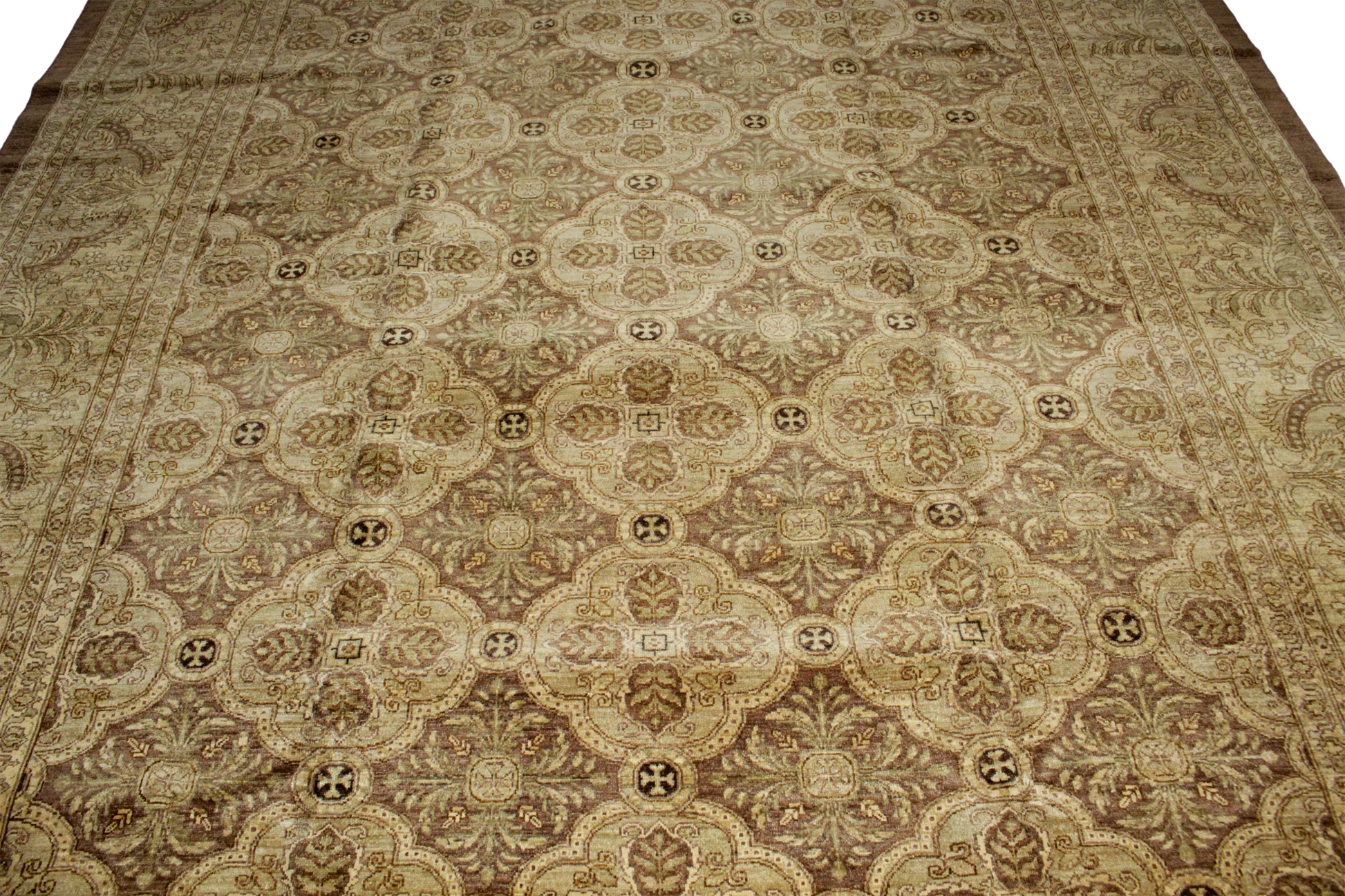 The rug showcases a meticulously rendered lattice design of repeating medallions, each filled with floral rosettes, curling leaves, and small stylized blossoms. The soft mocha brown field is layered with ivory, sand, and amber highlights — creating a subdued, harmonious rhythm across the surface. The border, in a slightly deeper tone, is framed with large-scale botanical motifs and an elegant scrolling vine pattern, offering a grounded finish to the central field’s delicate symmetry.