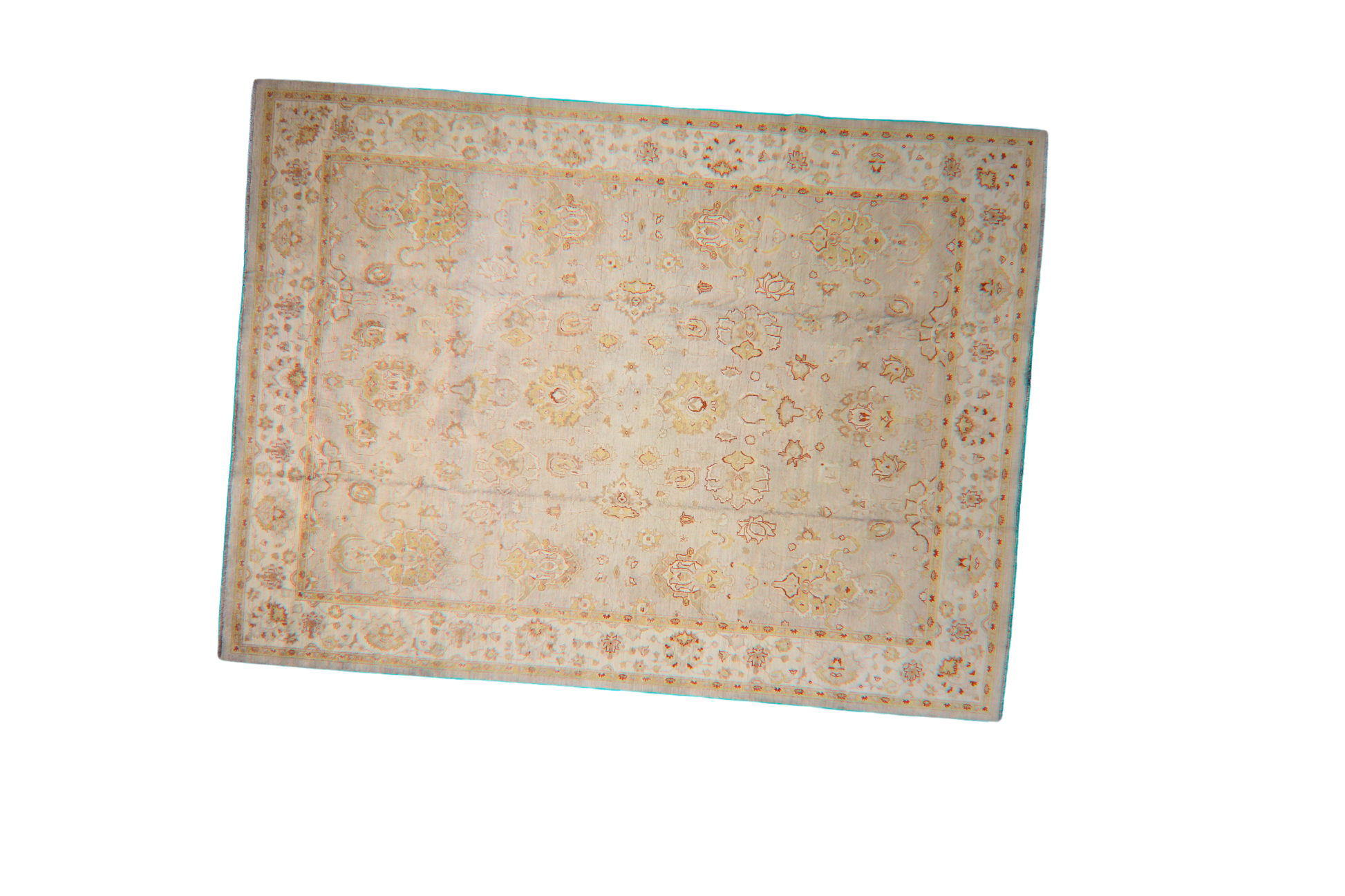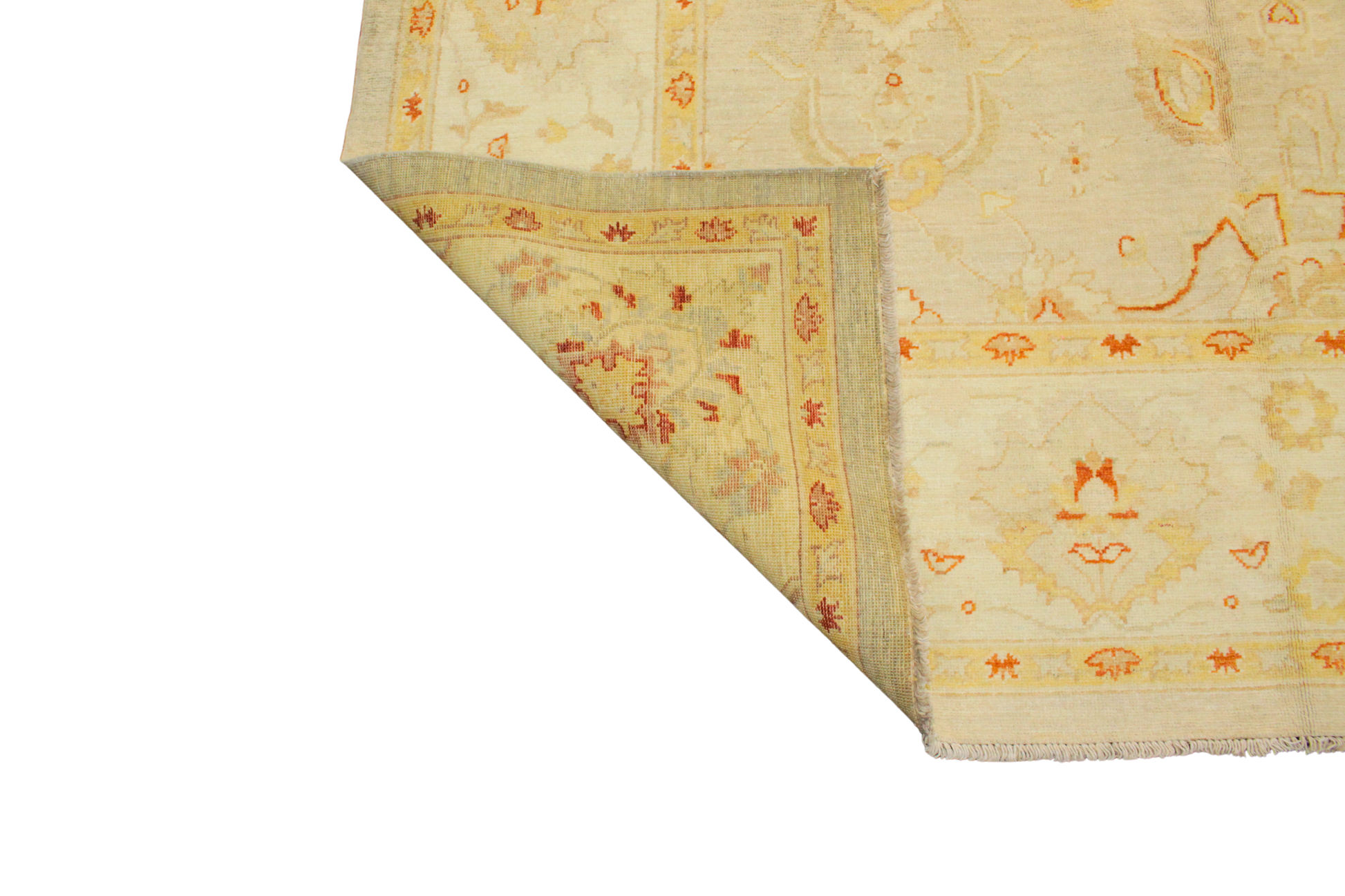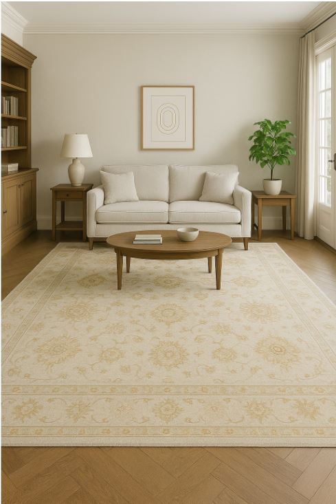 A vision of understated grandeur, this 10.2x13.7 ft hand-knotted Oushak rug from Pakistan exudes timeless refinement. Its generous scale is wrapped in a light ivory field adorned with large-scale floral medallions and vine scrolls in tones of wheat, sand, and faint rose. The design is deliberately spacious and relaxed, allowing the craftsmanship and subtle color shifts to shine through. Its wide border frames the field with ornamental grace, perfect for anchoring expansive interiors.