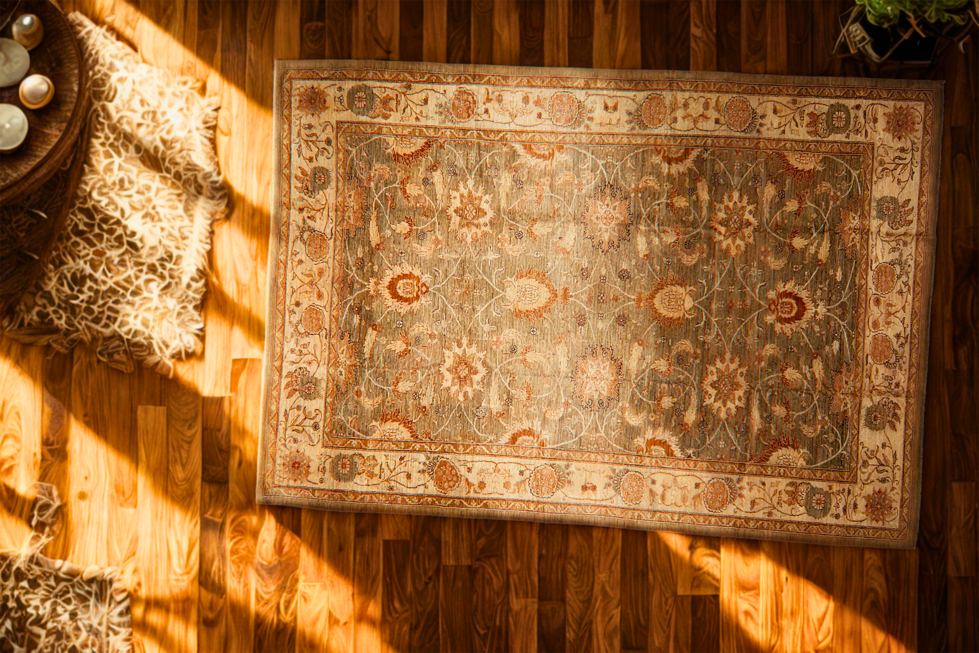 The rug features a soft olive green field with stylized palmettes and rosettes blooming in rust, cream, and tan tones, delicately connected by an intricate network of curving vines. The wide border in a pale parchment hue is decorated with floral medallions and trailing tendrils that mirror the inner field's botanical energy — creating a harmonious flow from edge to center.