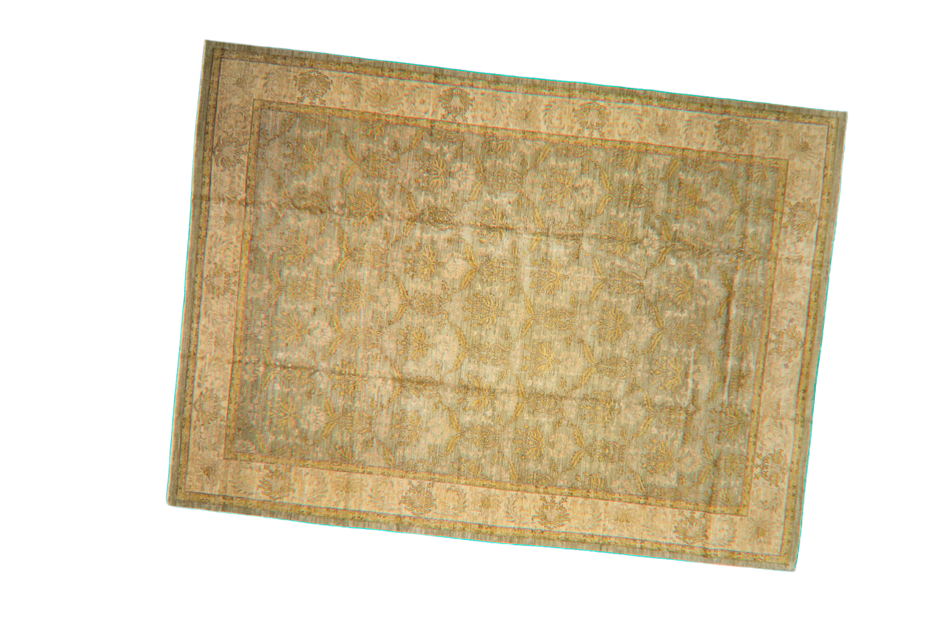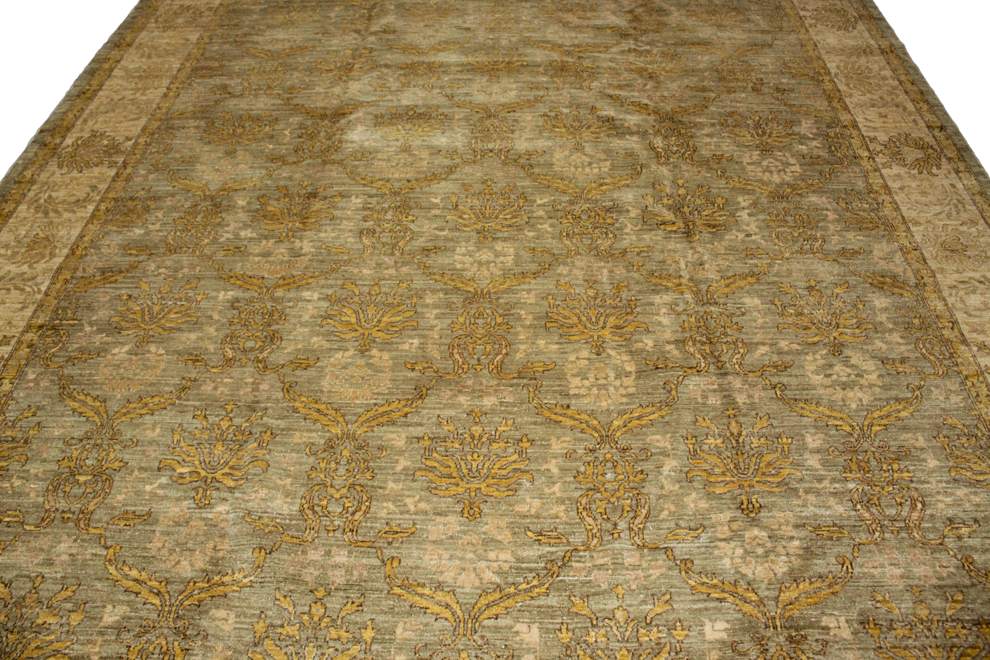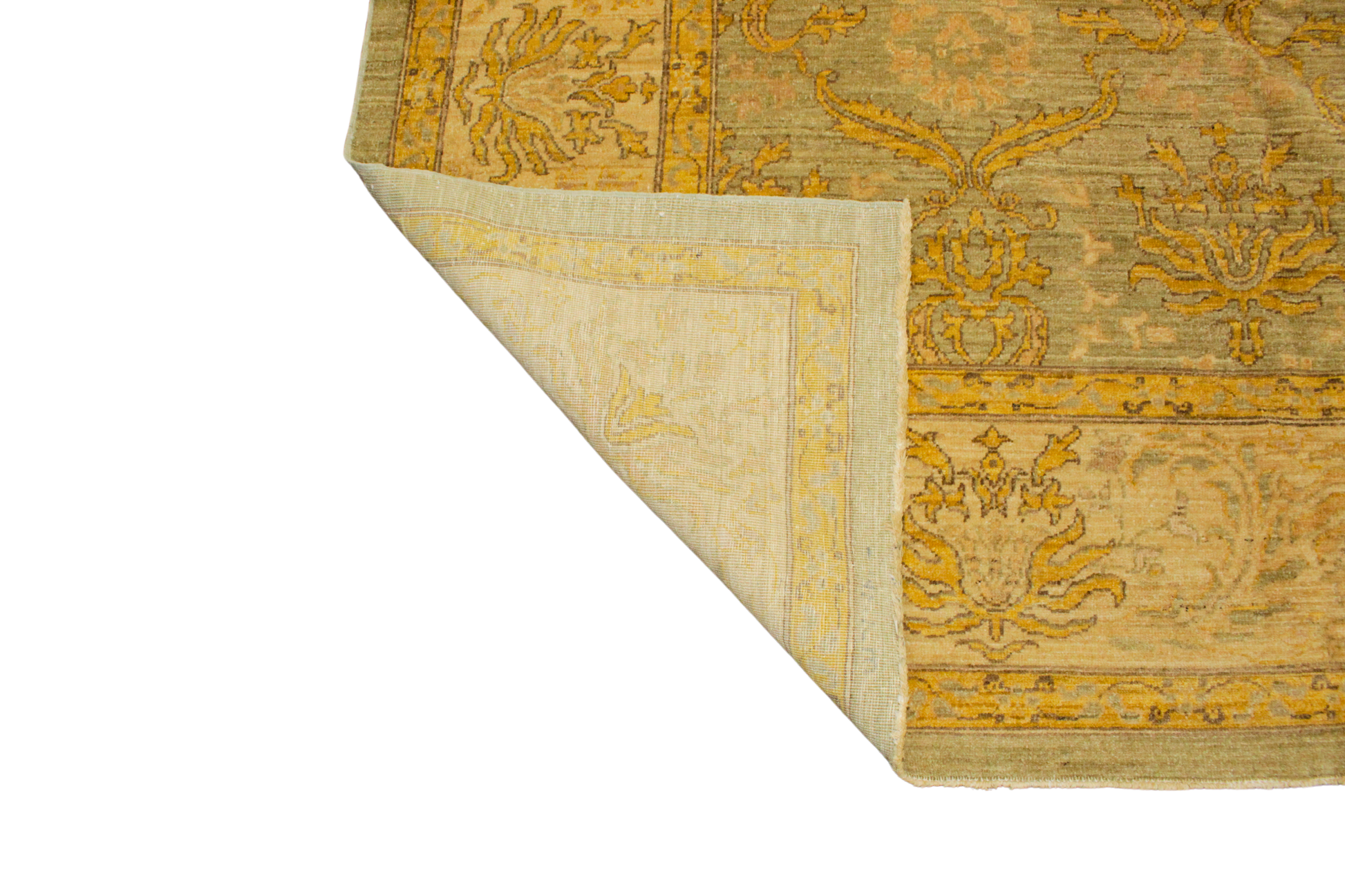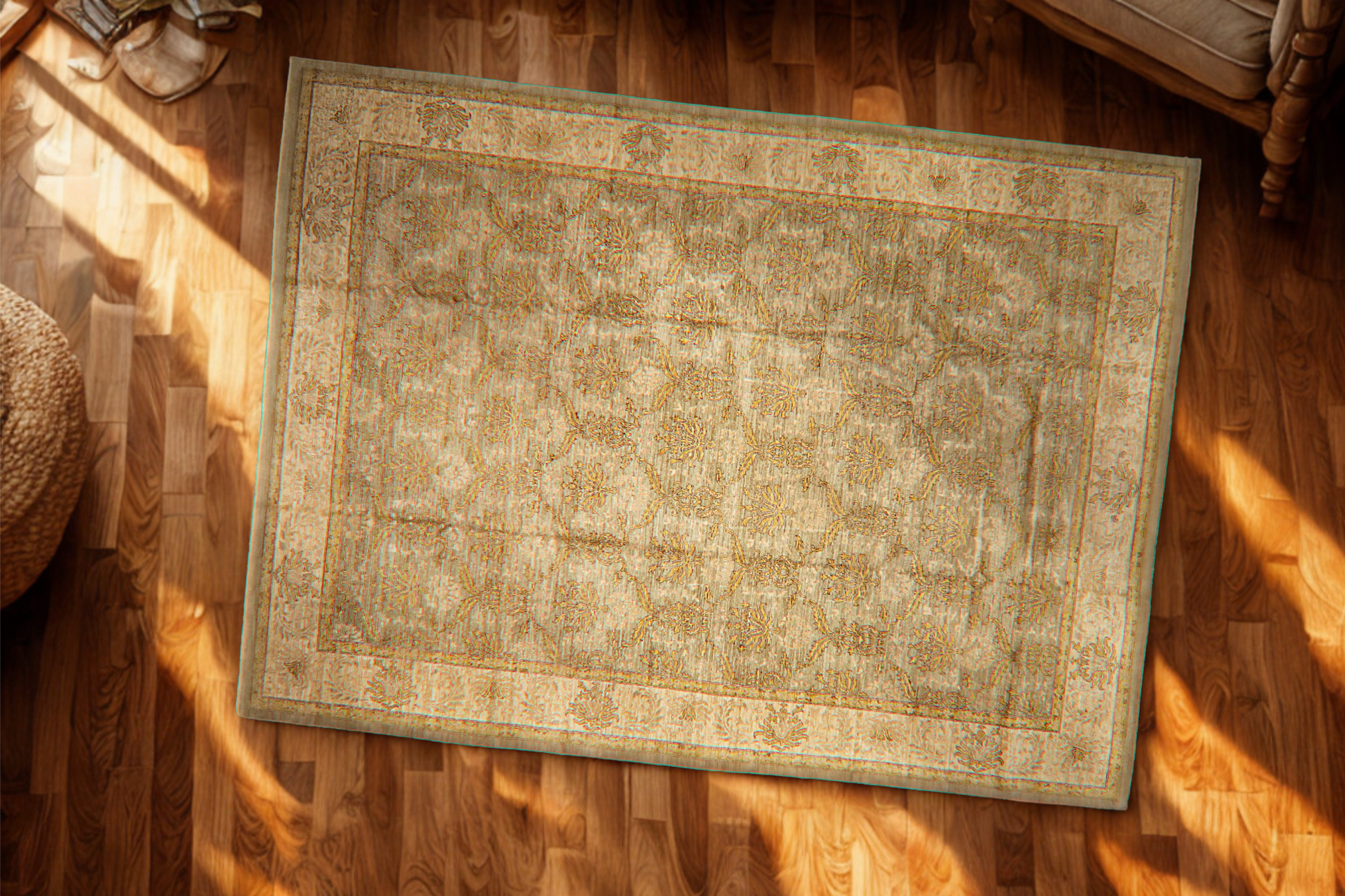 This exquisite Oushak rug from Pakistan, measuring 10.2 × 13.11 feet, exudes regal warmth with its palette of muted sage, antique gold, and weathered sand. Its delicate, repeating botanical motifs are framed by a broad, decorative border, creating a harmonious rhythm that softens and elevates the space it occupies. Woven with traditional craftsmanship, the rug’s faded patina and serene design evoke a sense of heritage and understated refinement.