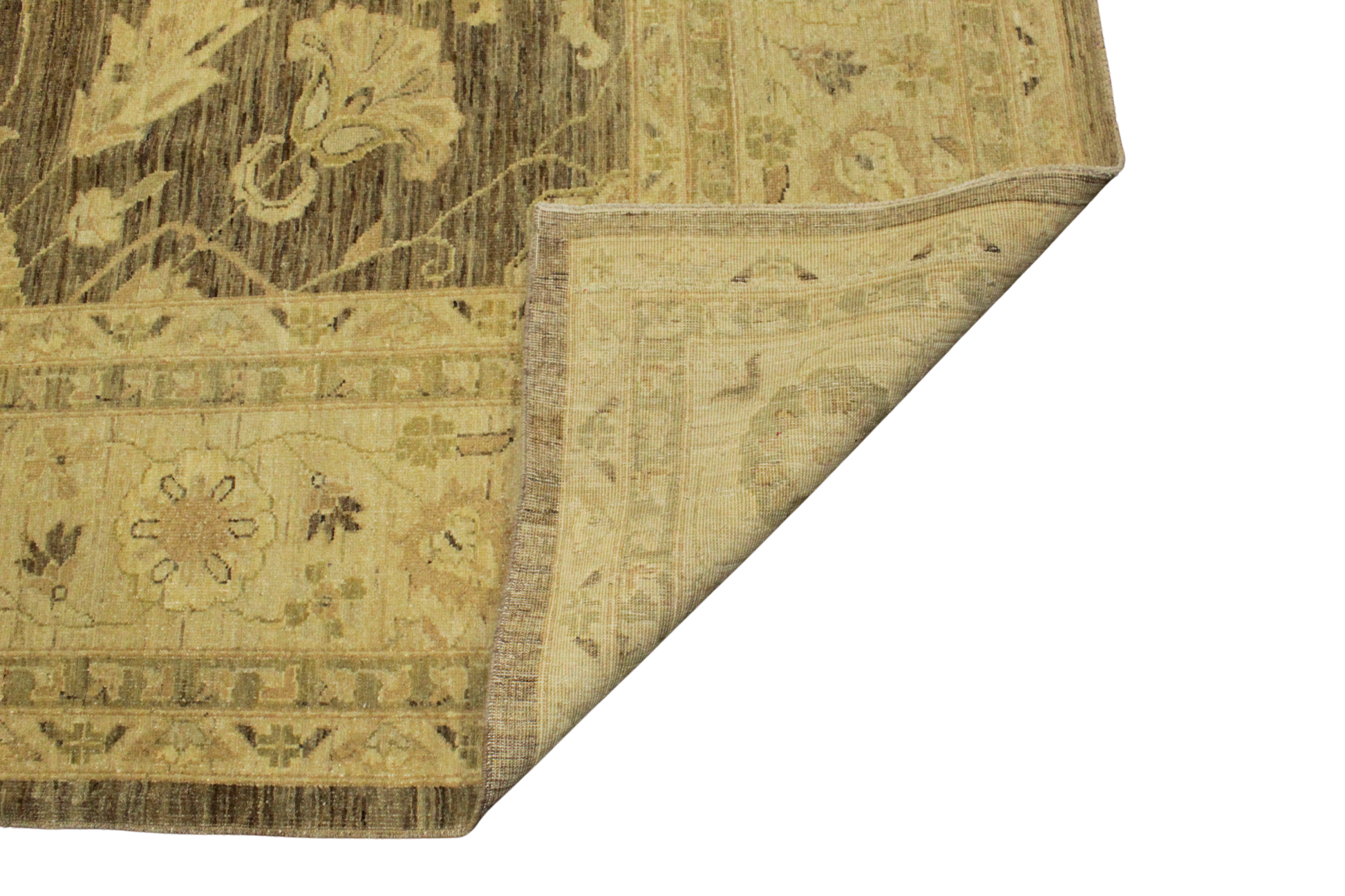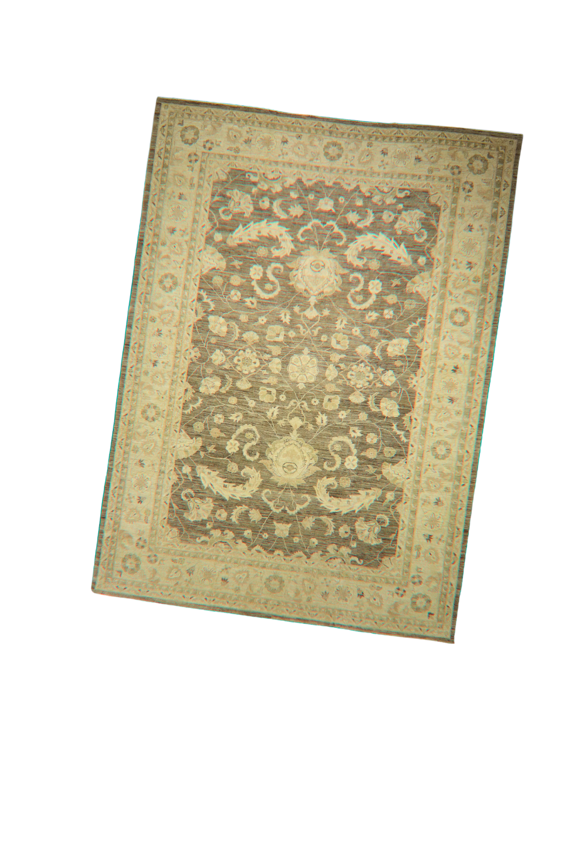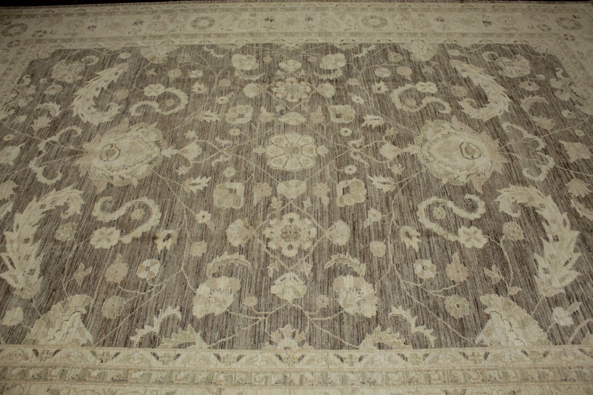 This exquisite Oushak rug from Pakistan (9.10 × 13.7 ft) evokes the tranquility of an ancient olive grove. The deep olive-brown field is adorned with flowing botanical motifs in soft cream and sand, creating a balanced contrast that feels both grounded and graceful. Large floral medallions and scrolling vines blossom across the field, while the wide border—rendered in pale ivory and beige—adds an elegant frame to the overall composition.