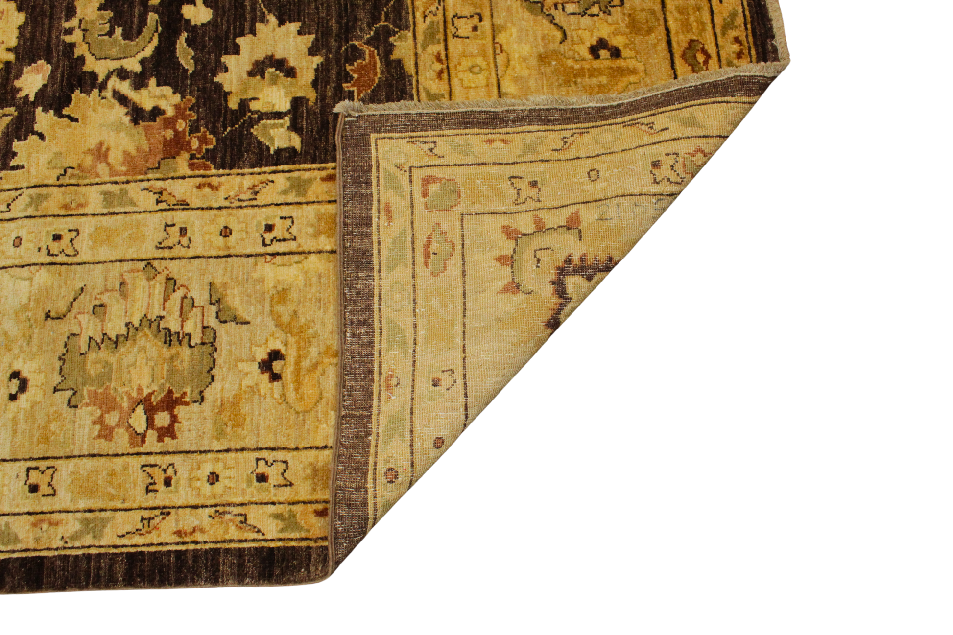 The field is saturated in a deep chocolate brown, acting as a rich canvas for its ornate ivory and beige motifs — stylized lotus blossoms, scrolling leaves, and elongated palmettes. The striking color contrast is softened by the rug’s hand-spun wool texture and the gentle abrash effect, giving the piece depth and artisanal warmth. A broad cream-toned border offers balance, densely decorated with classic Oushak floral work and geometric rosettes.