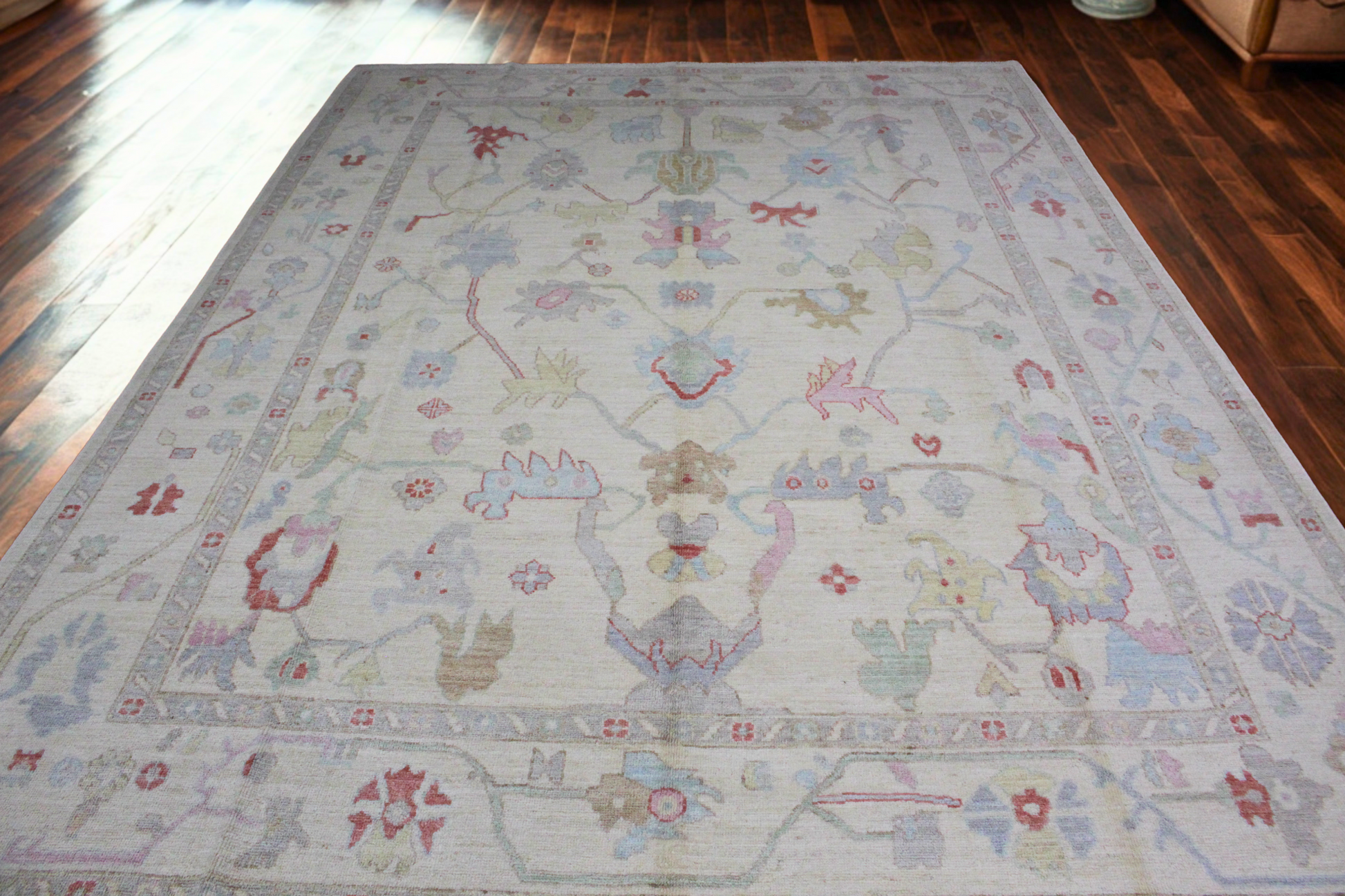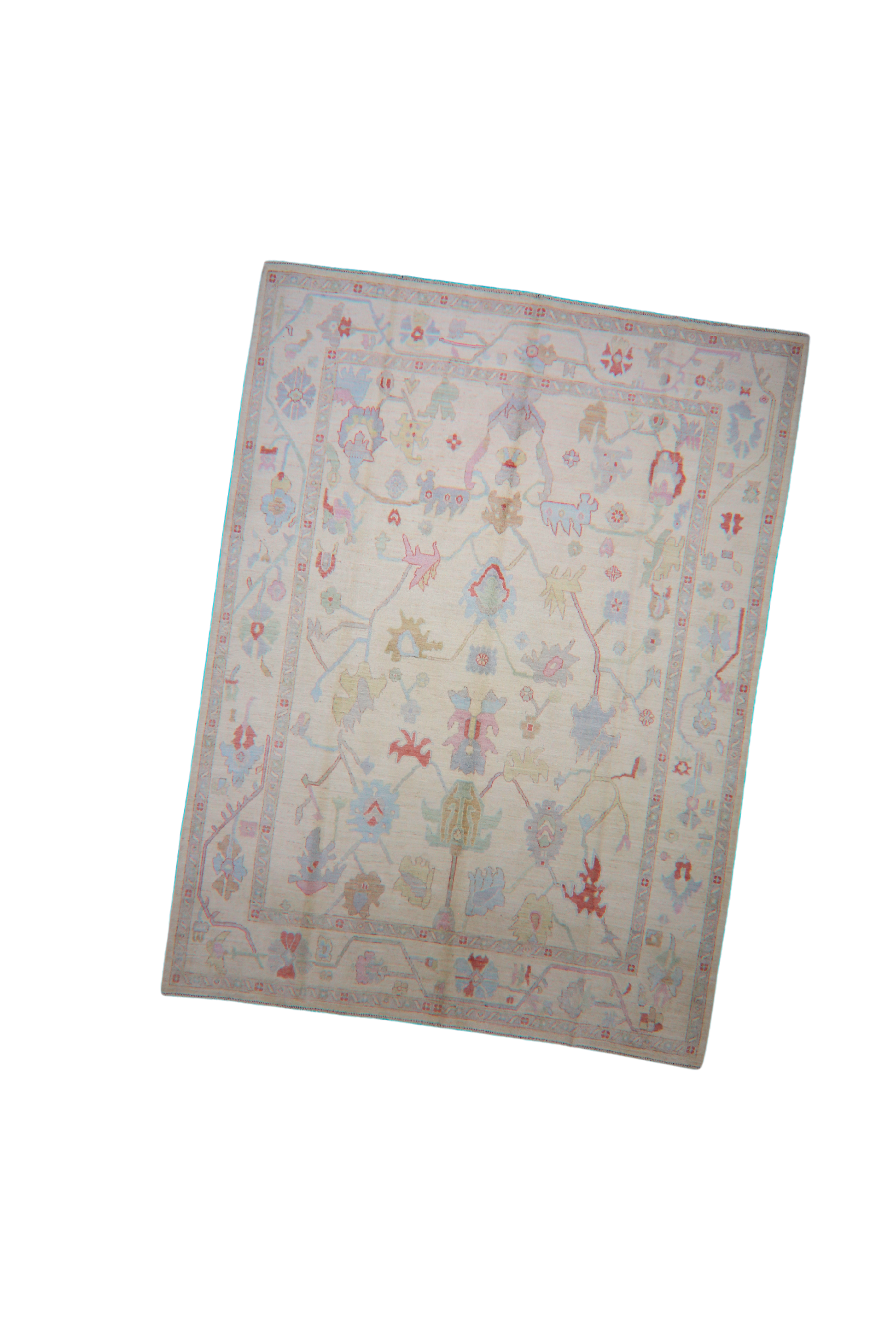 Softly radiant and airy, this hand-knotted Afghan Oushak rug (9 × 12 ft) exudes a peaceful elegance with its pale, almost ethereal palette. The open field design features whimsical botanical motifs—stylized palmettes, rosettes, and curling vines—dancing freely across a warm ivory ground touched with hints of petal pink, muted aqua, and sandstone.