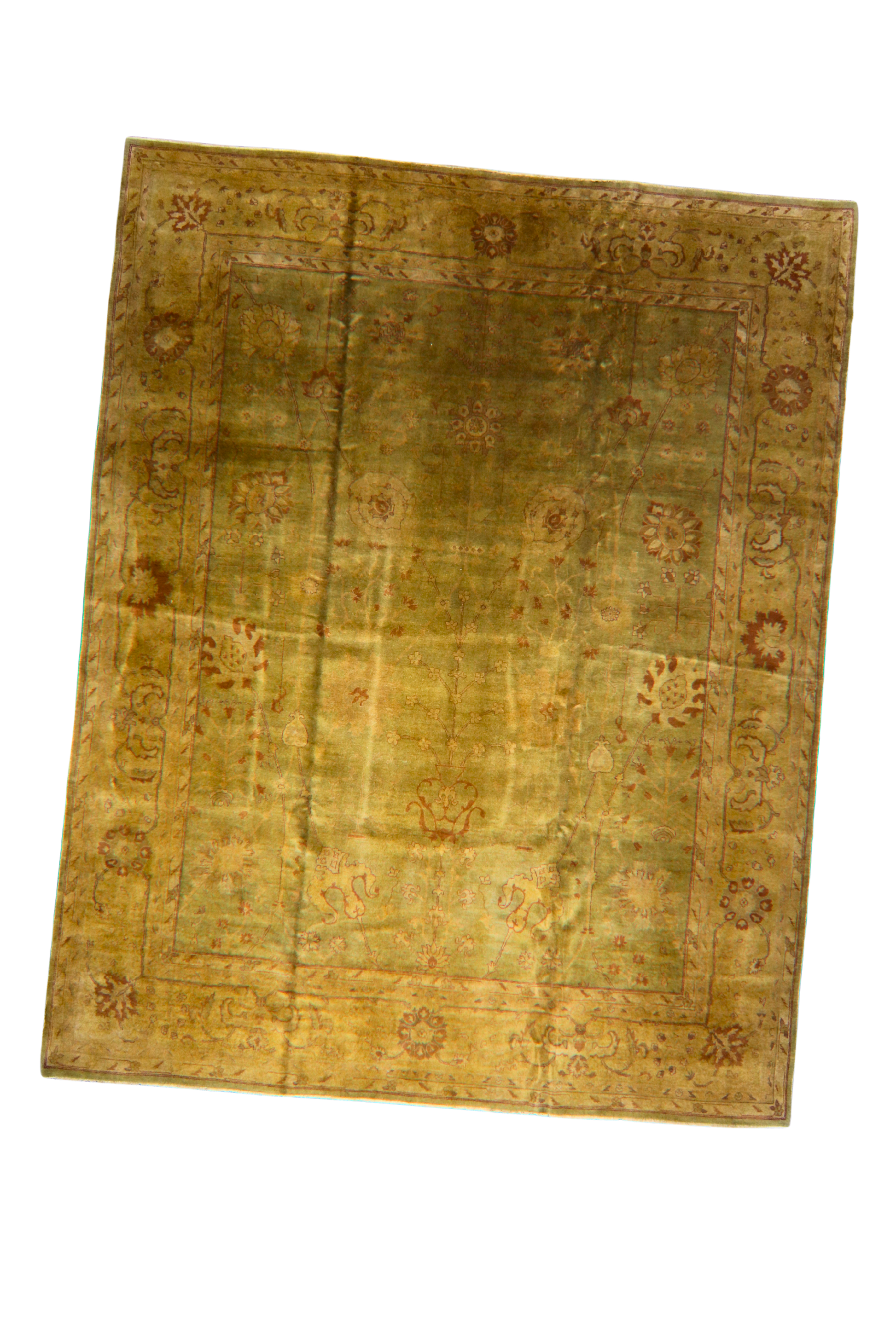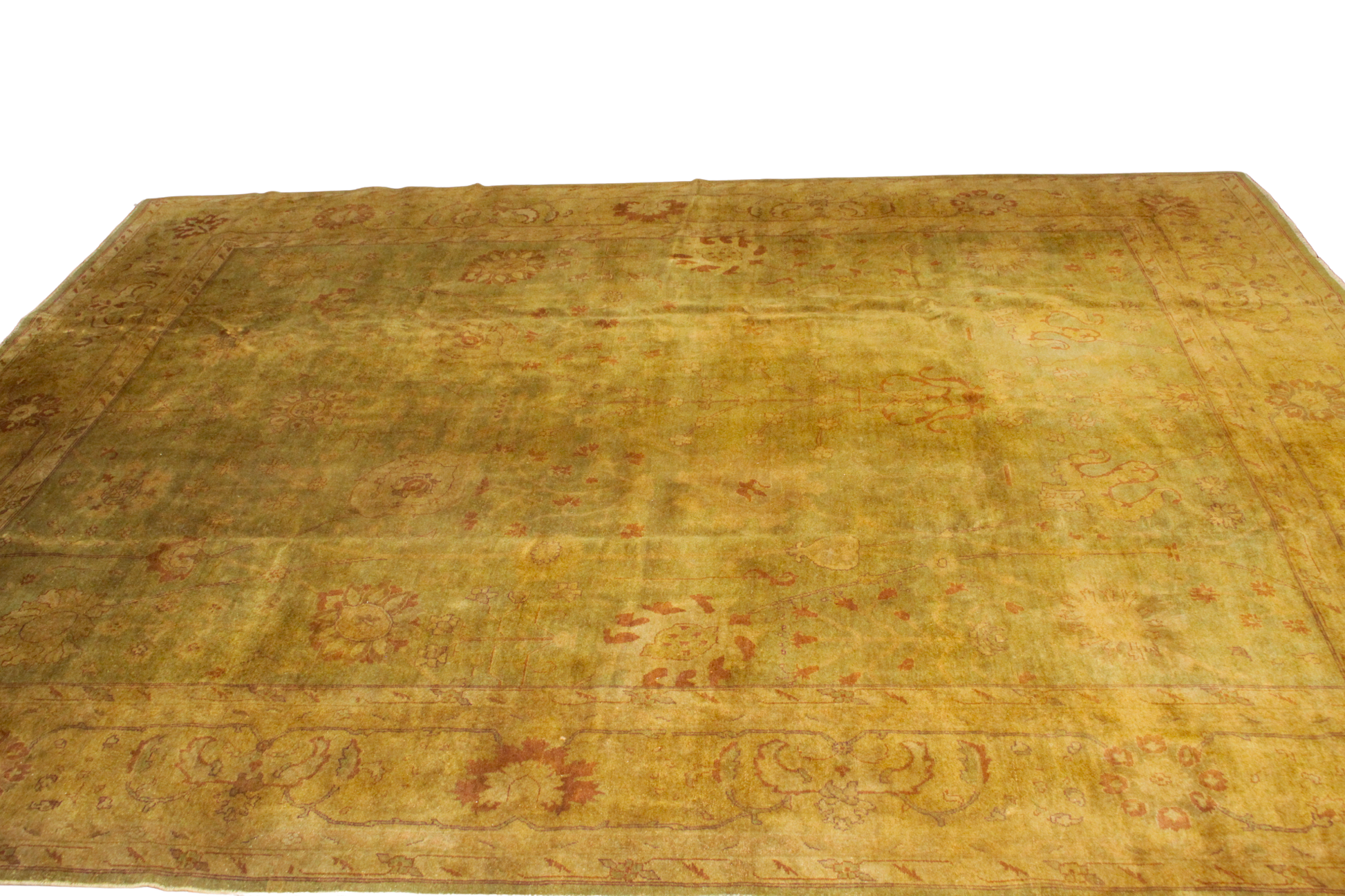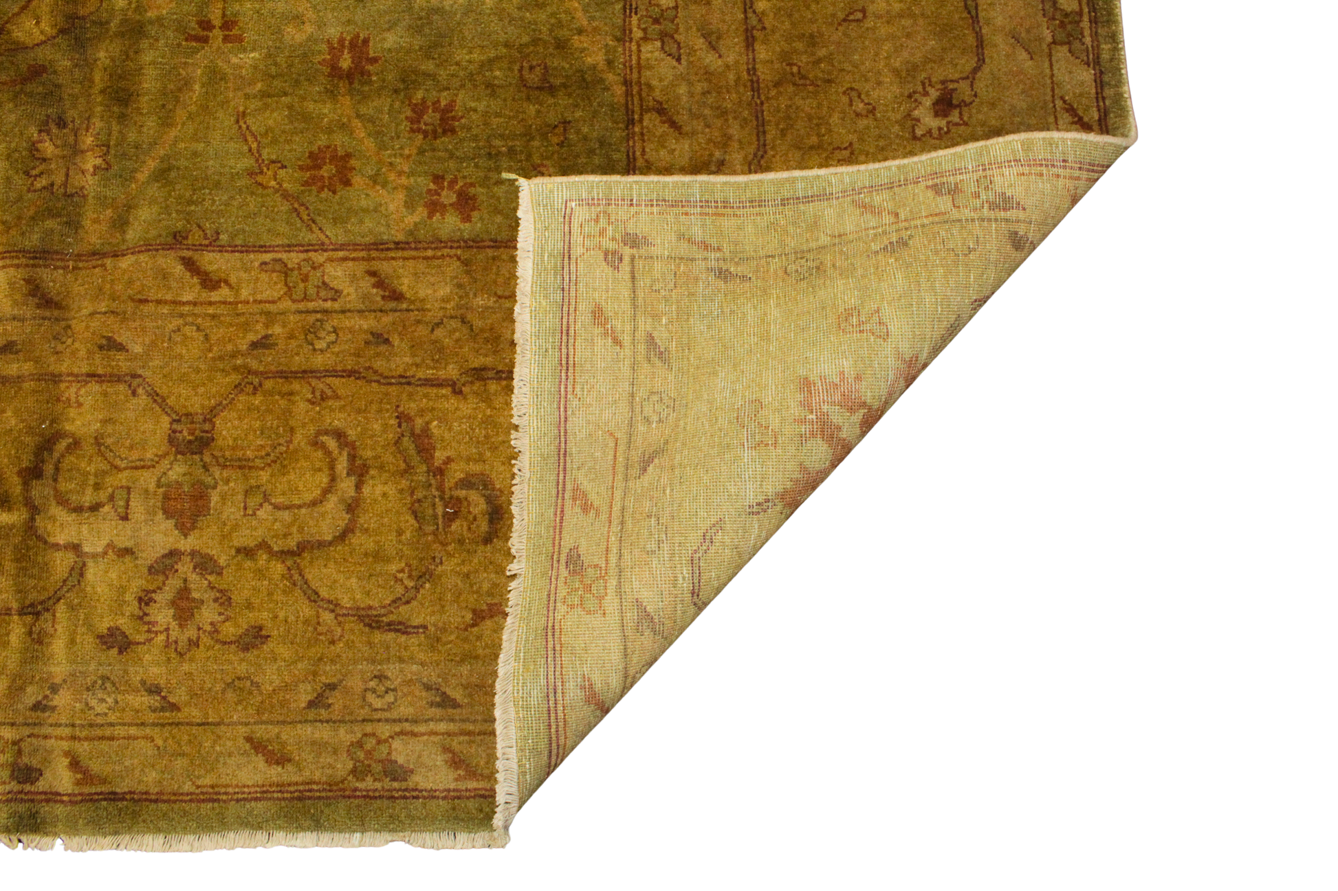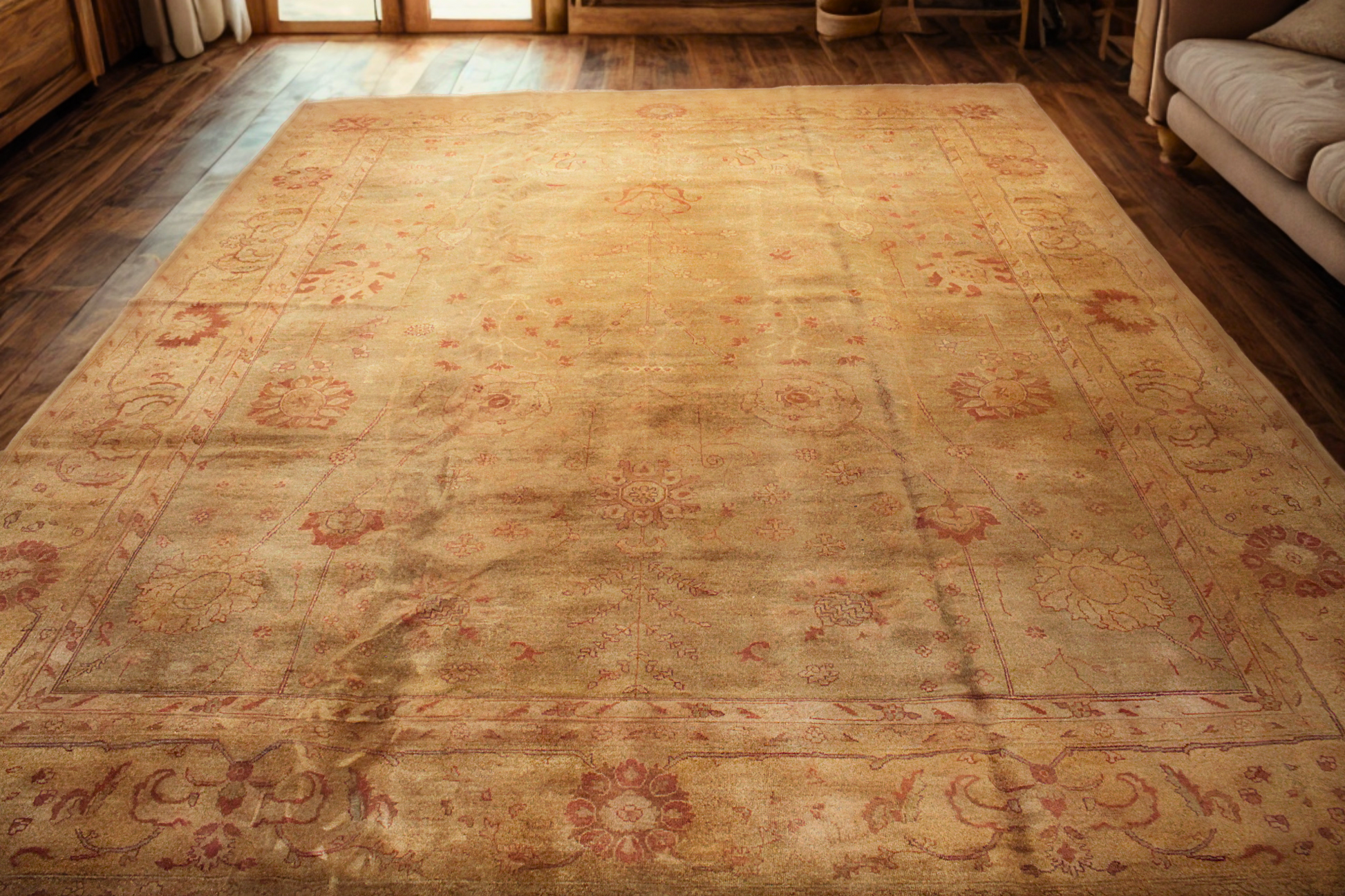 Imbued with a deep, earthy character, this oversized Oushak rug from India evokes timeless grandeur with a worn elegance. The muted olive green field is framed by a soft gold border and populated with rust, tan, and faded ochre floral motifs — stylized medallions, rosettes, and vine scrolls that create a subtle rhythm across the surface. The palette feels aged and sun-kissed, reminiscent of antique pieces mellowed by decades of use.
