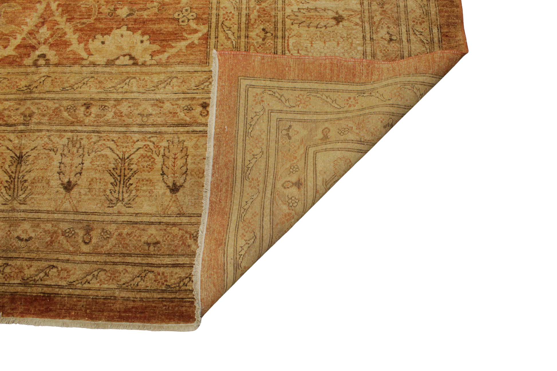 The golden border, accented with stylized tulips and rhythmic cartouches, frames the central field with a sense of architectural balance. Warm, bold, and timeless, this rug delivers a powerful aesthetic — perfect for grand living spaces, formal dining rooms, or luxury hospitality environments.