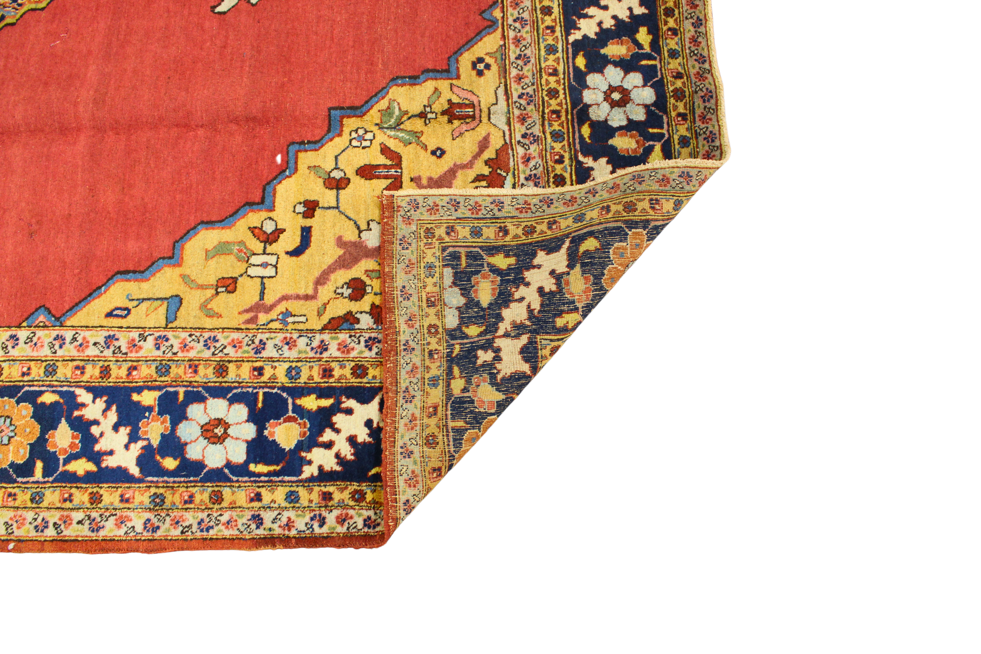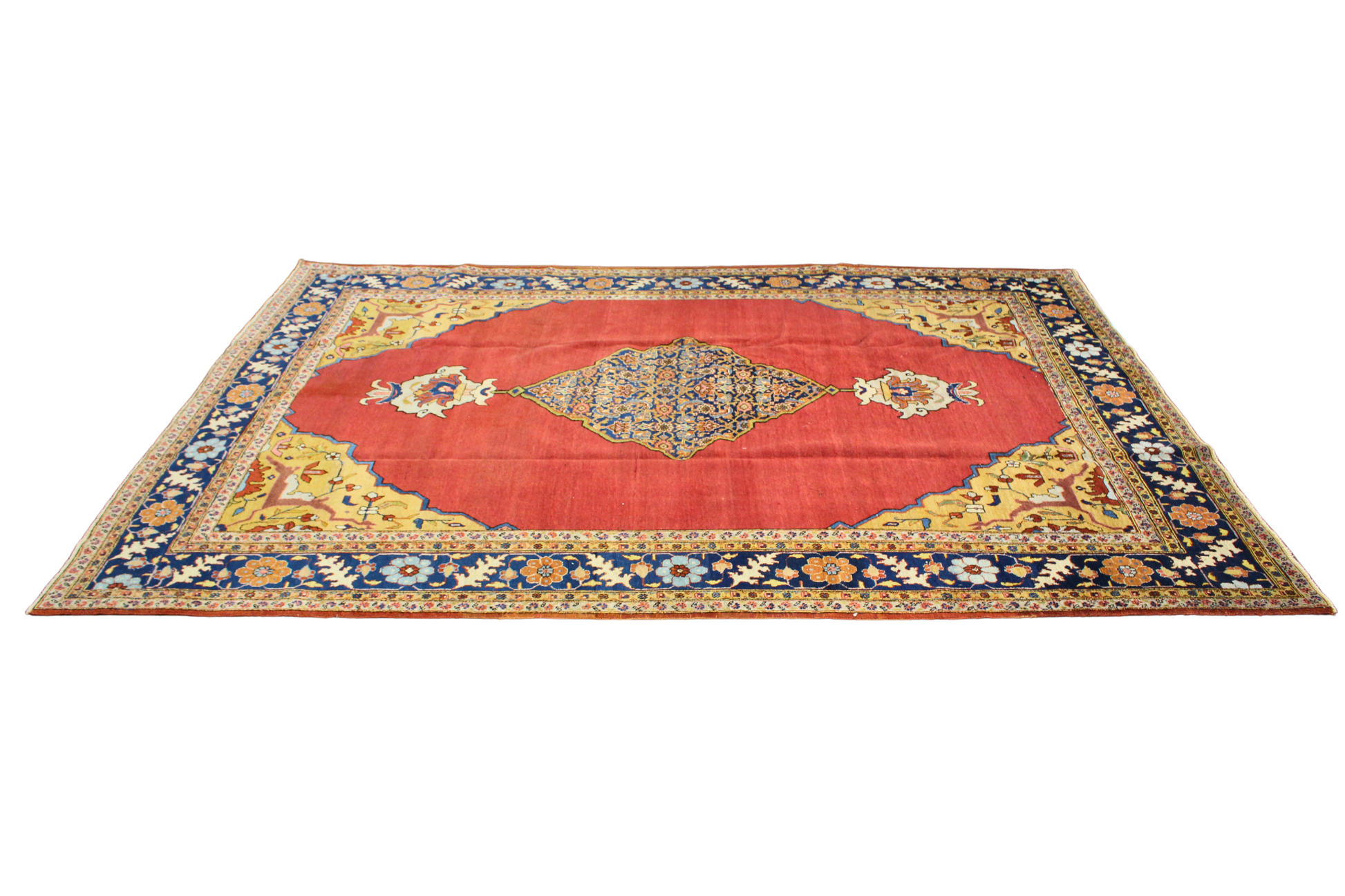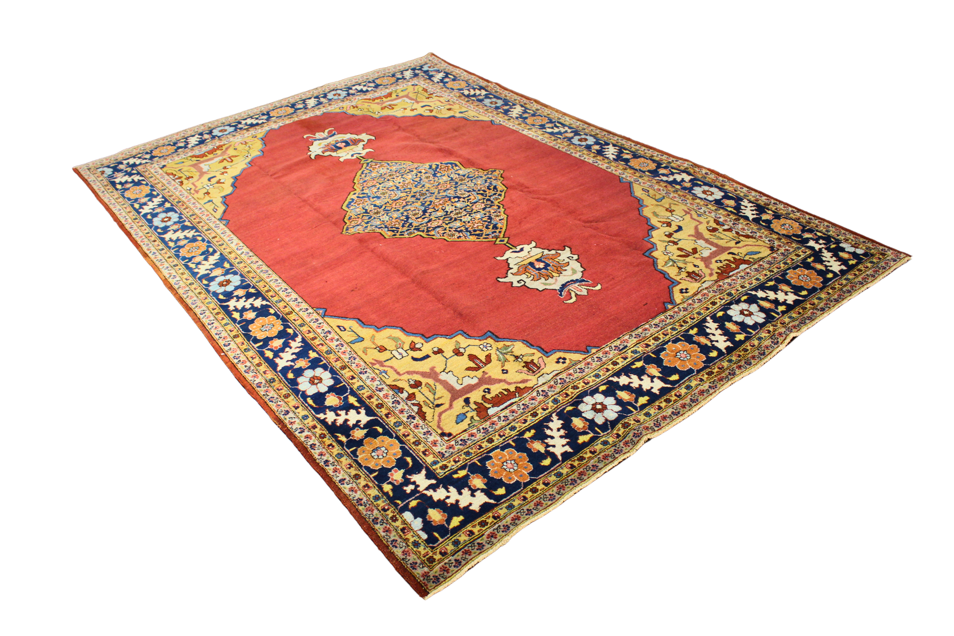 Golden corner spandrels filled with stylized hunting animals and curling vinework contrast vividly with the rich red ground, adding storytelling depth to the composition. A navy border with rosette blossoms and leaf motifs adds grounding structure and heightens the rug’s majestic frame.