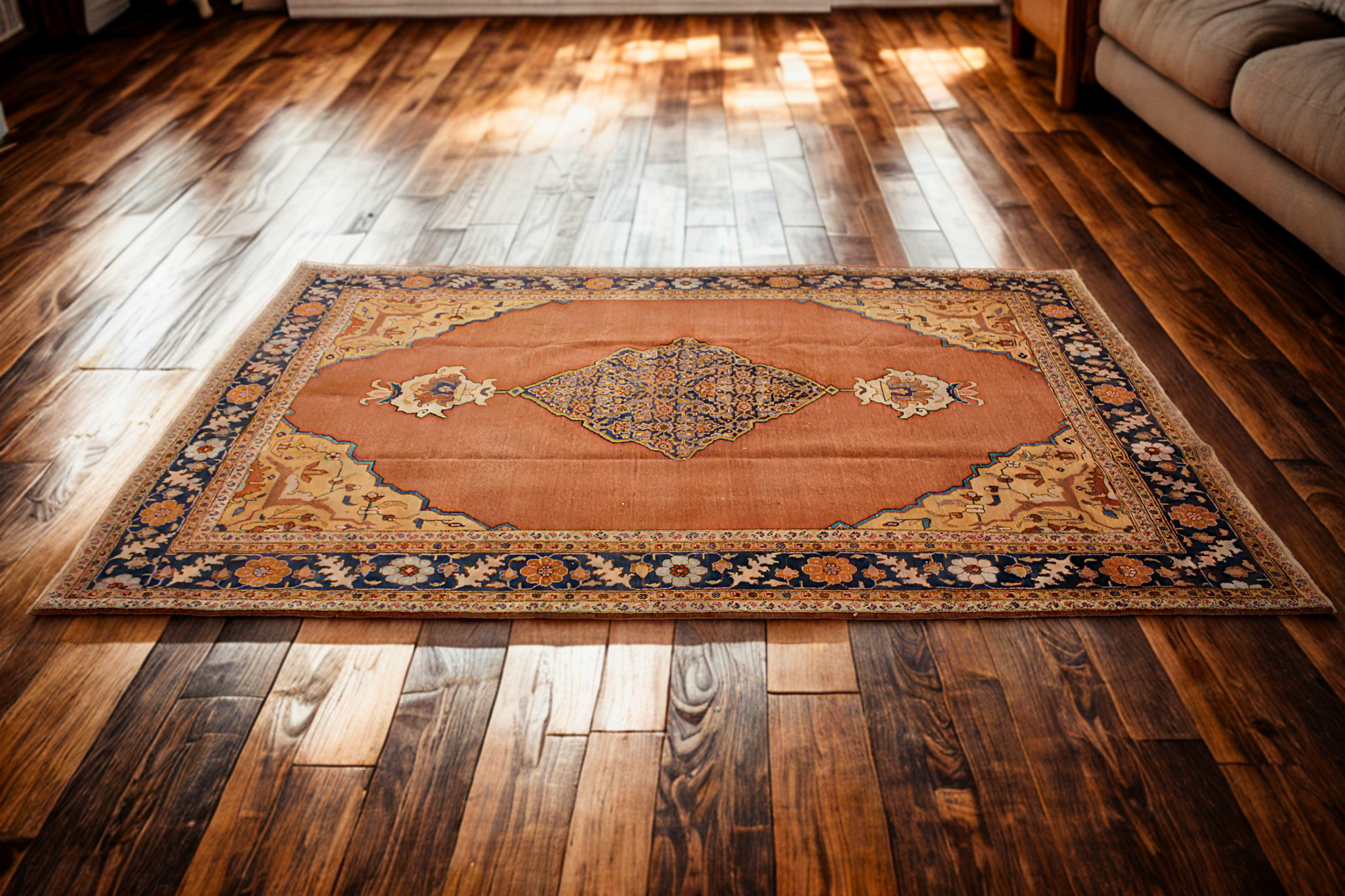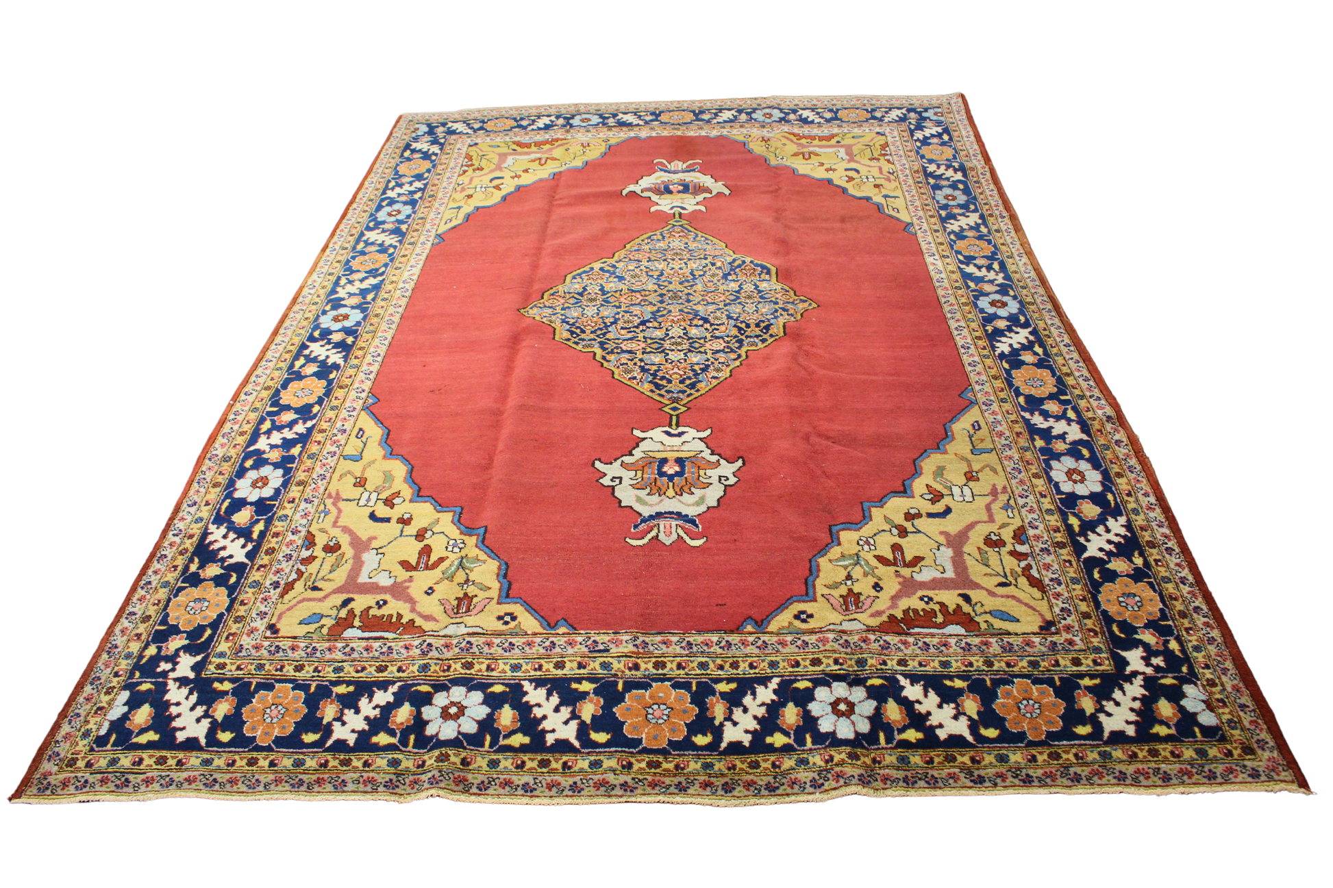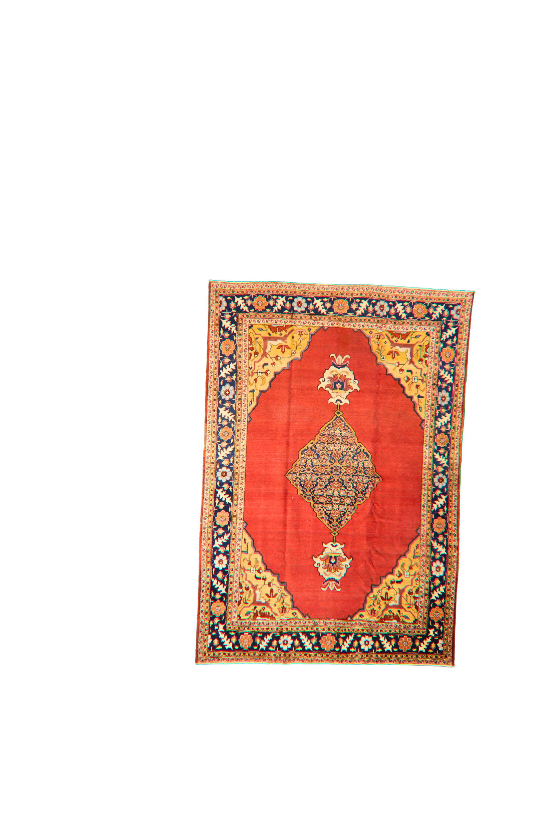 A masterpiece of symmetry and tradition, this Persian Tabriz rug (7.9 × 10.7 ft) showcases the regal elegance that defines the weaving legacy of northwest Persia. The design features a classic diamond-shaped medallion with pendants, floating confidently on a deep terracotta red field — a layout inspired by centuries-old palace carpets.