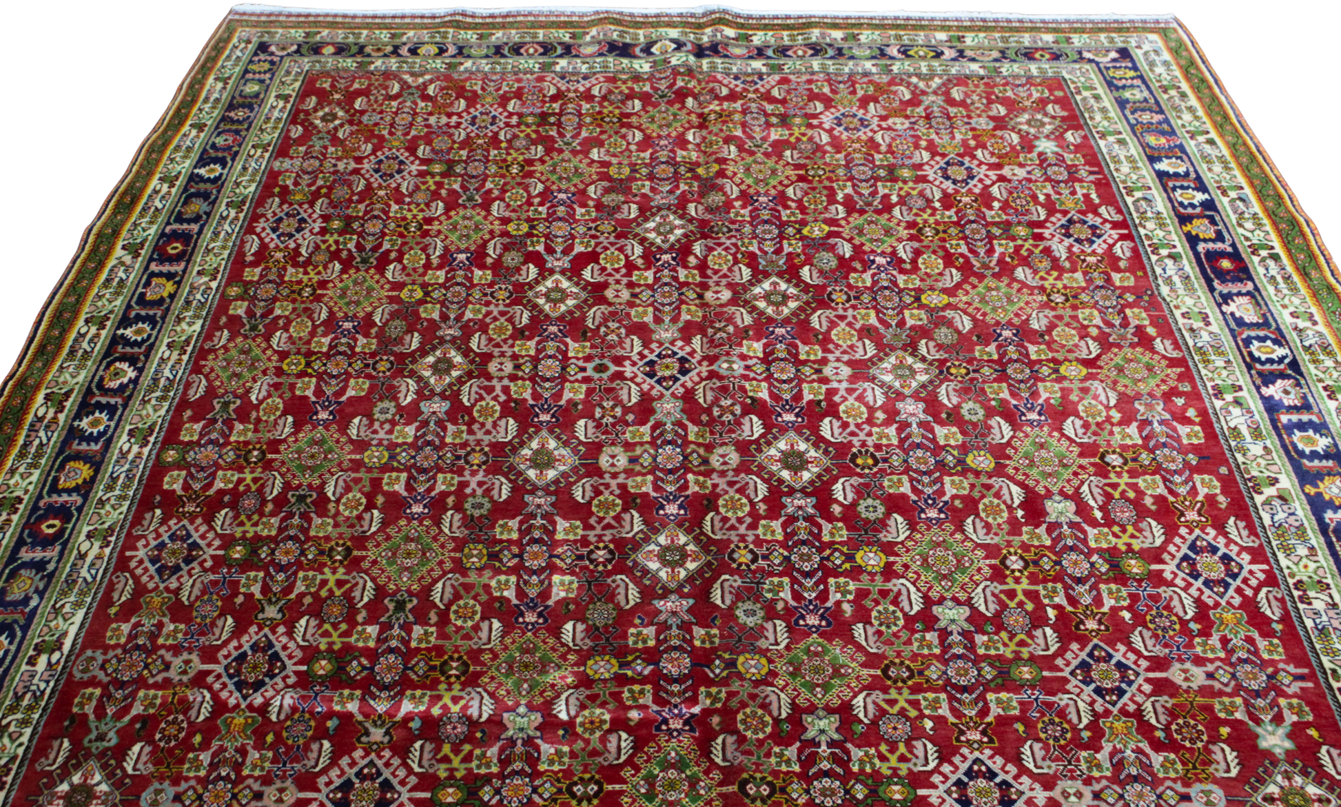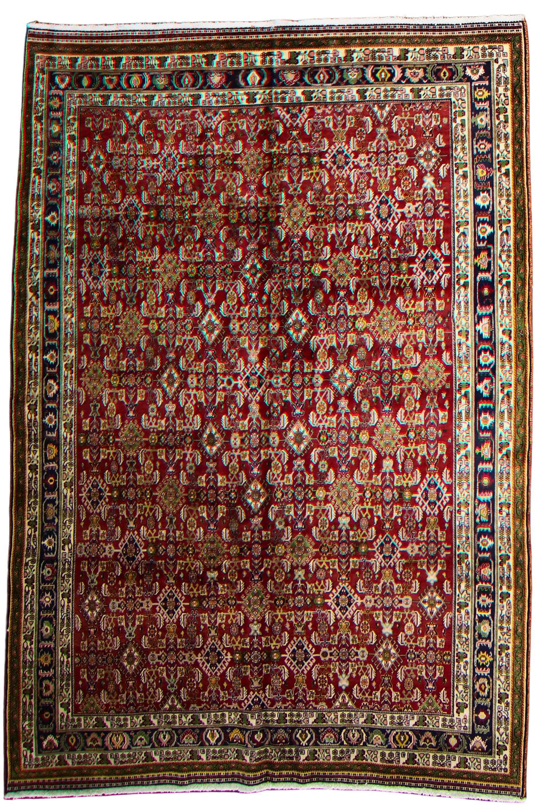 This masterfully hand-knotted Persian Shiraz rug (6.9 × 9.6 ft) is a rich tapestry of tribal storytelling and decorative precision. Its deep crimson field bursts with a dense lattice of boteh, diamond, and angular floral motifs arranged in an allover pattern—framed by a multi-tiered border of dark indigo, ivory, and touches of green, saffron, and sky blue.