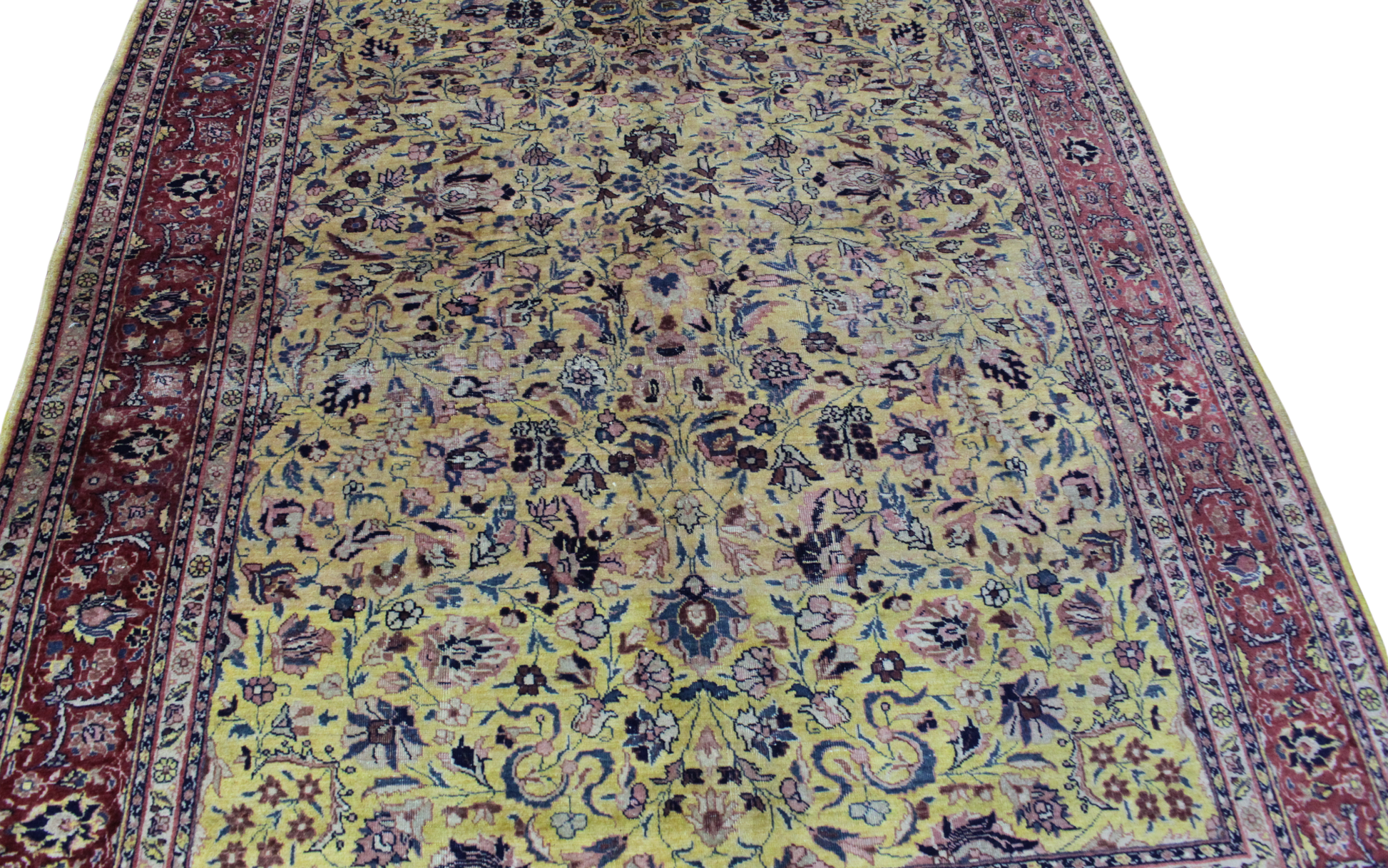 This antique Tabriz rug (6.1 × 9 ft) is a luminous tribute to the elegance of classical Persian weaving. Its soft golden ivory field is richly adorned with an allover floral pattern, where curling vines, palmettes, and rosettes form a refined and harmonious lattice. The intricate botanical motifs are rendered in tones of deep navy, soft coral, blush rose, and gentle greens — all naturally aged to a warm, inviting patina.