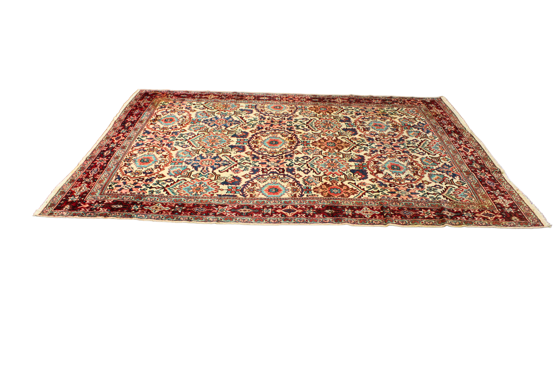 Elegant and richly detailed, this antique Mahal rug captivates with its harmonious allover floral pattern set against a warm ivory field. Rosettes and stylized palmettes bloom in orderly formation, balanced by angular vinery and soft medallion-like forms. The design exudes a refined symmetry while still embracing the natural charm of handwoven artistry.