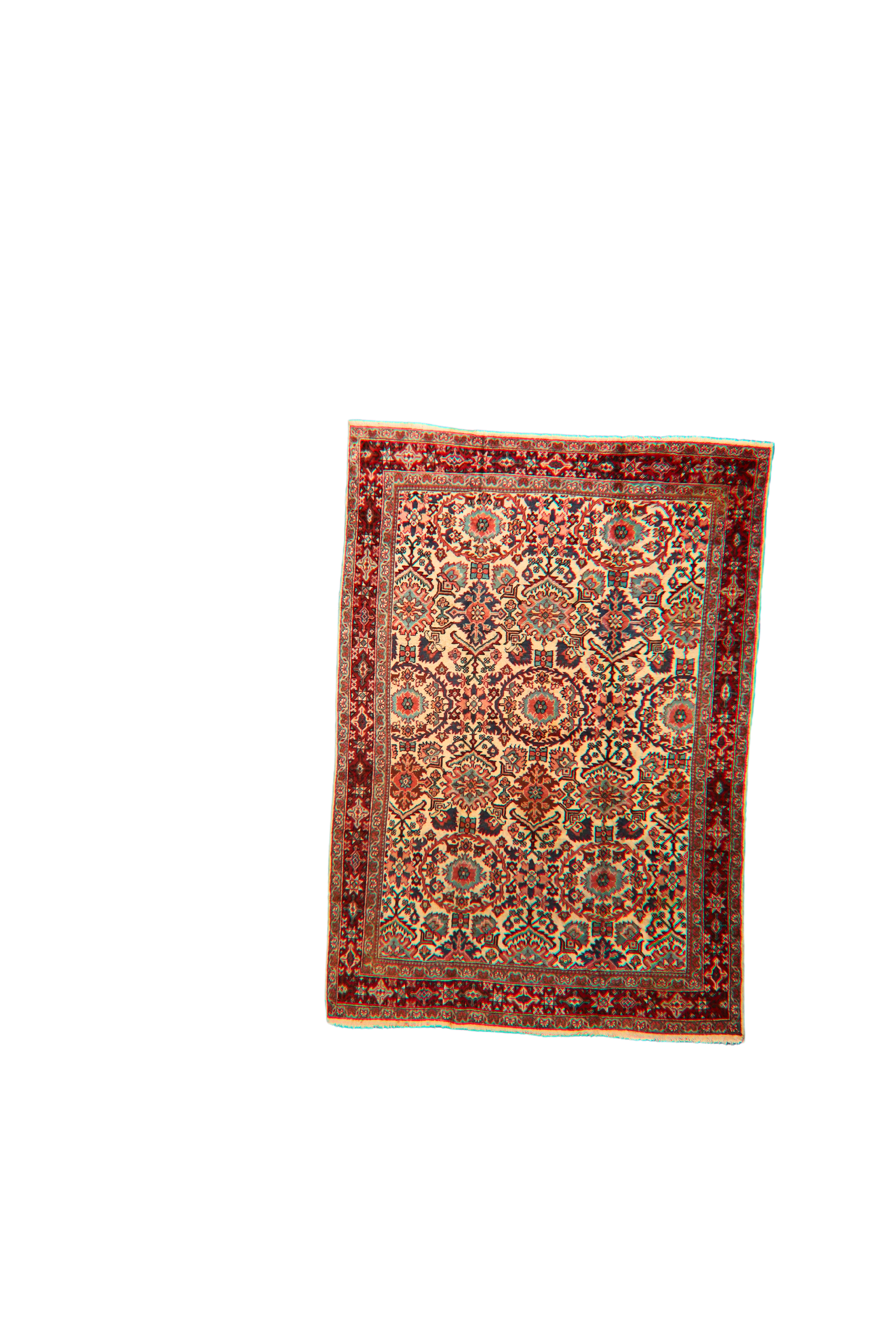 The border, in classic rust red, frames the composition with a rhythmic procession of floral motifs and angular vines, creating a beautiful contrast and depth. This piece is a timeless example of village weaving from the Mahal region, suited for both traditional and transitional interiors.