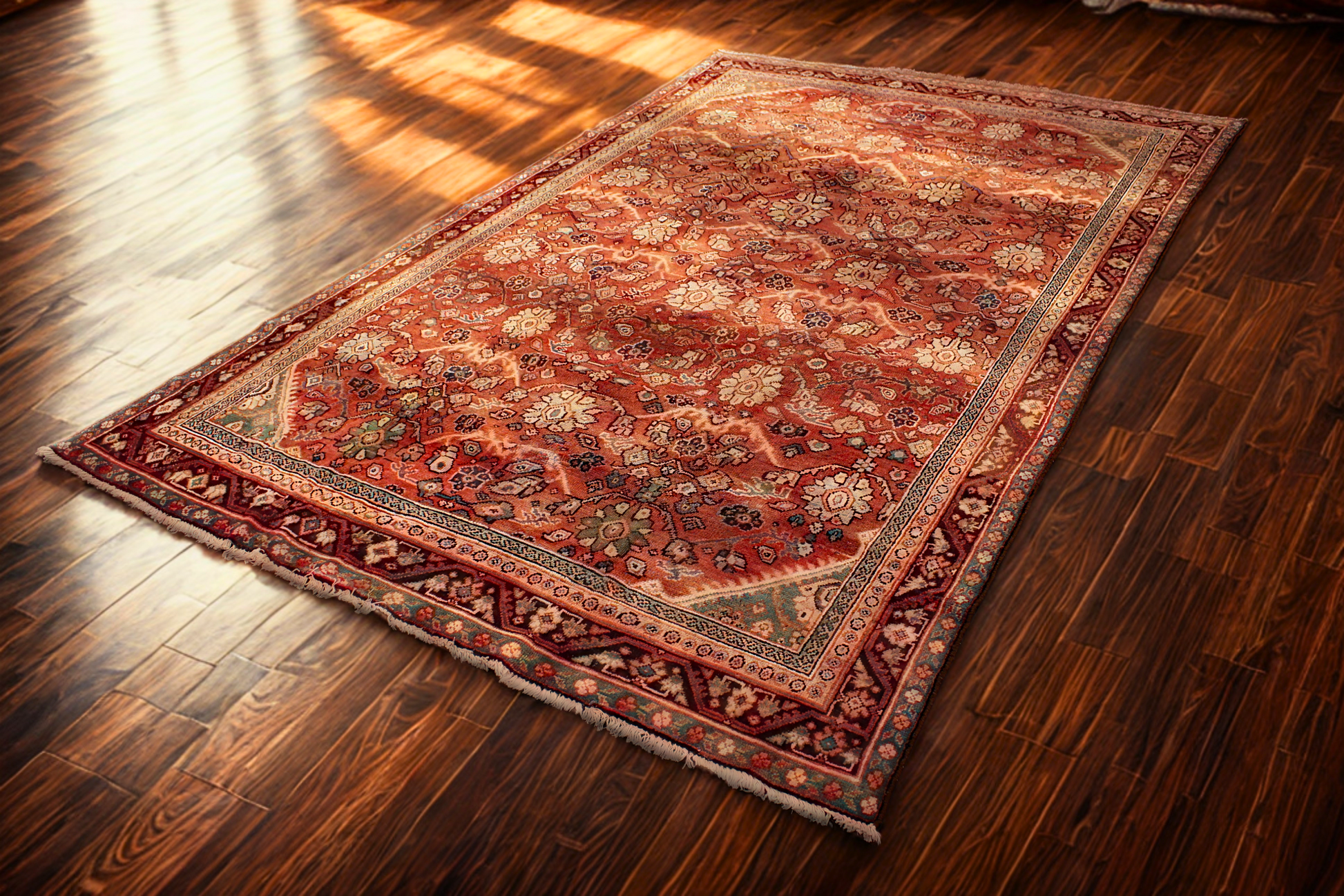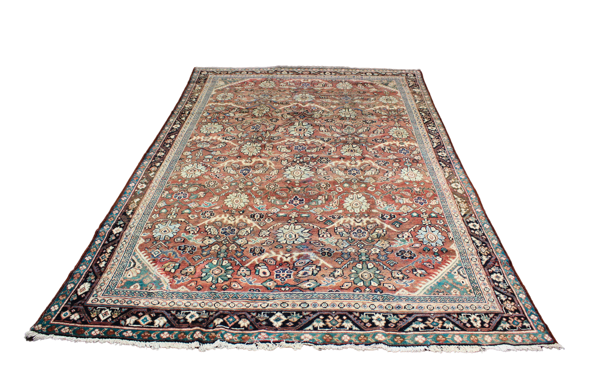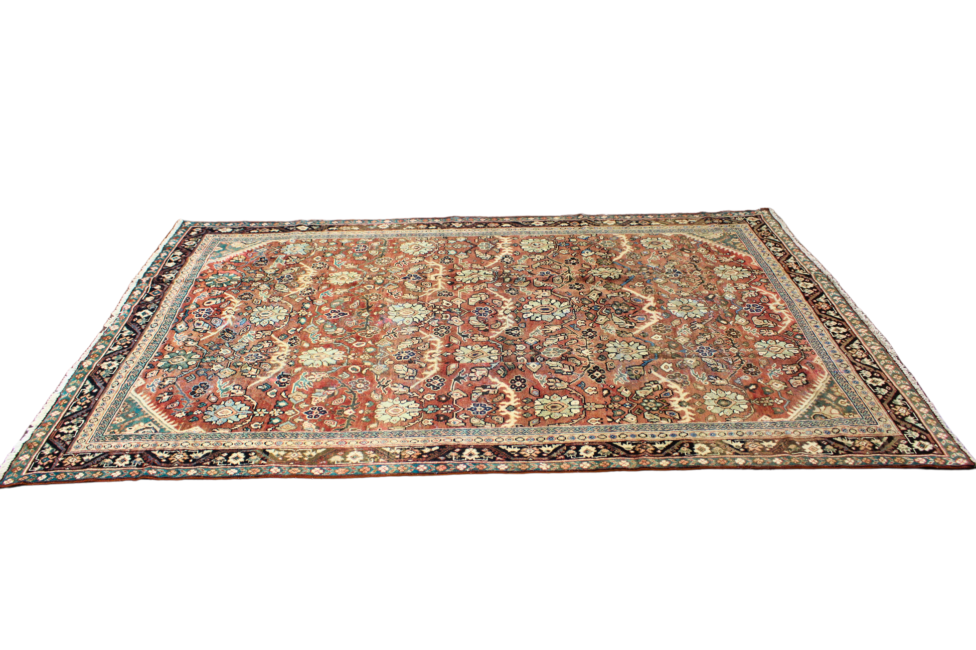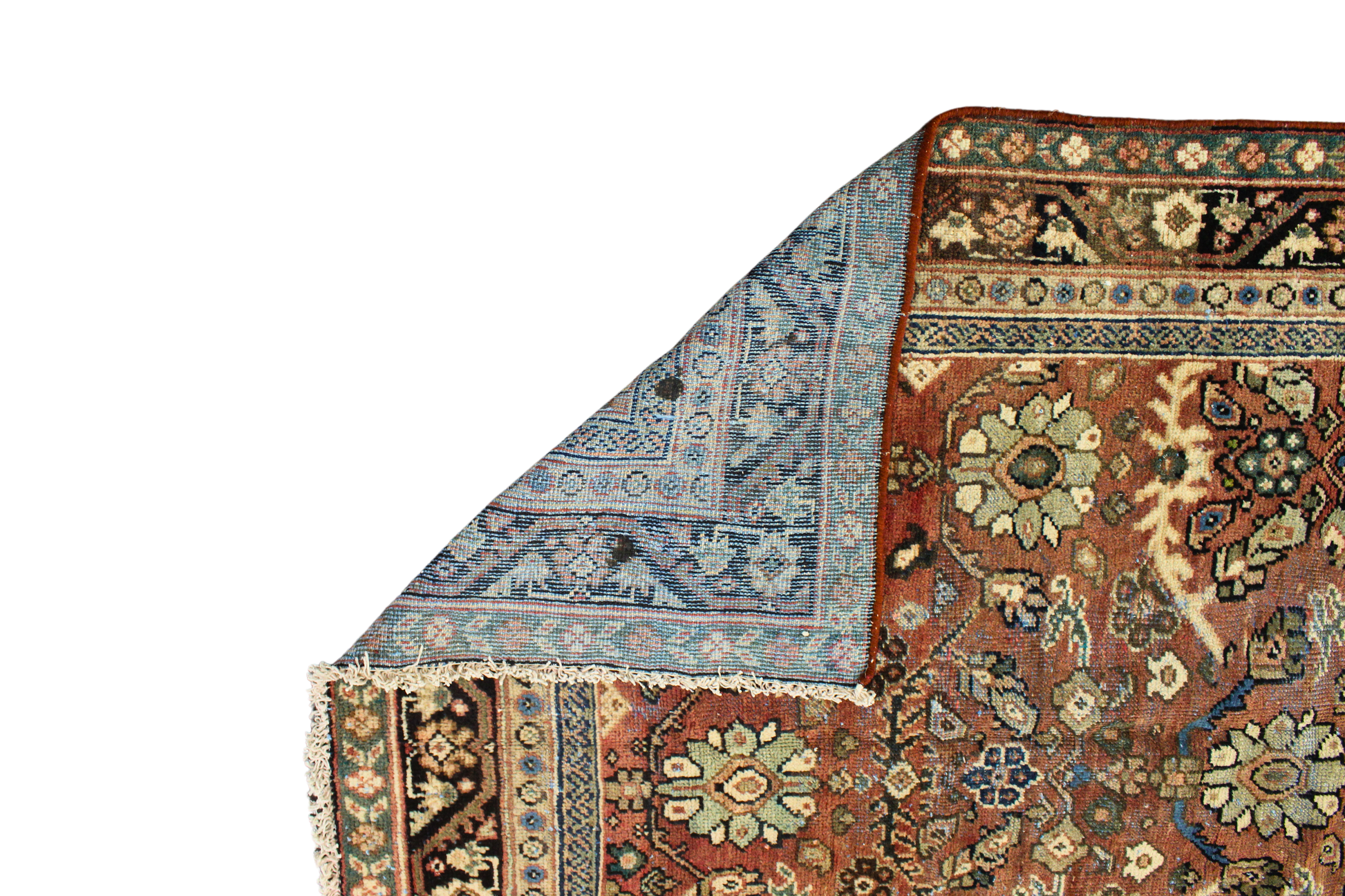 This charming antique Mahal rug features a dense allover floral pattern that radiates energy and warmth. The field is filled with an array of stylized palmettes and rosettes, each outlined in deep navy and set against a soft, aged brick-red ground. Corner spandrels are highlighted with subtle abrash, adding a layer of visual depth and authenticity.