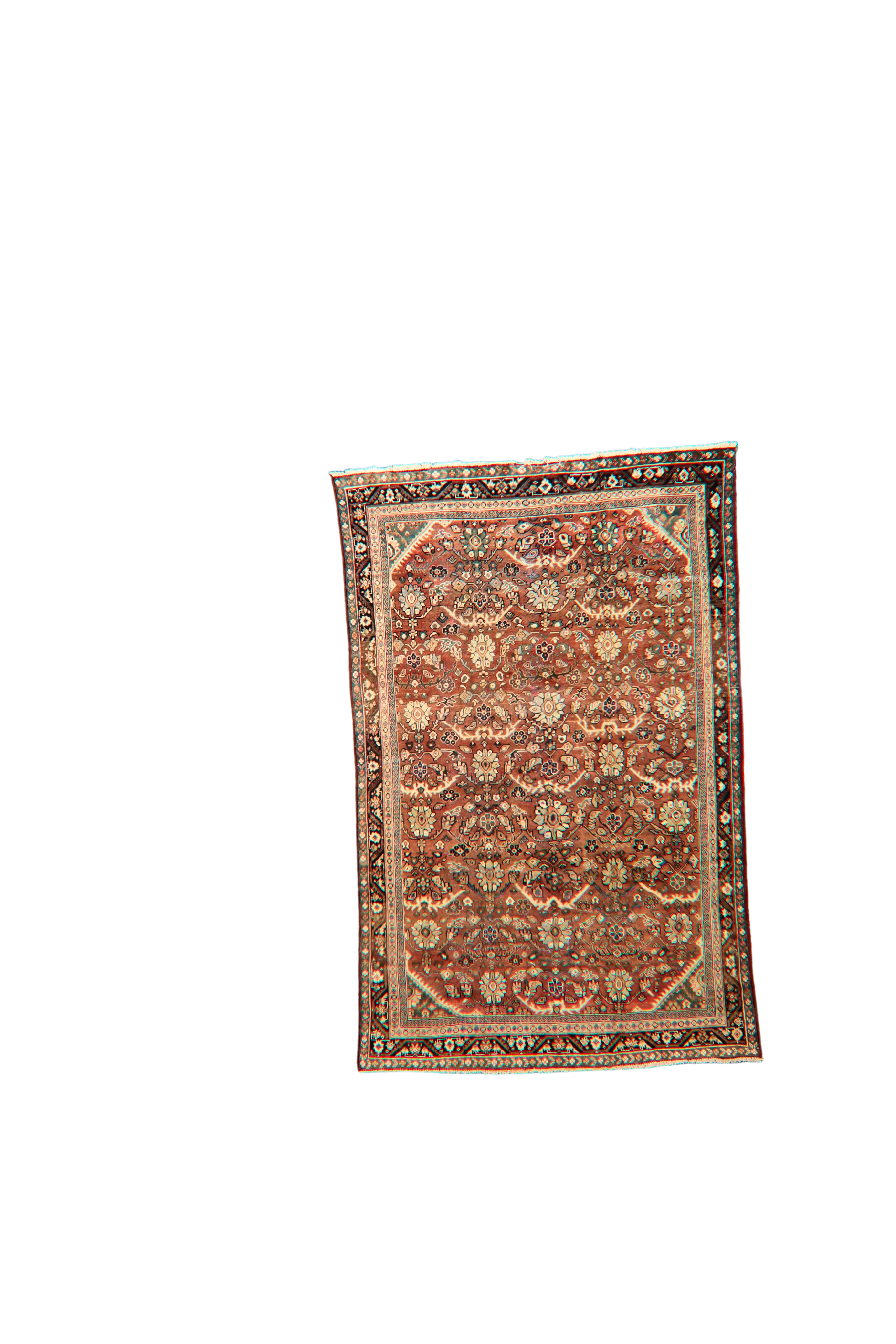 Framed by a classic border of alternating floral and geometric motifs, this piece showcases the playful, organic quality typical of village weaving in the Mahal region. The proportions make it ideal for anchoring a dining room or transitional living space, where its earthy elegance can shine.