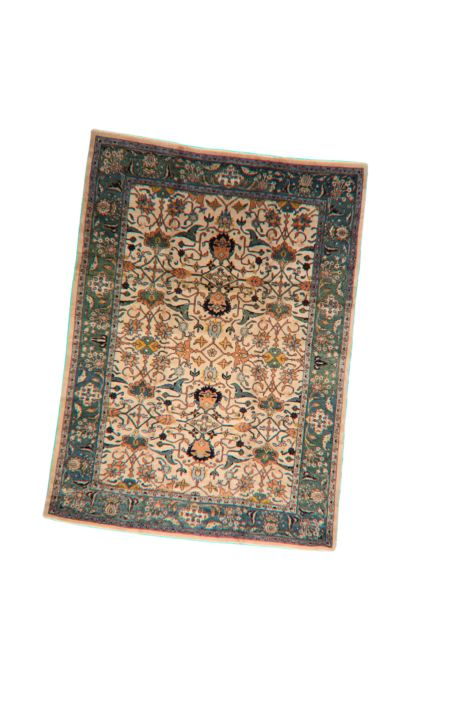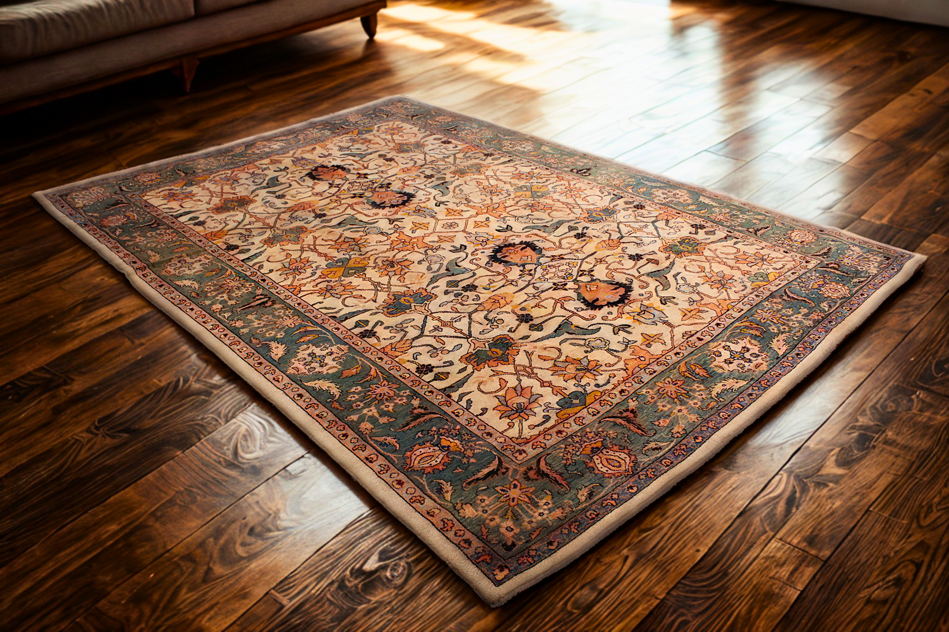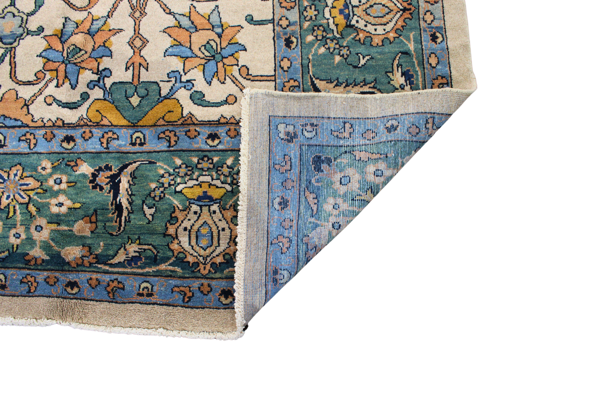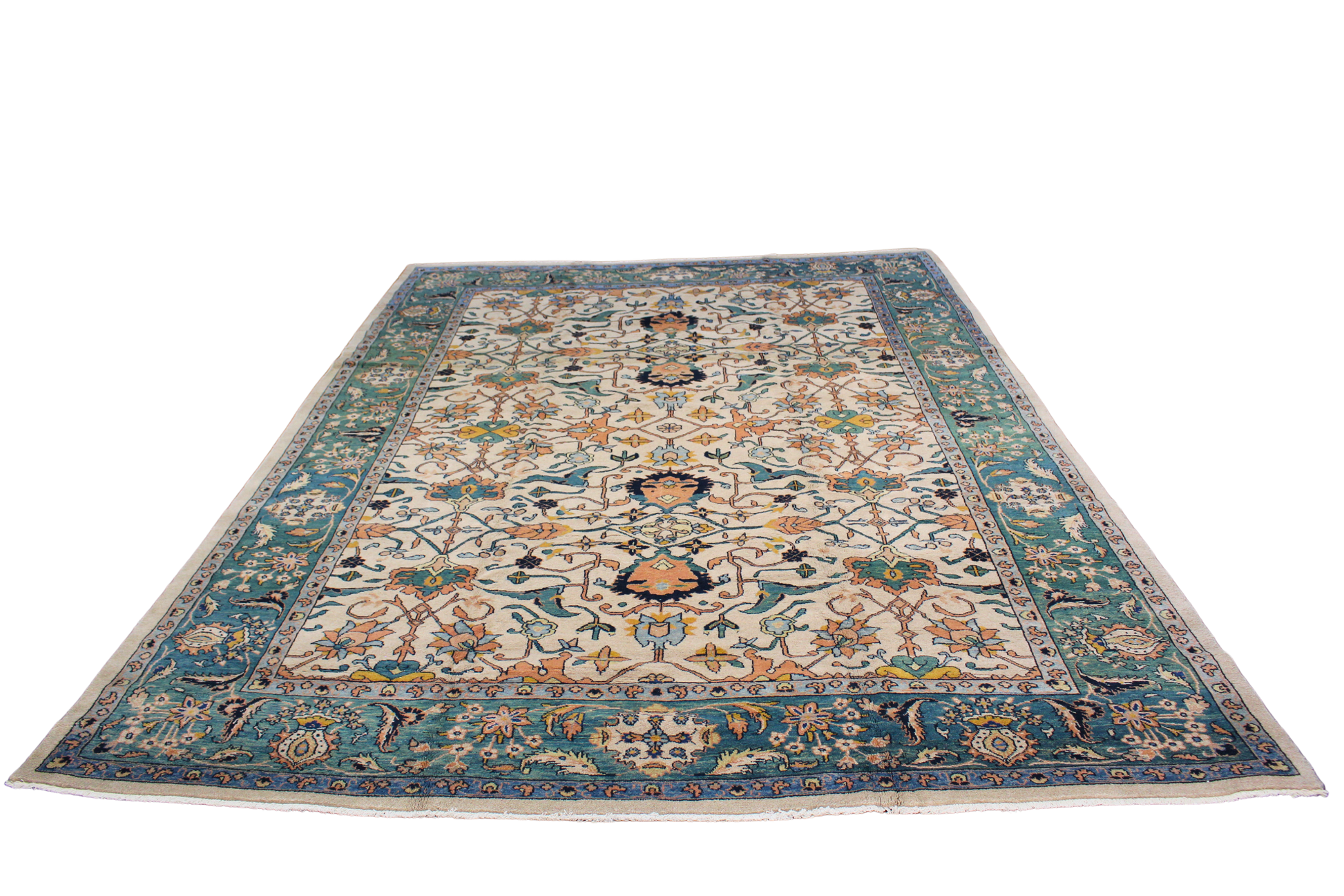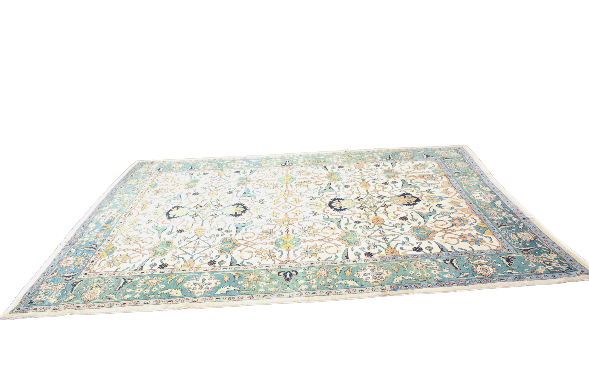 The turquoise-toned border adds a unique framing element, featuring rosettes and arabesques that echo the rug’s field design. The overall composition creates a light and graceful presence, perfect for anchoring living rooms, formal dining areas, or open foyers.