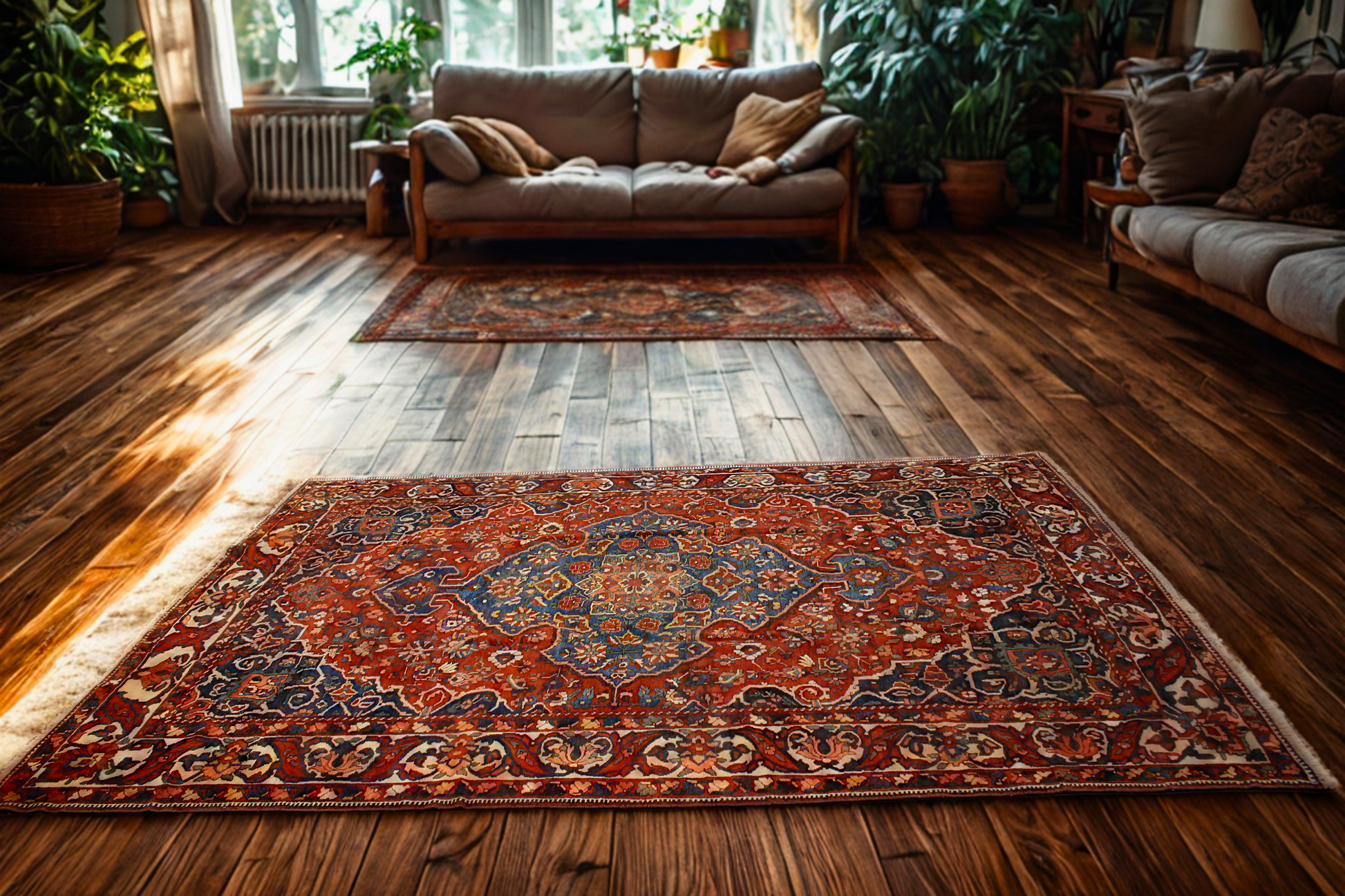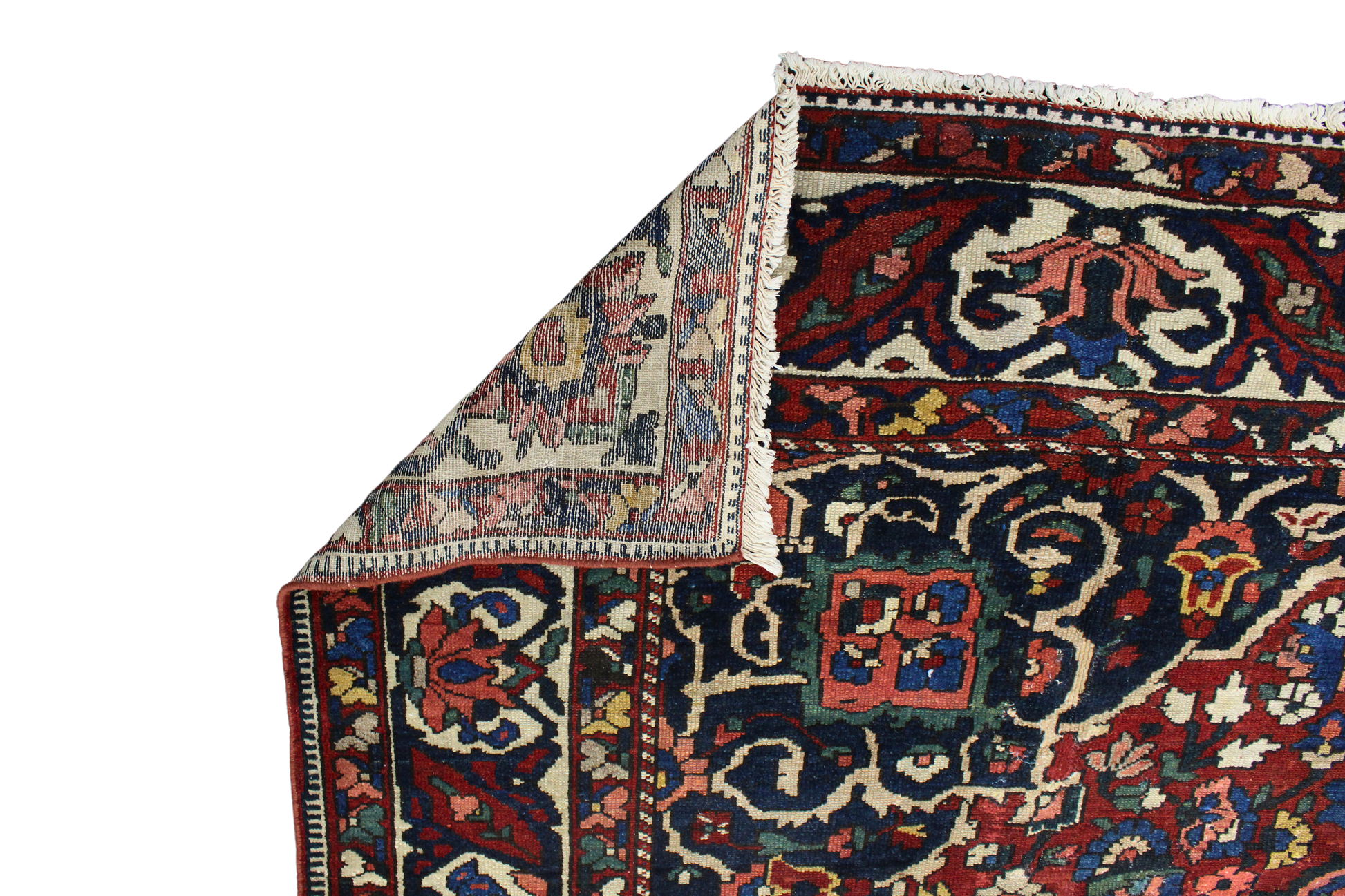 This vivid antique Bakhtiari rug brings bold color and tribal character to any interior. Woven with rich vegetable-dyed wool, the rug features a dynamic central medallion set against a brick red field, surrounded by angular vines, stylized flowers, and corner spandrels in midnight blue and ivory. The robust geometric layout and powerful palette are typical of Bakhtiari village craftsmanship, celebrated for their resilience and aesthetic strength.
