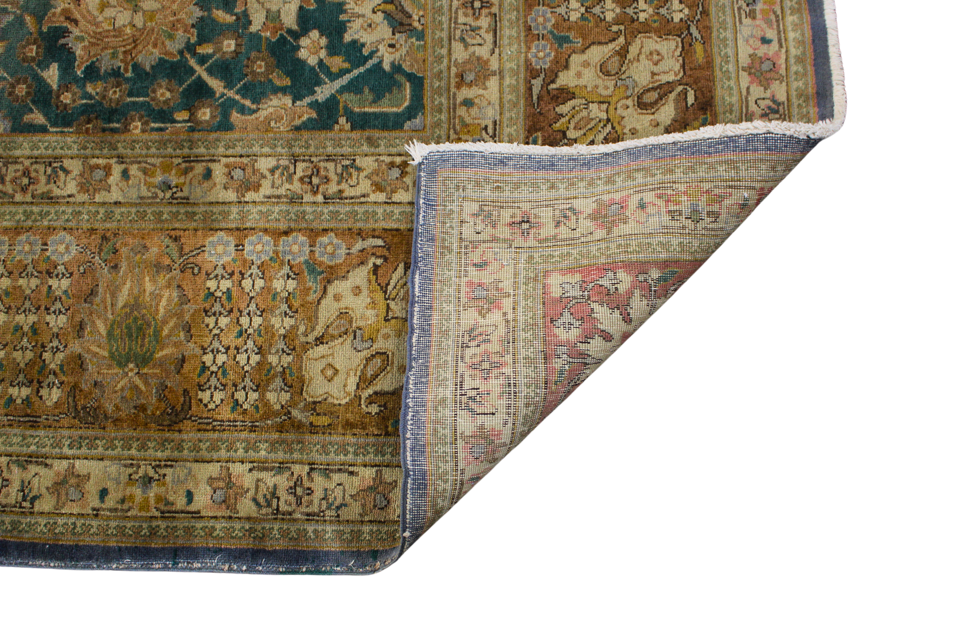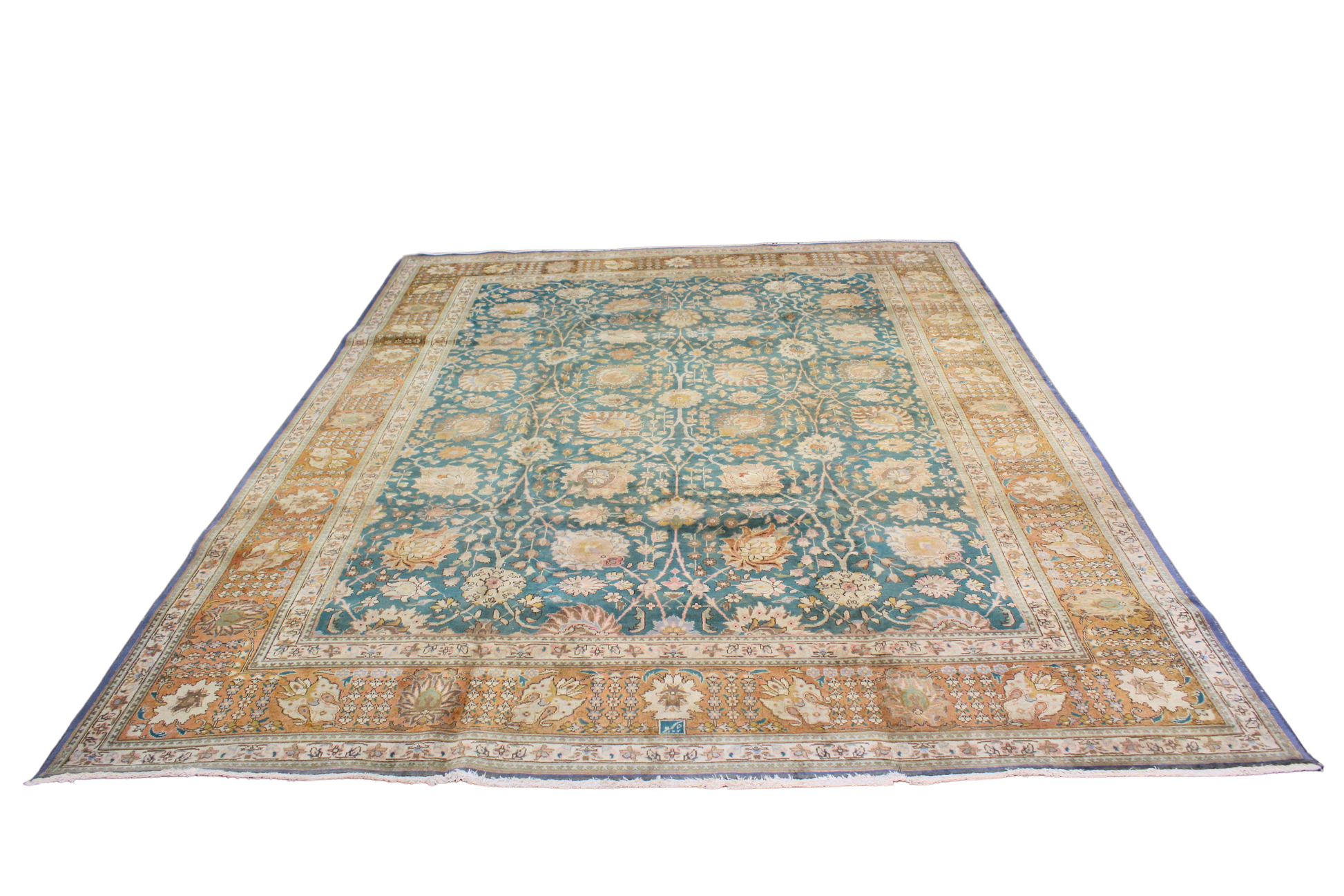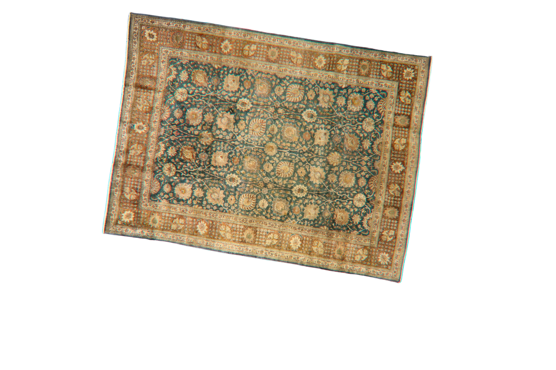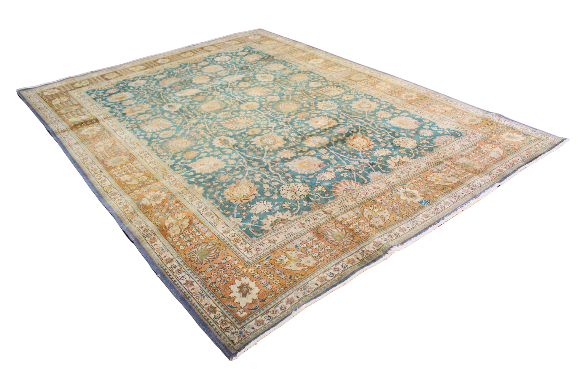 With its distinguished patina and refined floral lattice, this antique Tabriz rug captures the elegance of classical Persian weaving at an exceptional value. The muted teal field is richly decorated with a continuous pattern of scrolling vines and blooming rosettes in soft ivory and gold. A subtle abrashed fade enhances the character and authenticity of this timeworn piece.
