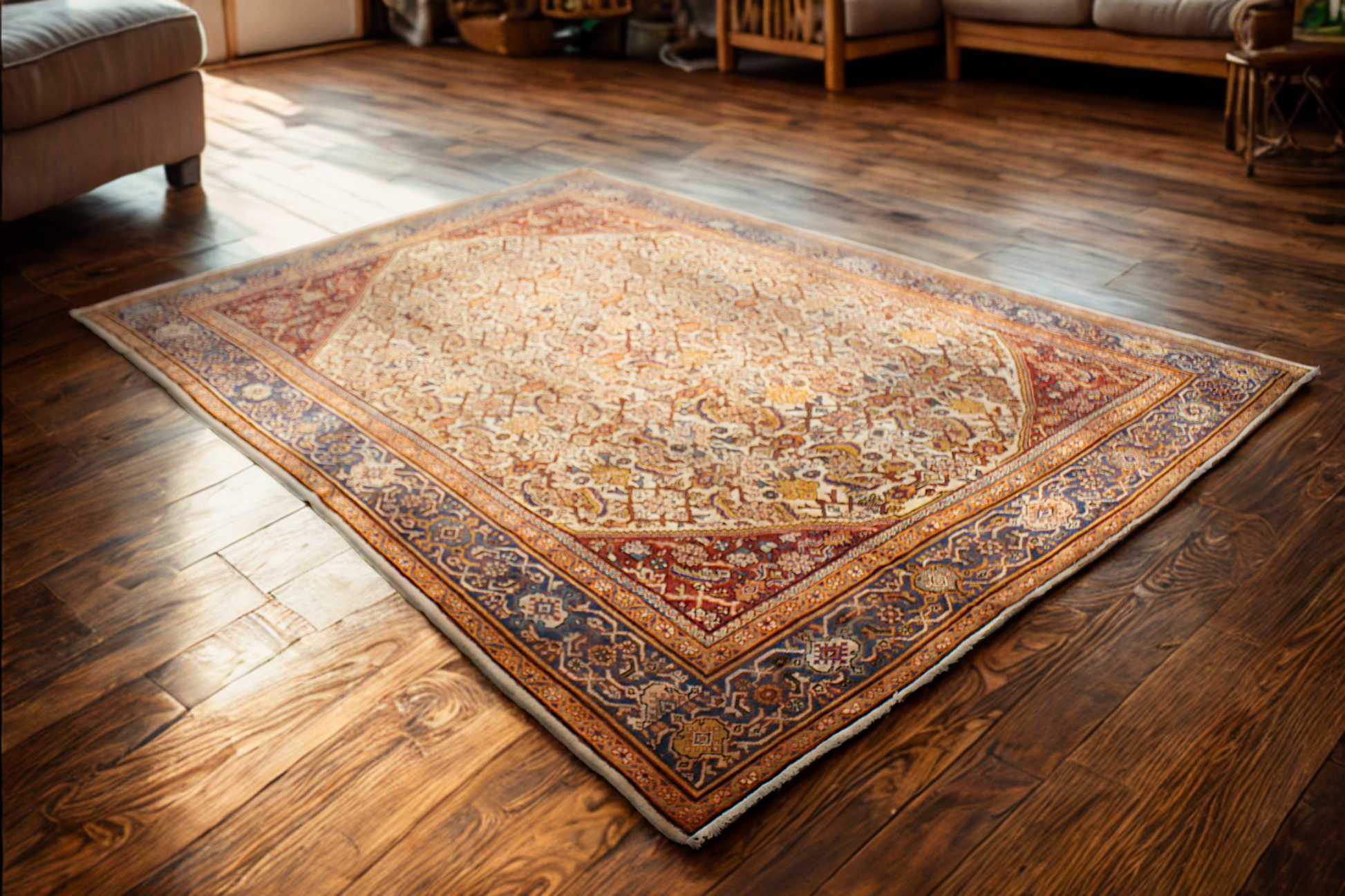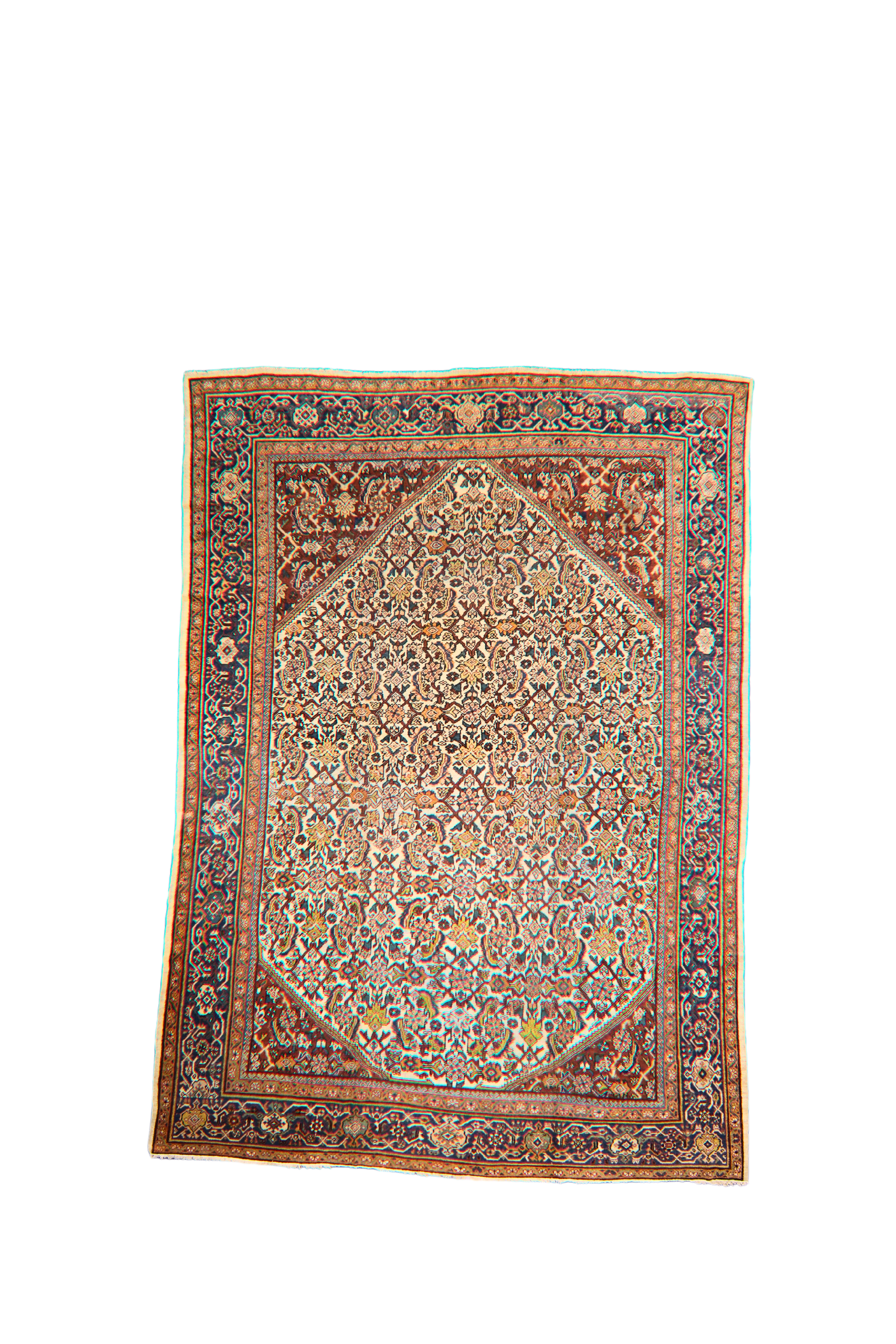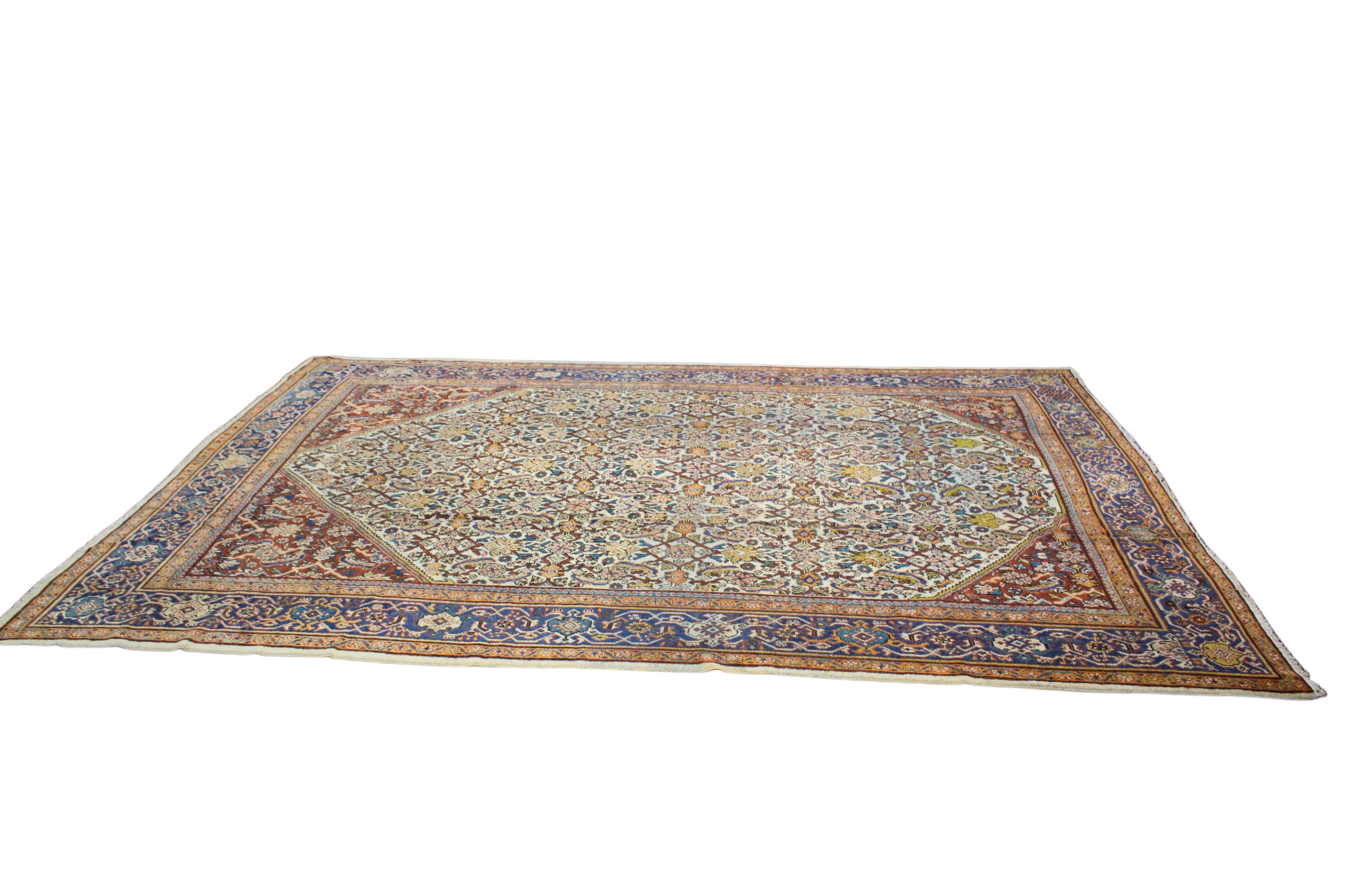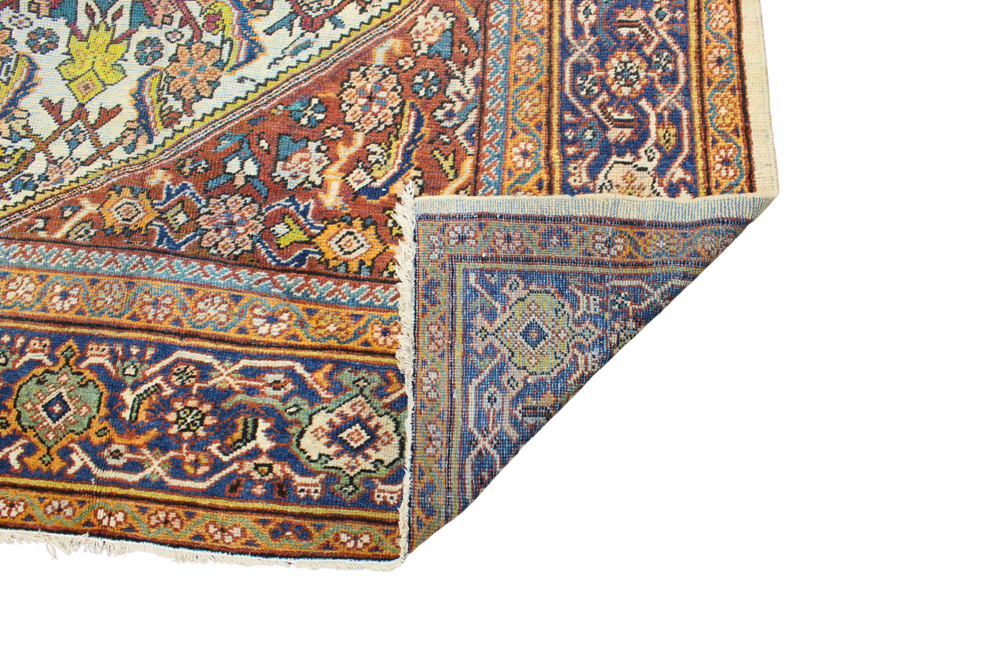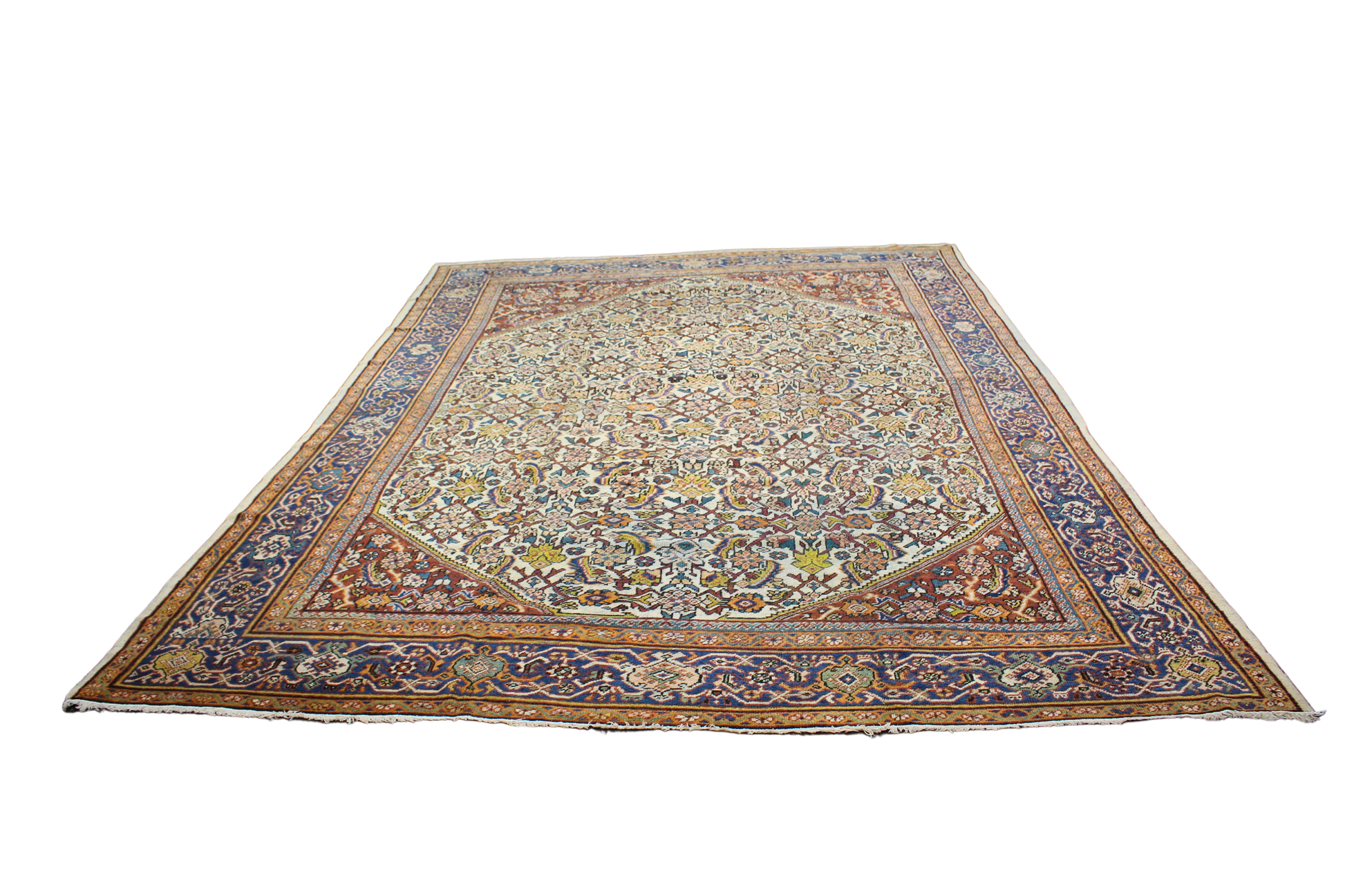 This stunning antique Mahal rug is a masterpiece of Persian village weaving, boasting a refined, directional design with a striking pointed arch-like motif. The cream field is densely packed with an elaborate network of scrolling vines, palmettes, rosettes, and serrated leaves in earthy tones—terracotta, navy, olive, soft gold, and pale blue—all organized in a masterfully balanced composition.