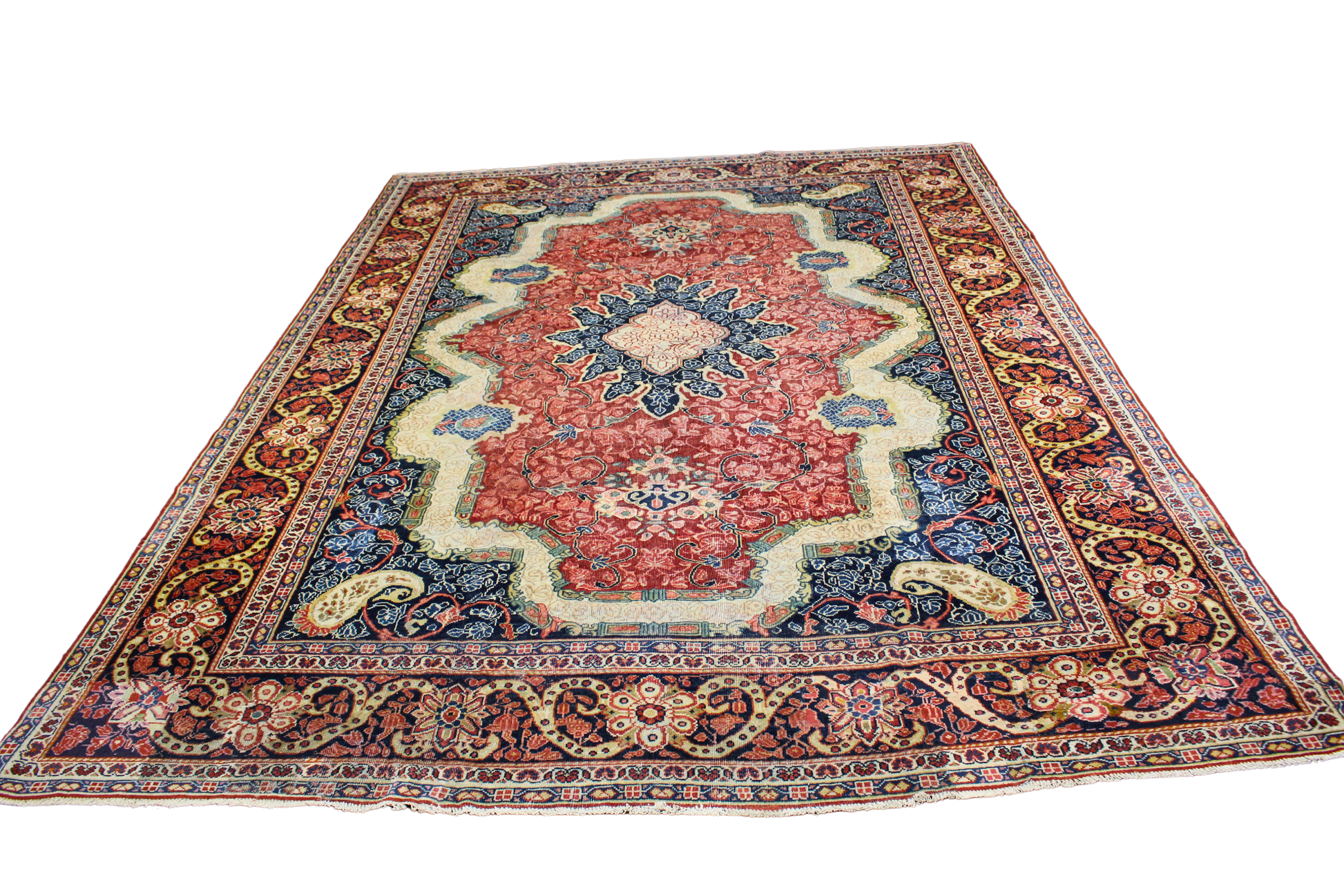 Vibrant and regal, this antique Mahal rug features a striking stepped medallion framed by lush botanical motifs and an ornate, floral border. The bold ruby red field is richly saturated and filled with scrolling vines and palmettes, while shades of midnight blue, ivory, and soft gold lend dramatic contrast throughout the composition.