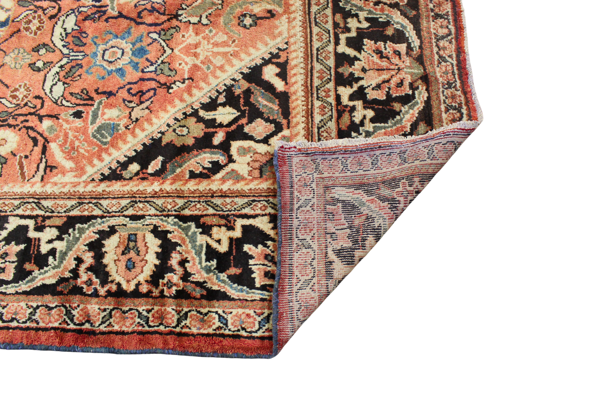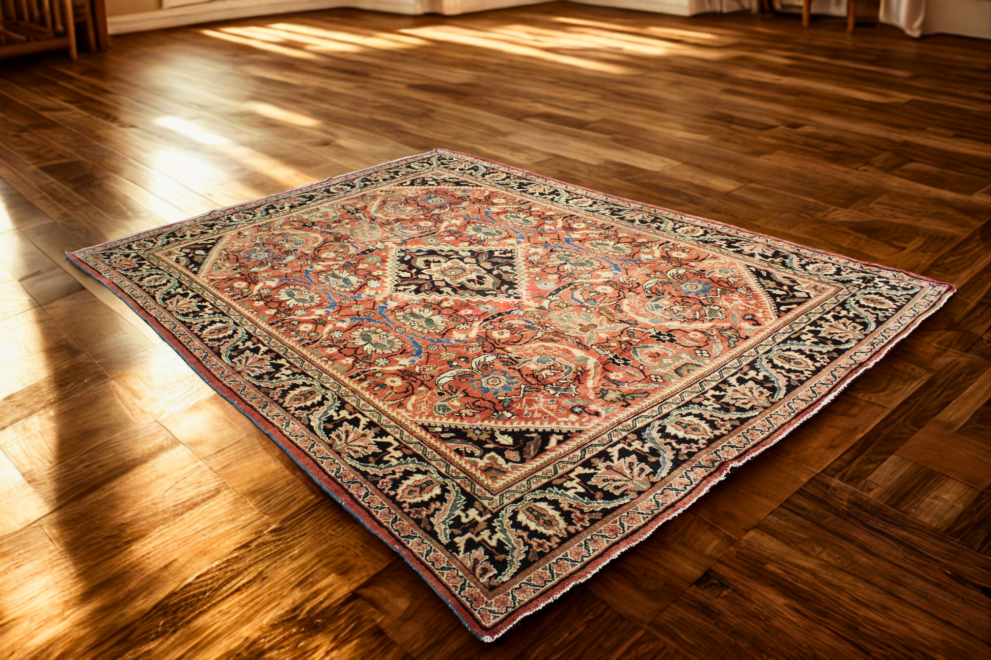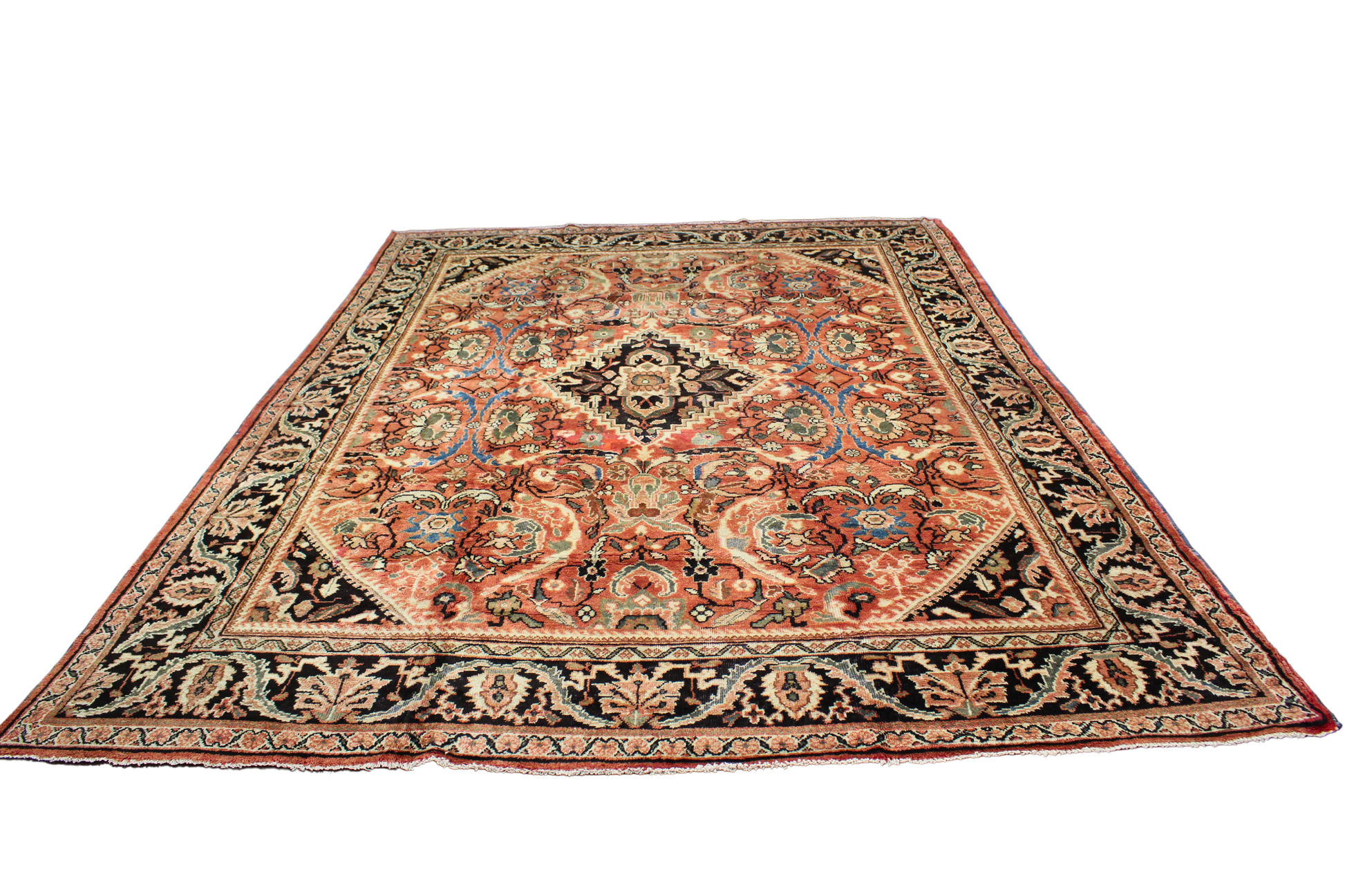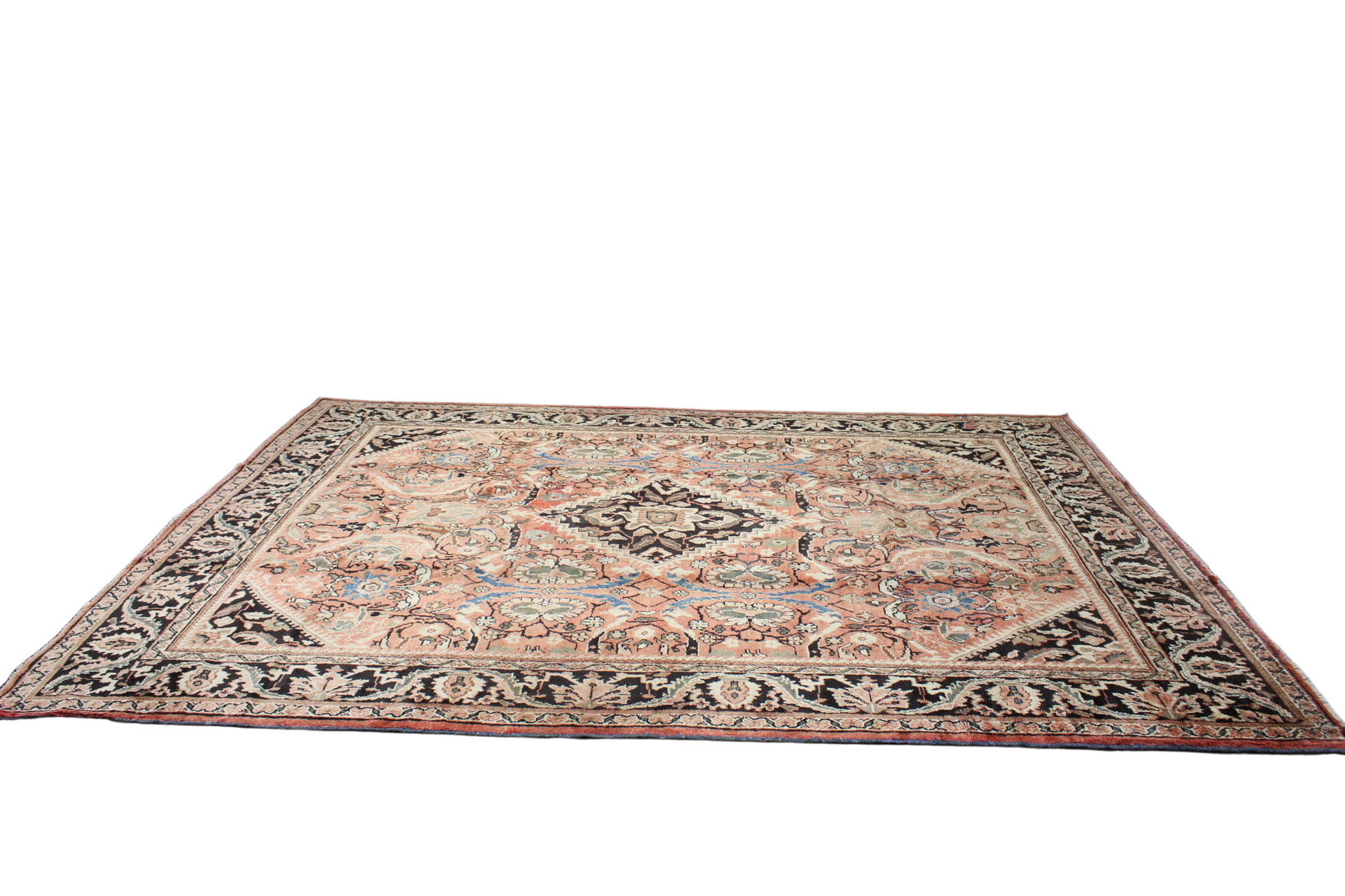 Rich with character and timeless charm, this antique Mahal rug showcases the elegance of classical Persian design. At its heart lies a striking central diamond medallion in dark brown and ivory, gracefully set against a soft rose-beige field filled with stylized floral bouquets and curved vines. The surrounding field bursts with floral symmetry and pale blue accents, framed by dramatic midnight corners and a bold border of scrolling palmettes and serrated leaves in navy and cream.