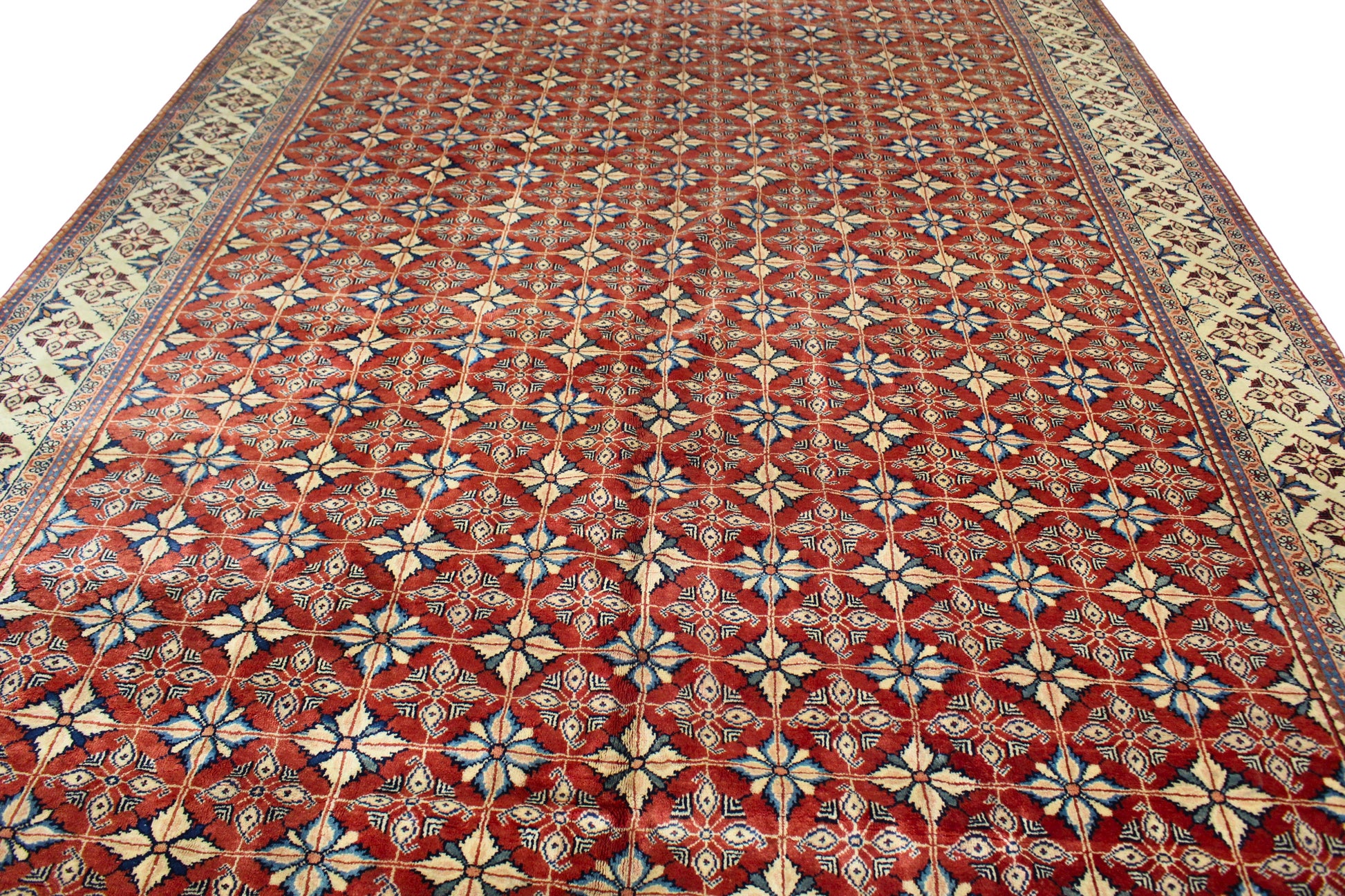 This grand, finely woven Persian rug features a striking allover Herati lattice design that radiates symmetry and precision. Set against a rich madder red field, the repeating diamond-like motifs each hold a rosette encircled by stylized leaves, all rendered in tones of ivory, indigo, and soft green. The main border in ivory adds an elegant contrast with its chain of geometric floral emblems, framed by narrow guard bands.
