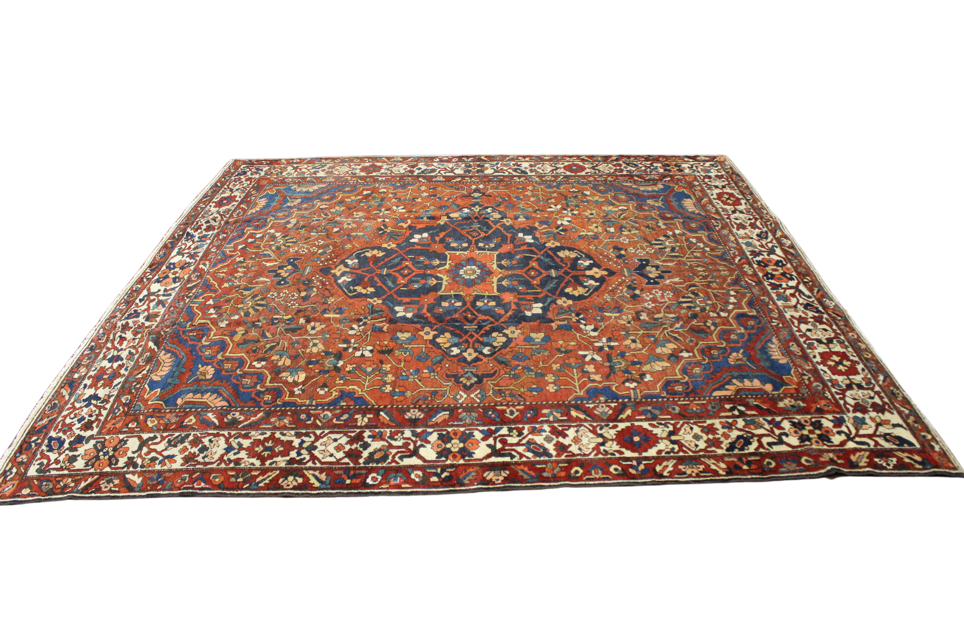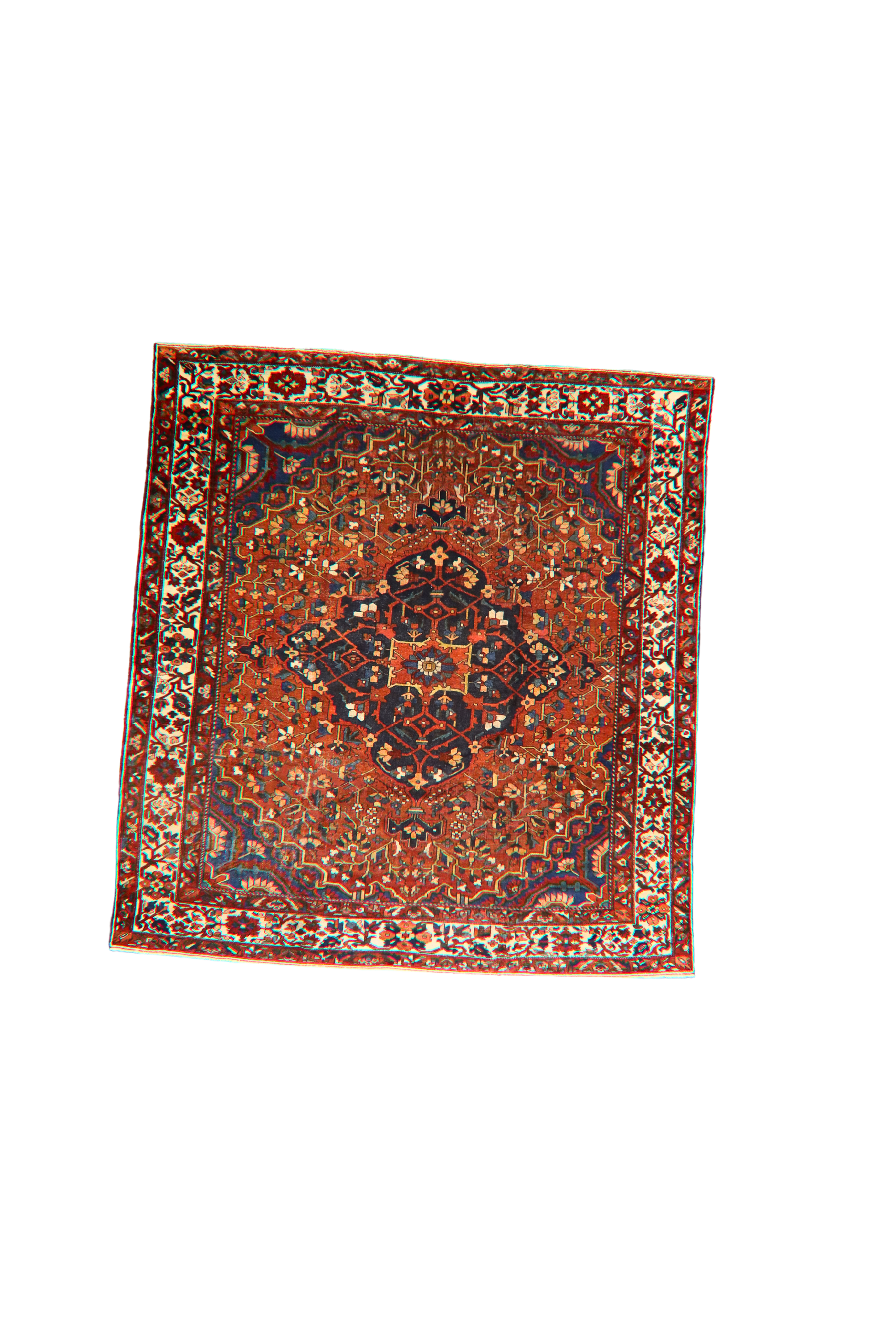 A rare square-format antique Bakhtiari rug, this piece is a powerful statement of tribal artistry and geometric elegance. At its center is a deep midnight-blue medallion brimming with floral and lattice motifs, surrounded by a brick-red field teeming with stylized blossoms, leafy sprays, and branching vines. The stepped corners in cobalt and indigo tones add a bold architectural frame, while the ivory border brings light and contrast to the composition.