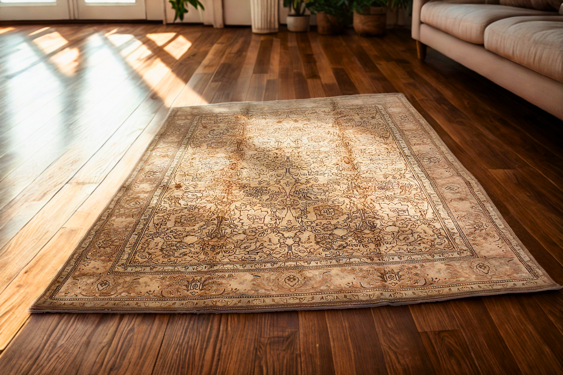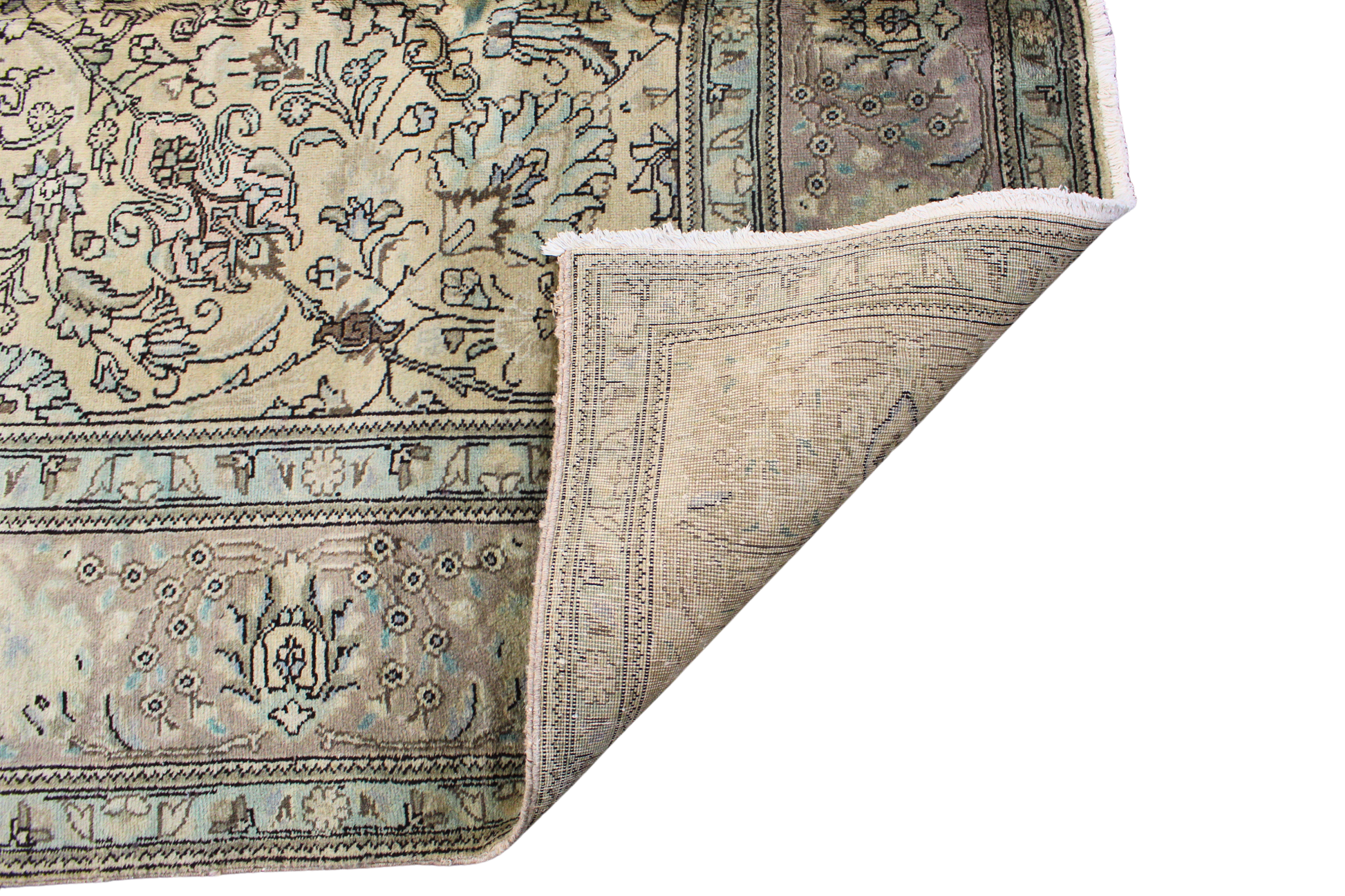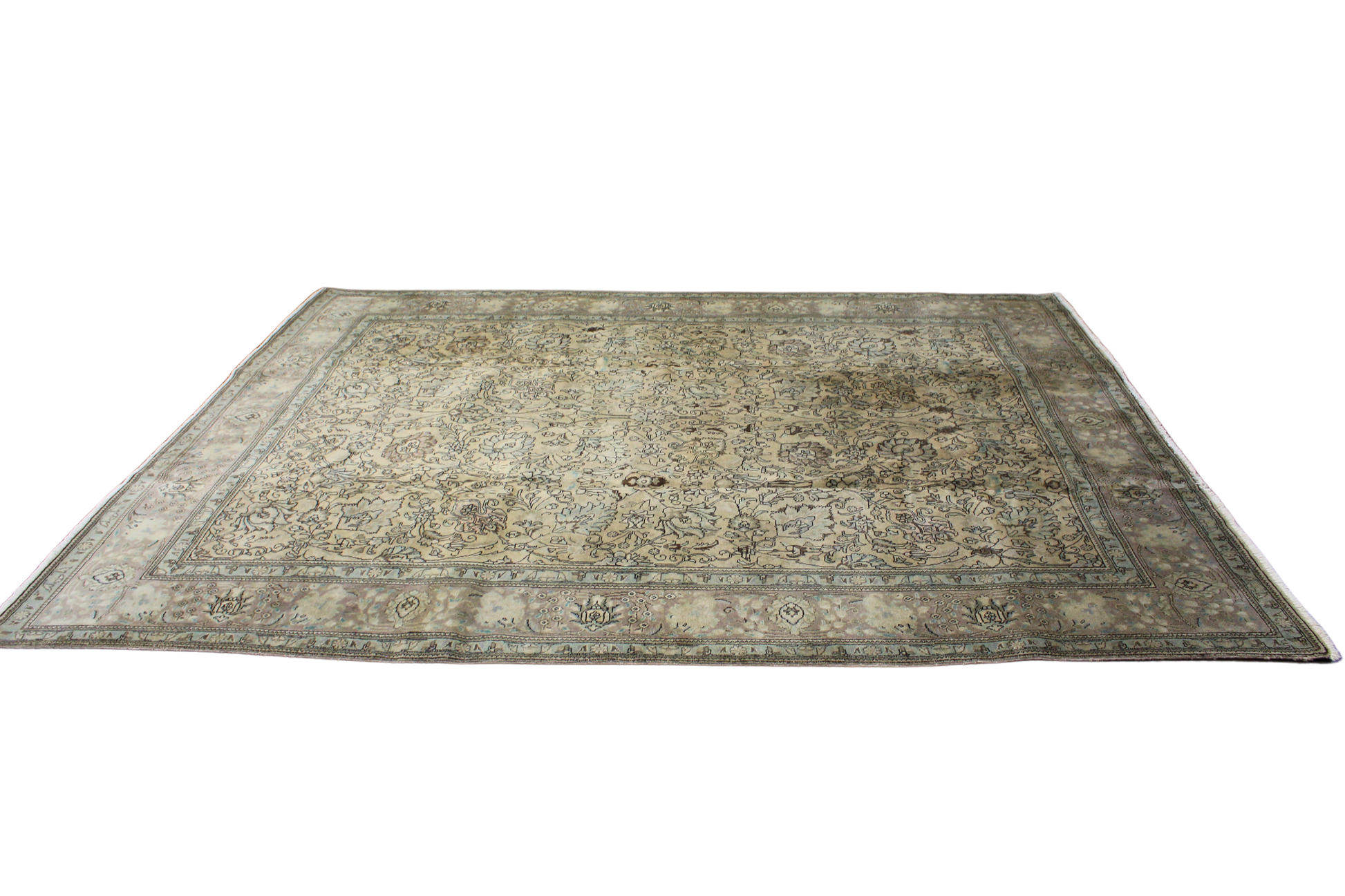 Delicately refined and tastefully subdued, this antique Tabriz rug offers a soft, luminous palette that sets it apart. The ivory-beige field is intricately filled with scrolling vines, palmettes, and rosettes, woven with precision into a floral latticework that radiates elegance. The refined border, featuring complementary tones of pale sage and muted taupe, frames the piece with grace and symmetry.