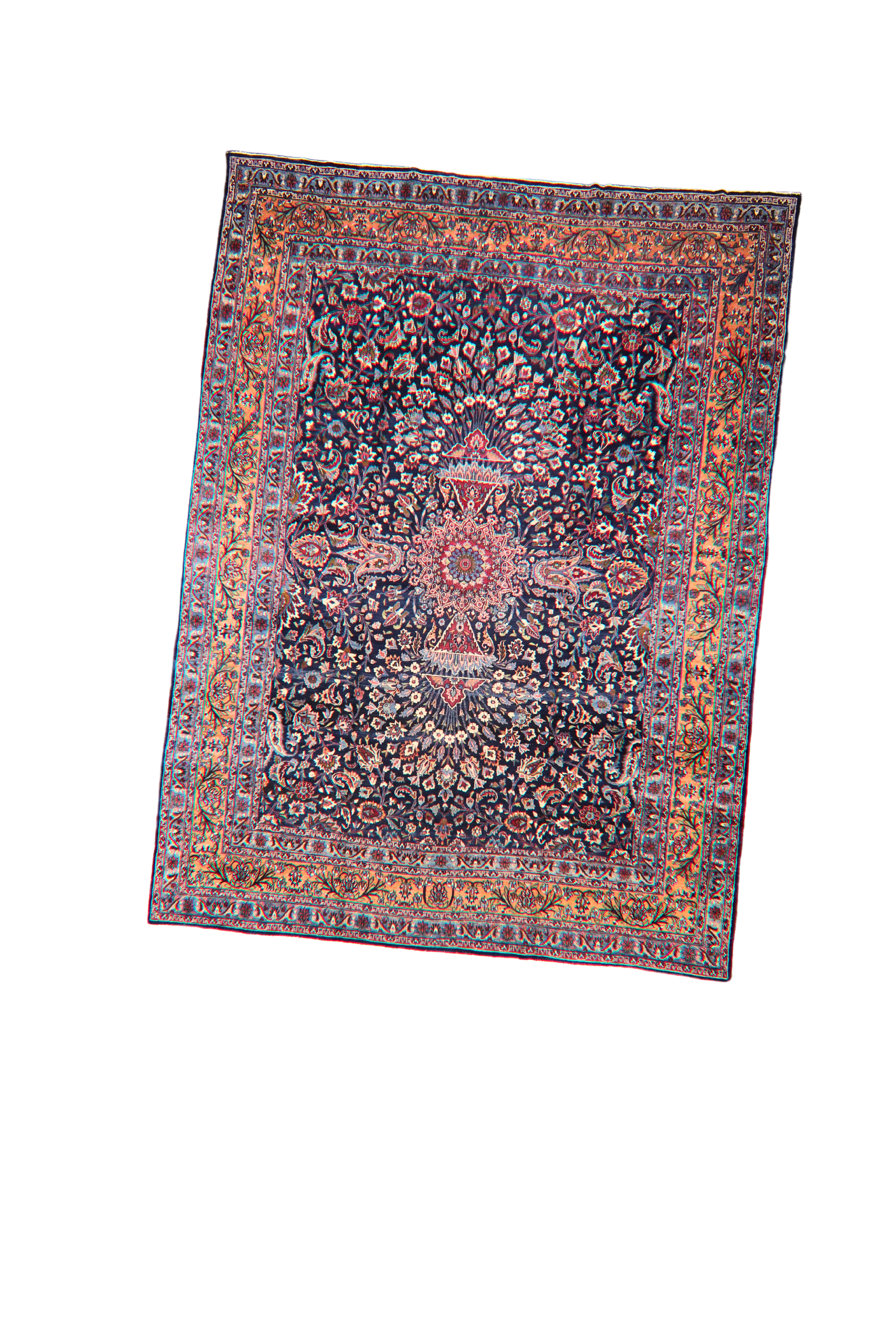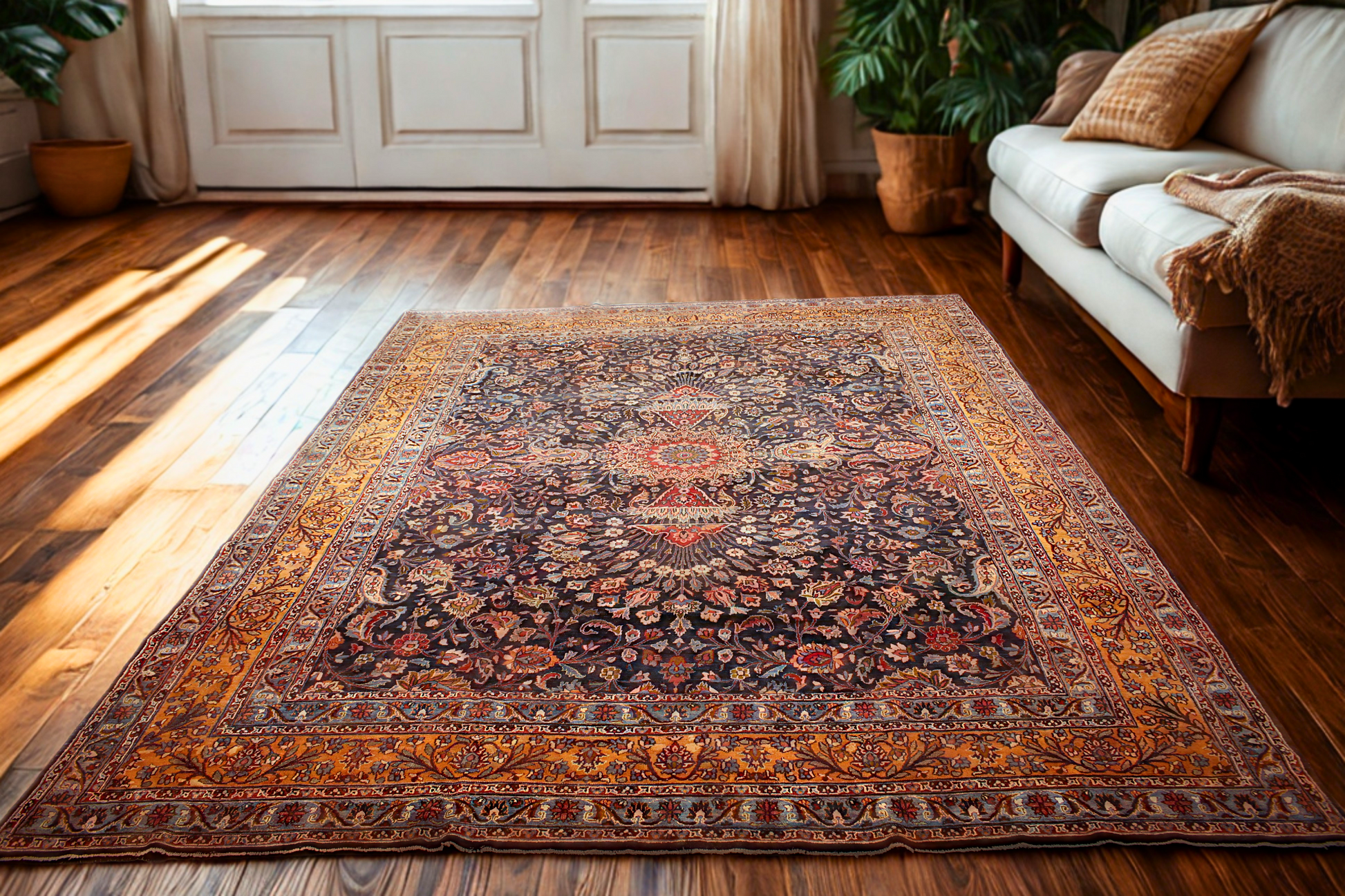 Framed by a wide saffron-toned border with trailing lotus and vine motifs, this rug makes a powerful statement of elegance and legacy. Ideal for a formal living room, library, or grand entryway, it brings a regal and timeless atmosphere to any setting.