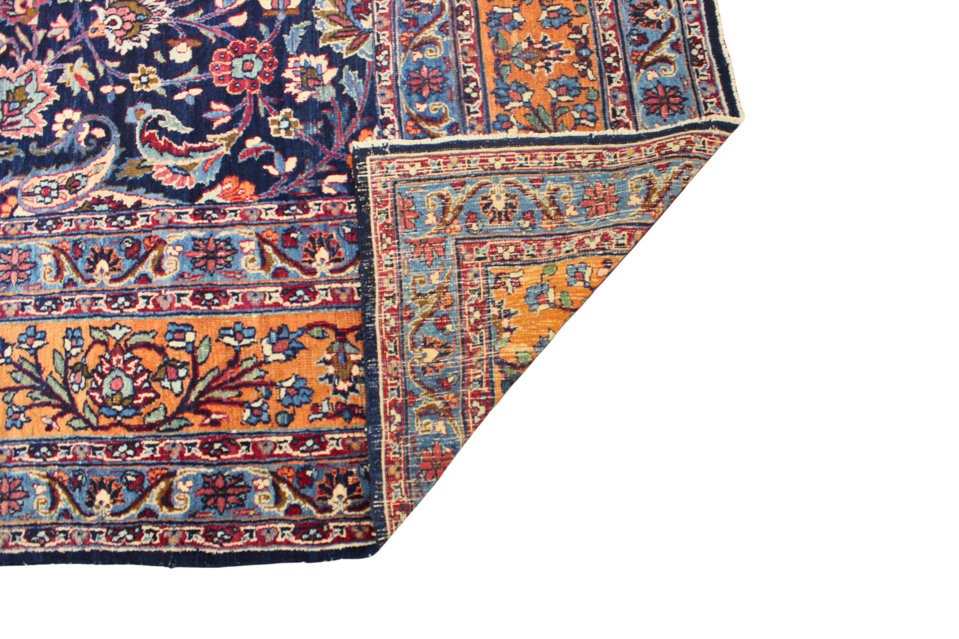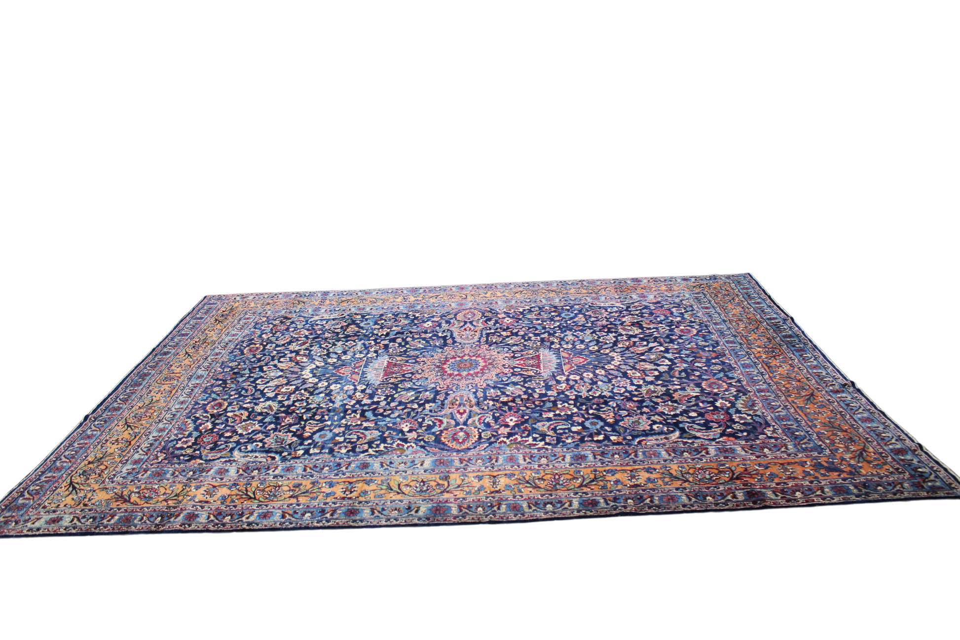 This antique Mashad rug presents a breathtaking display of classical Persian artistry, anchored by a richly detailed central medallion that radiates across a deep midnight blue field. The floral arabesques and scrolling vines burst with energy, featuring shades of rose, ivory, soft blues, and golden ochre. The intricate drawing of each element showcases the high knot density and refined craftsmanship typical of Mashad weavers.