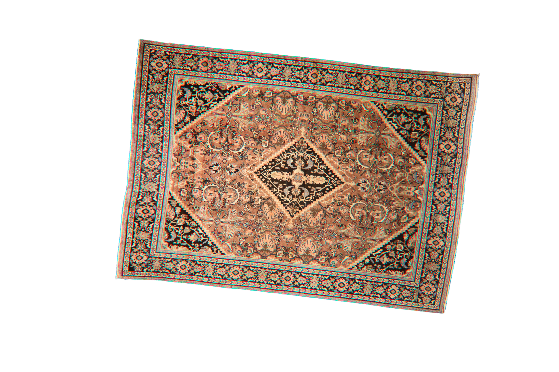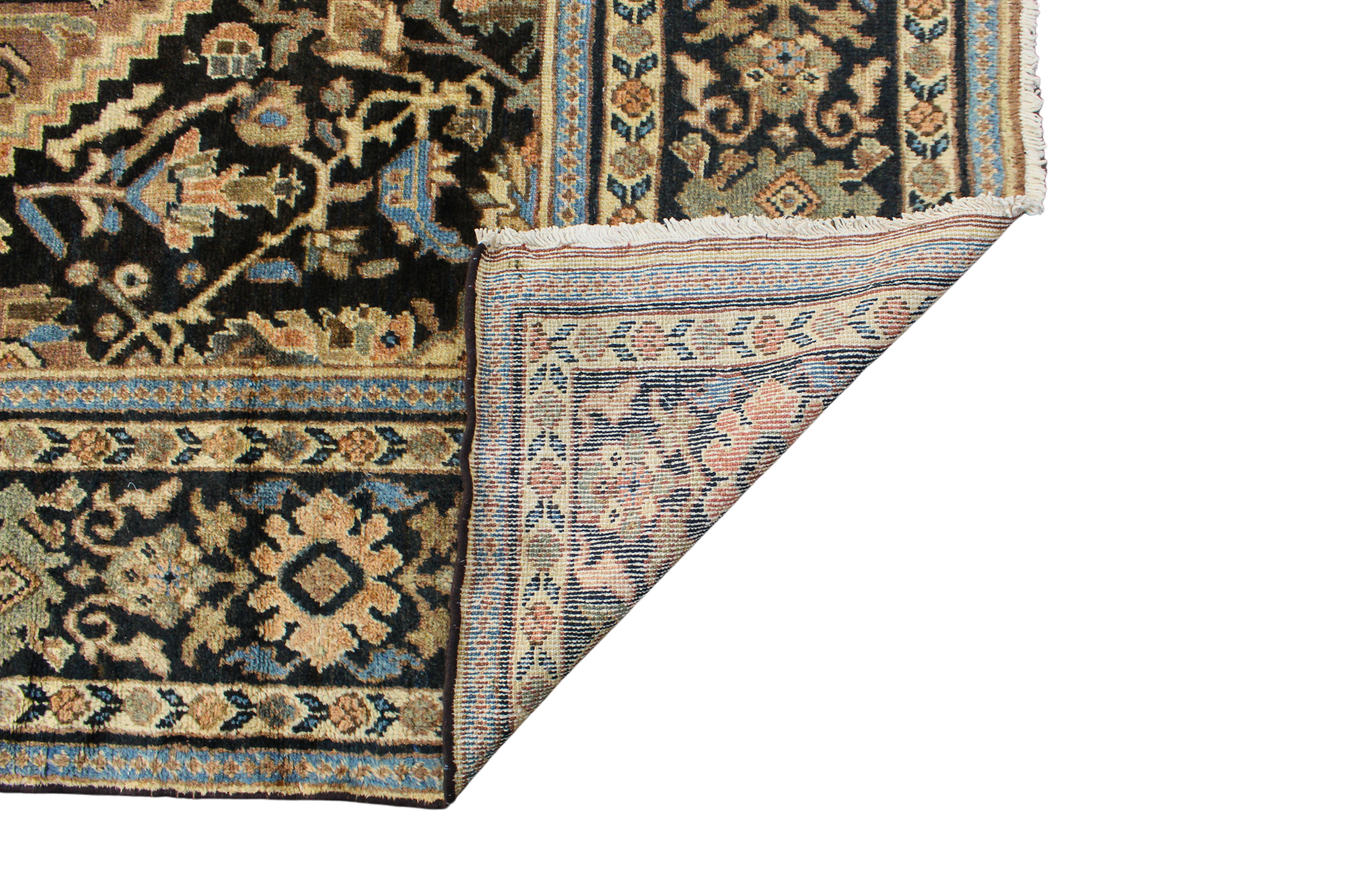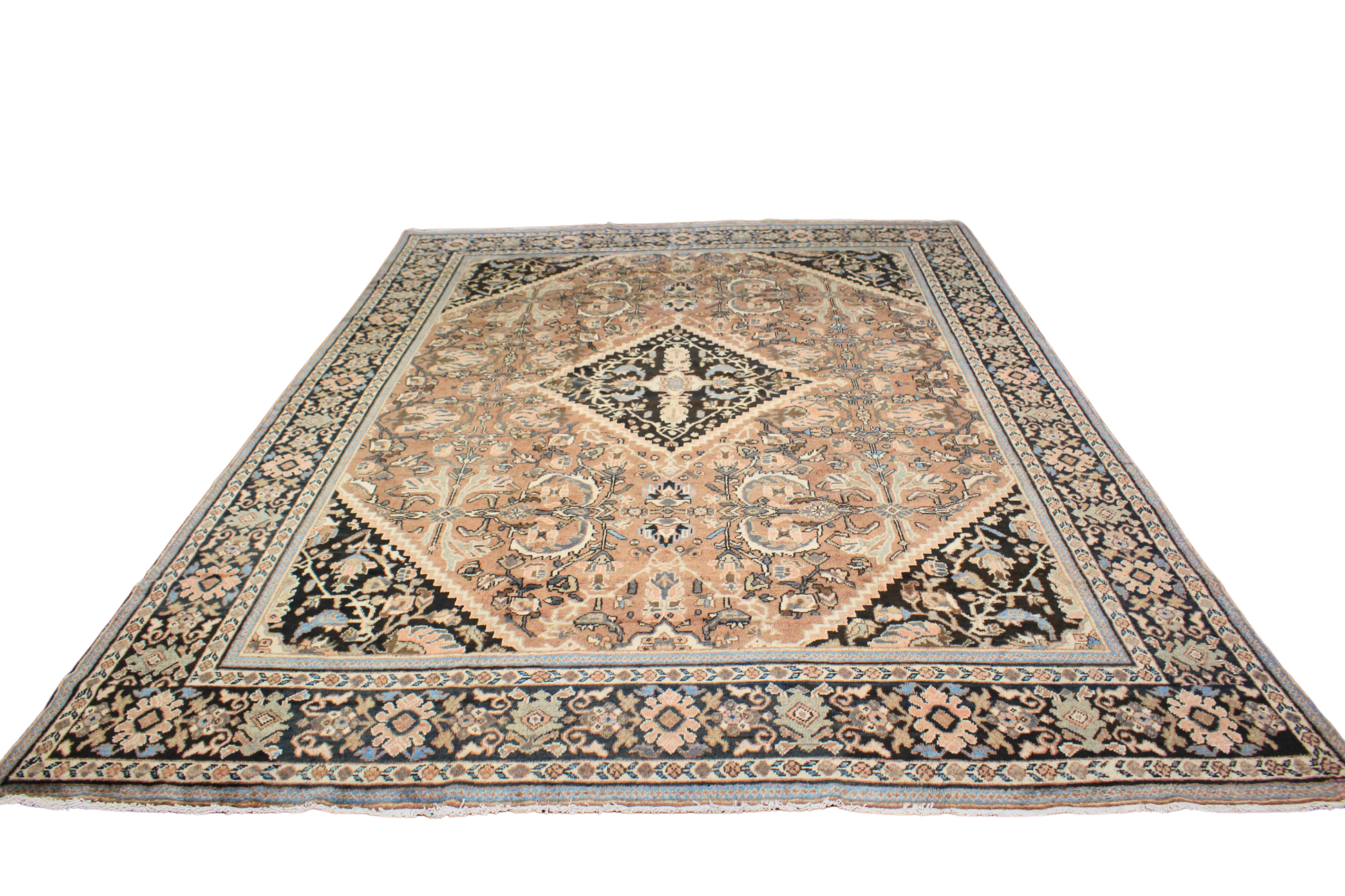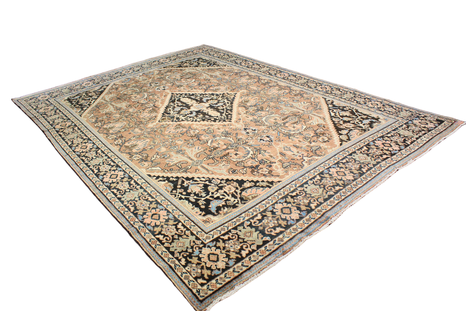 With its deeply muted rose and espresso palette, this antique Mahal rug offers a rare and refined take on classic Persian elegance. The central diamond medallion—set in a deep brown field with intricate ivory floral motifs—anchors the composition with gravitas. Surrounding it, an all-over scrolling vine and floral arrangement in soft shades of sand, mocha, and pale jade give the rug a soothing, stately character.