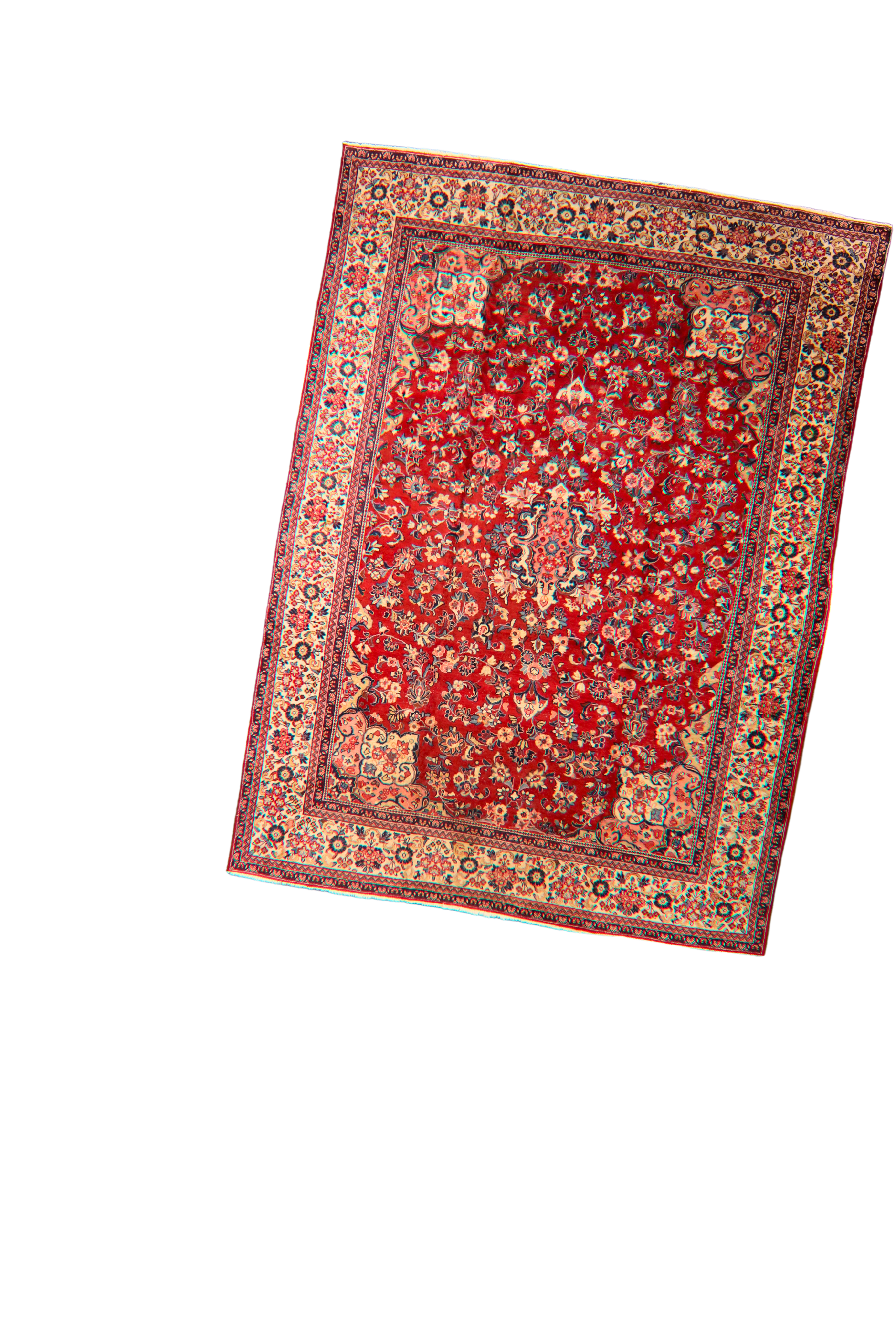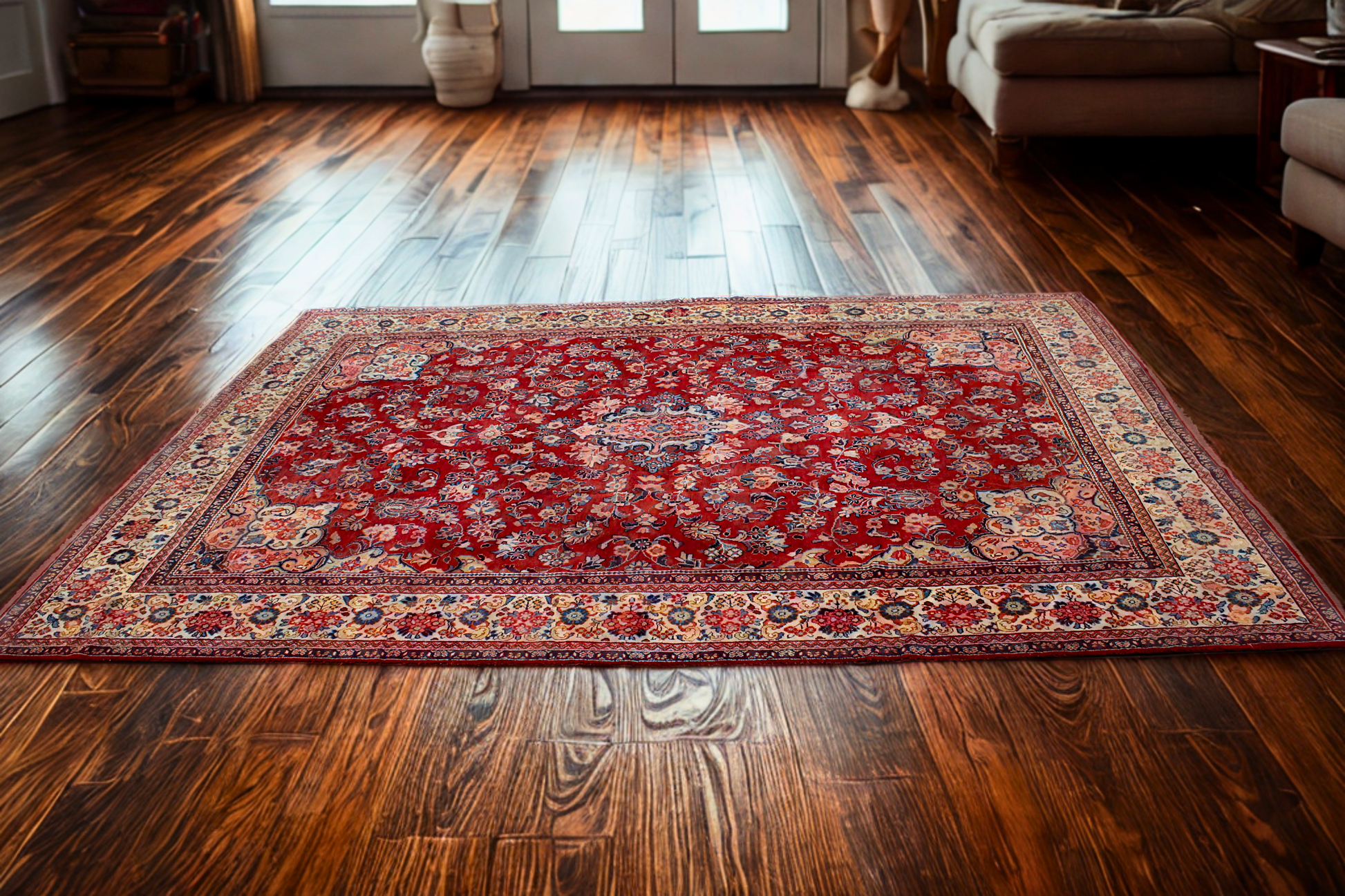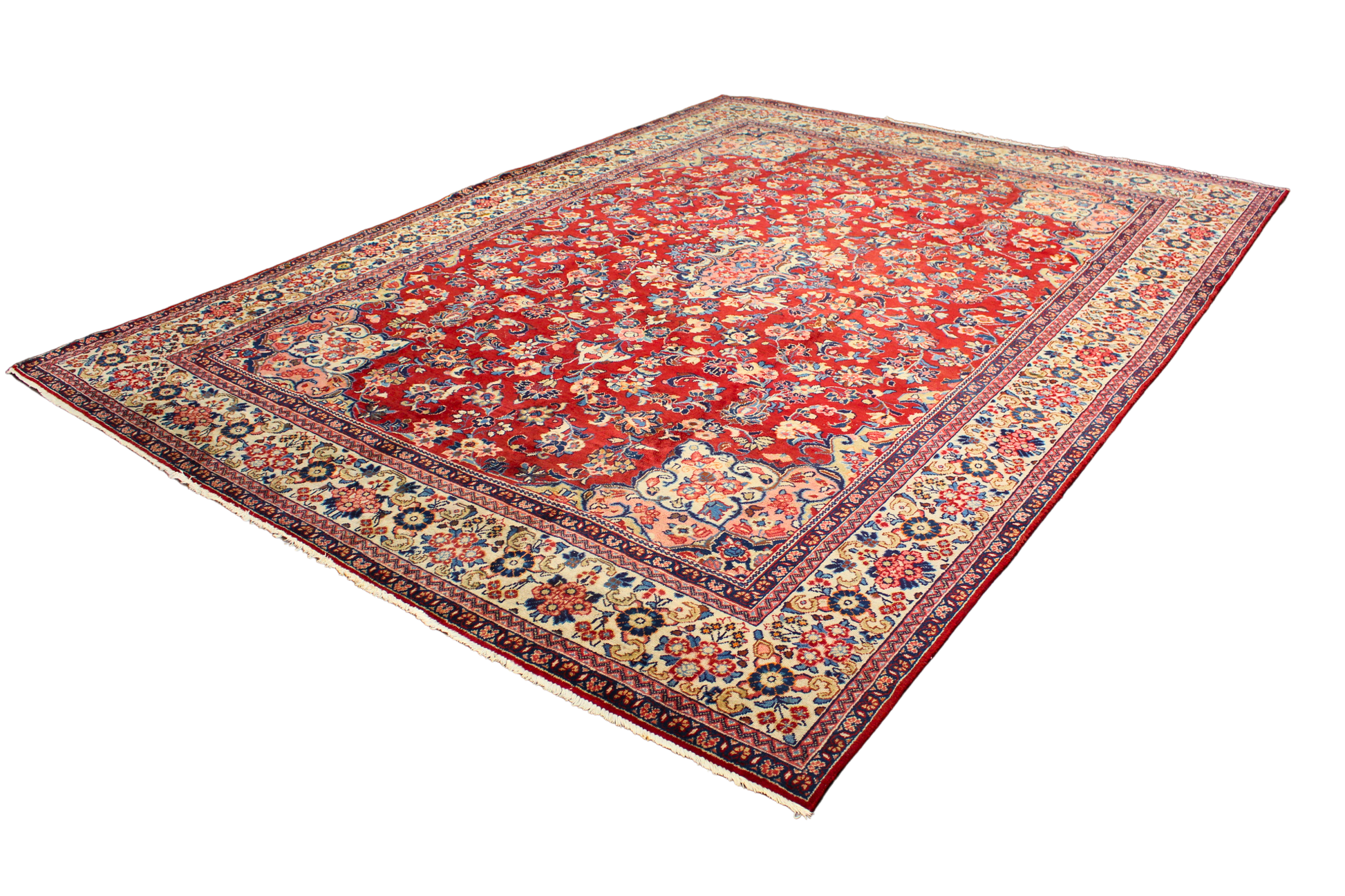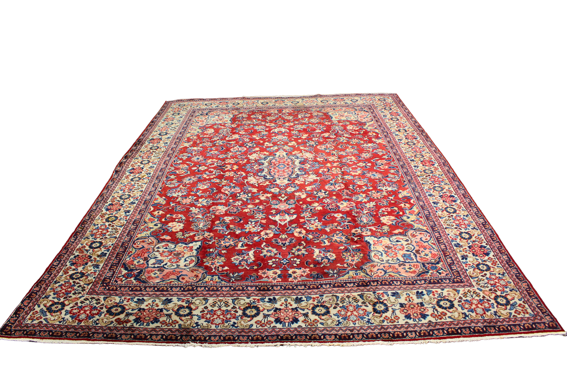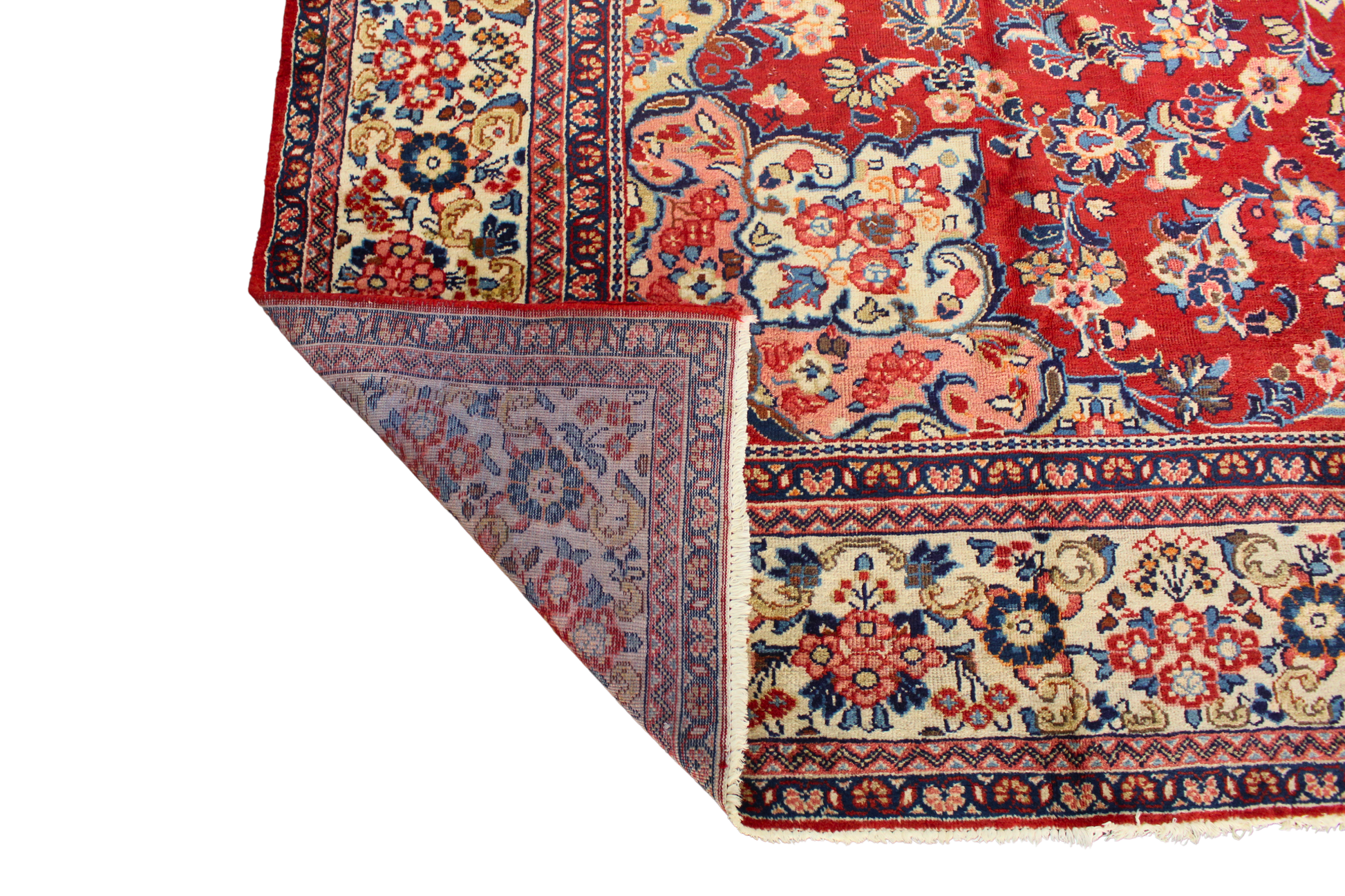 This richly detailed antique Mahal rug radiates classical Persian artistry with its luminous red field and elaborate floral arrangement. At the center lies a delicate, curvilinear medallion in ivory and navy, gracefully anchoring the symmetrical pattern of scrolling vines and blooming palmettes that flourish across the surface. Corner spandrels mirror the central medallion, adding further harmony and elegance to the composition.