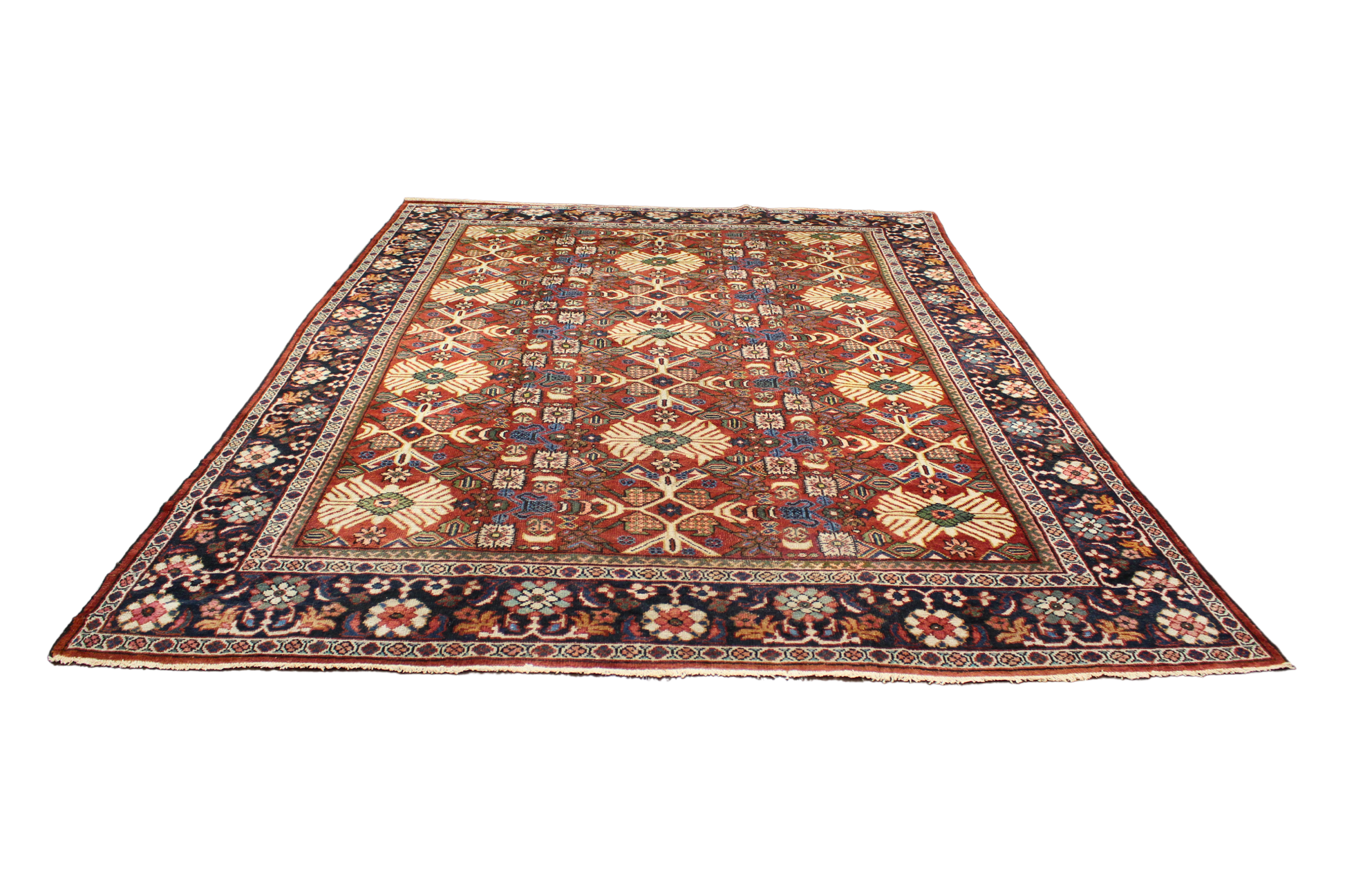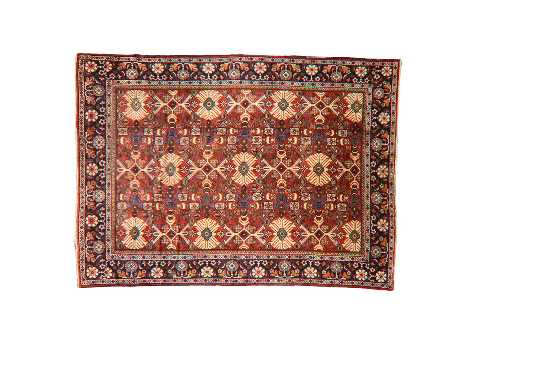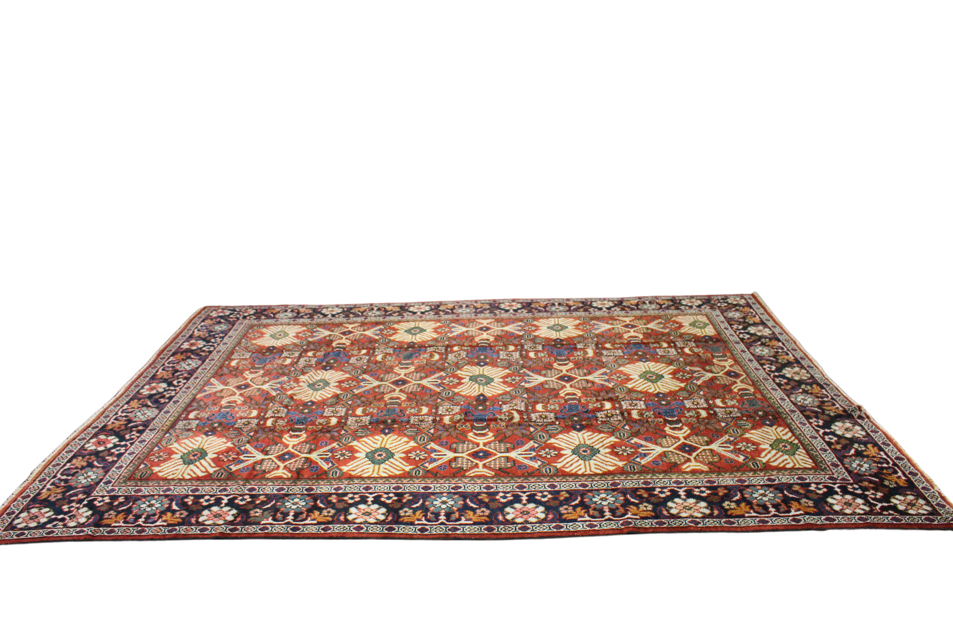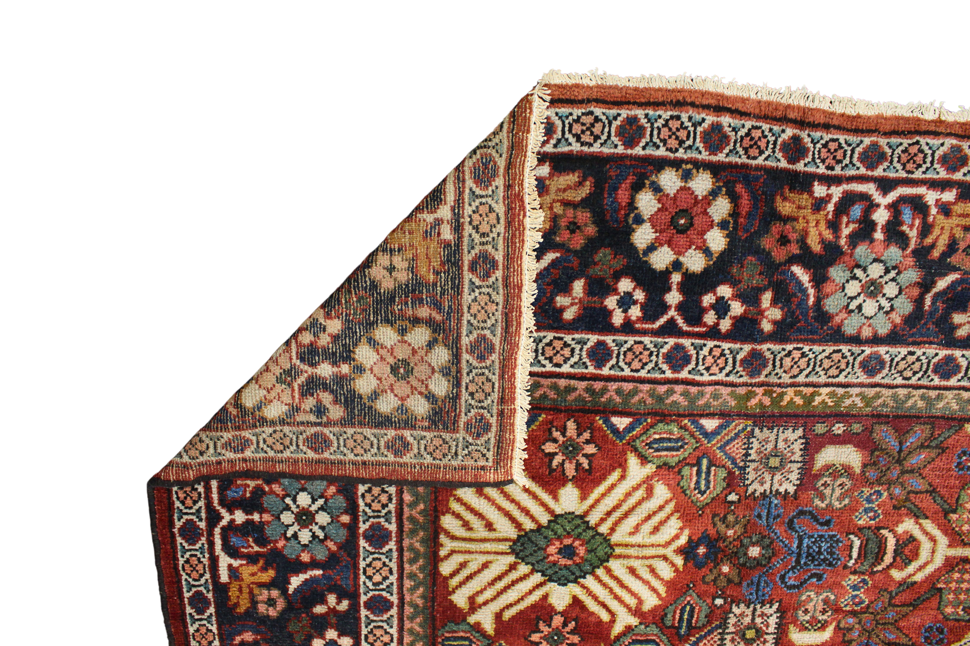 This striking antique Mahal rug is a rare example of graphic tribal geometry rendered through the refined craftsmanship of Persian village weavers. Its field features a lattice of ivory and terracotta medallions, each enclosing stylized floral bursts, flanked by angular vines, palmettes, and small blossoms arranged in rhythmic symmetry. The ivory accents provide balance and lightness across the warm red ground, while jewel tones of sapphire, forest green, and rose add dimension throughout.