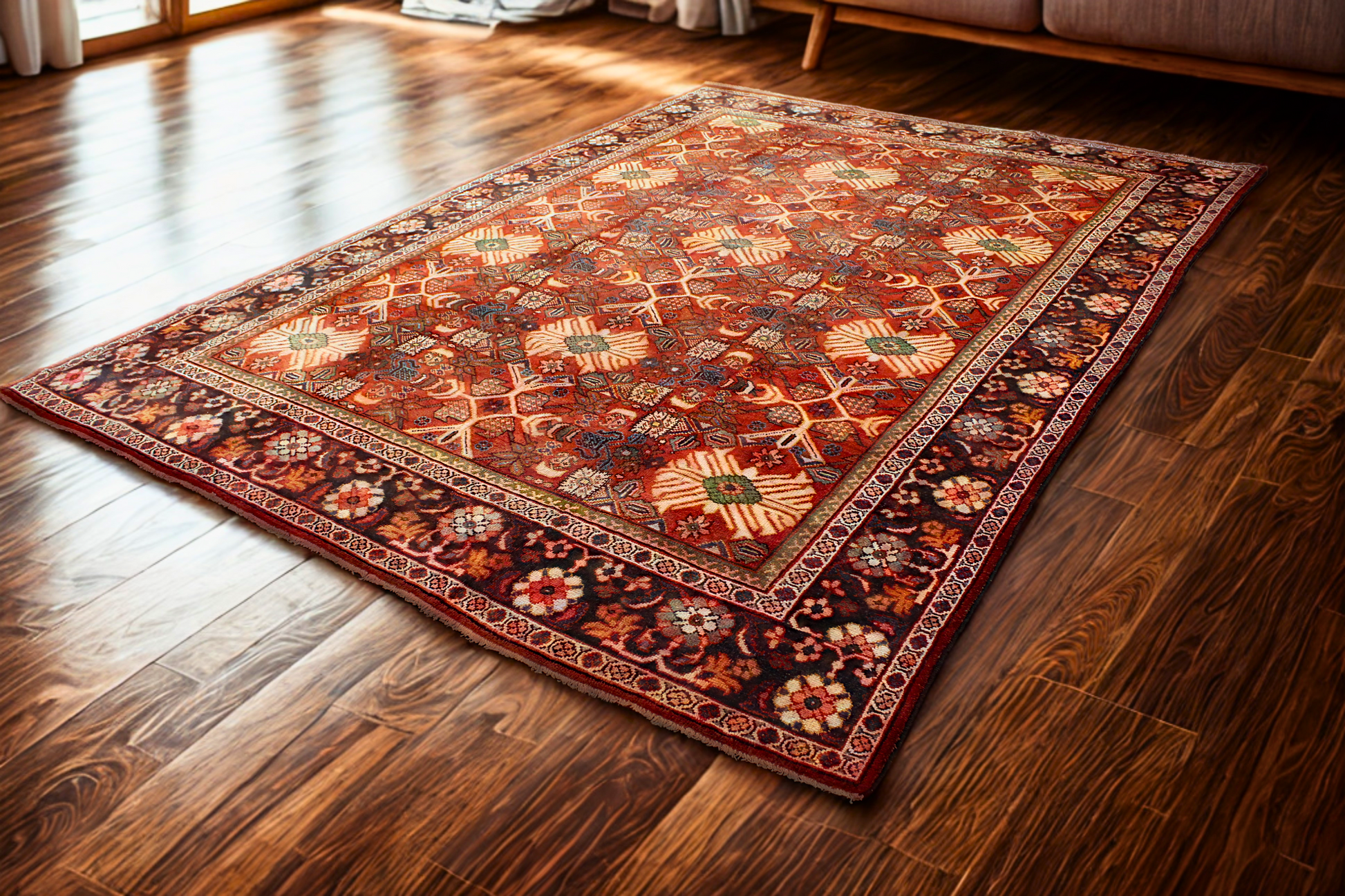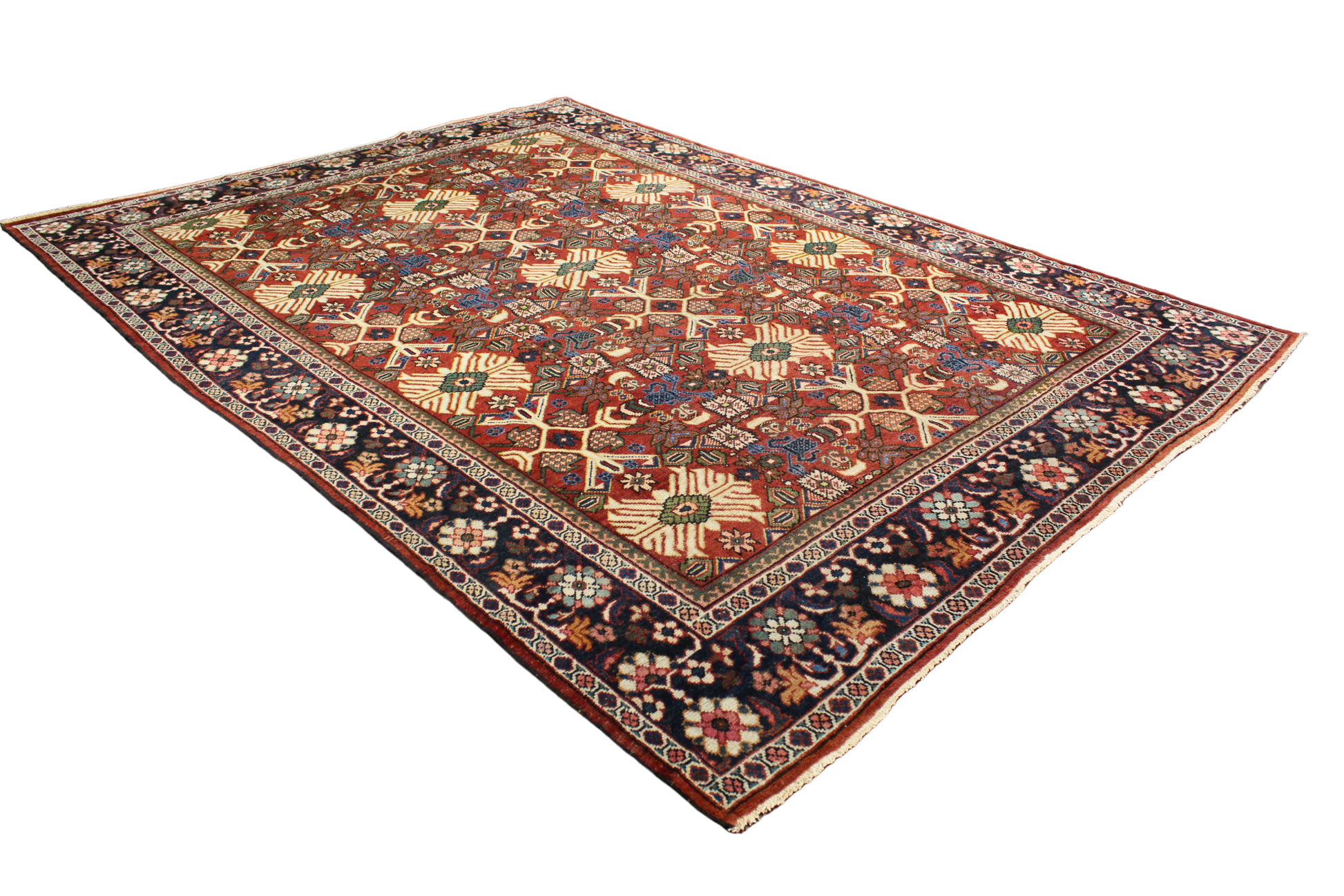 Encasing the composition is a classic floral border set on deep indigo, filled with alternating rosettes and carnation motifs that echo the repeating geometry of the field. The visual structure and decorative variety of this piece make it a standout in both traditional and bohemian-inspired interiors.