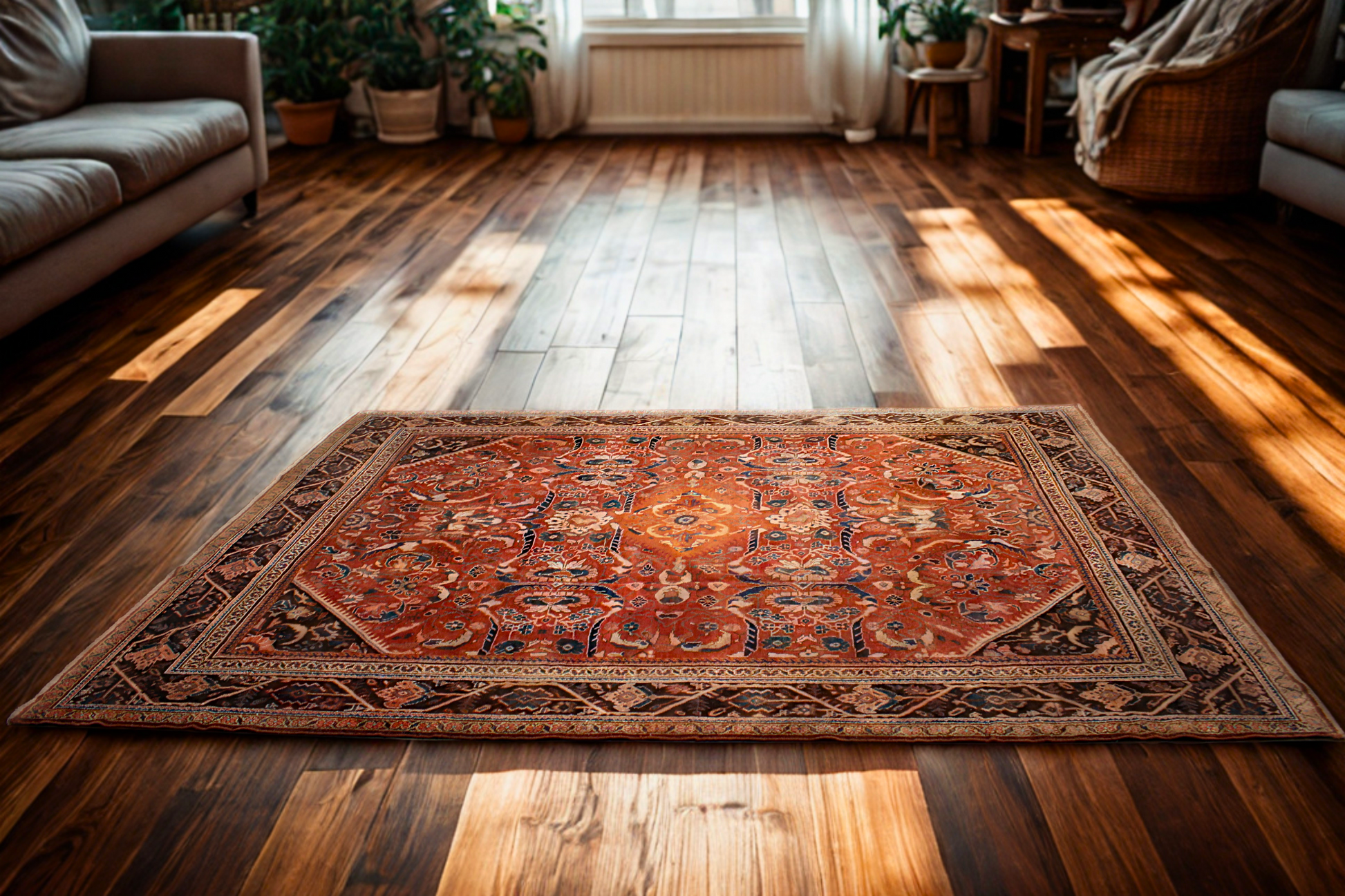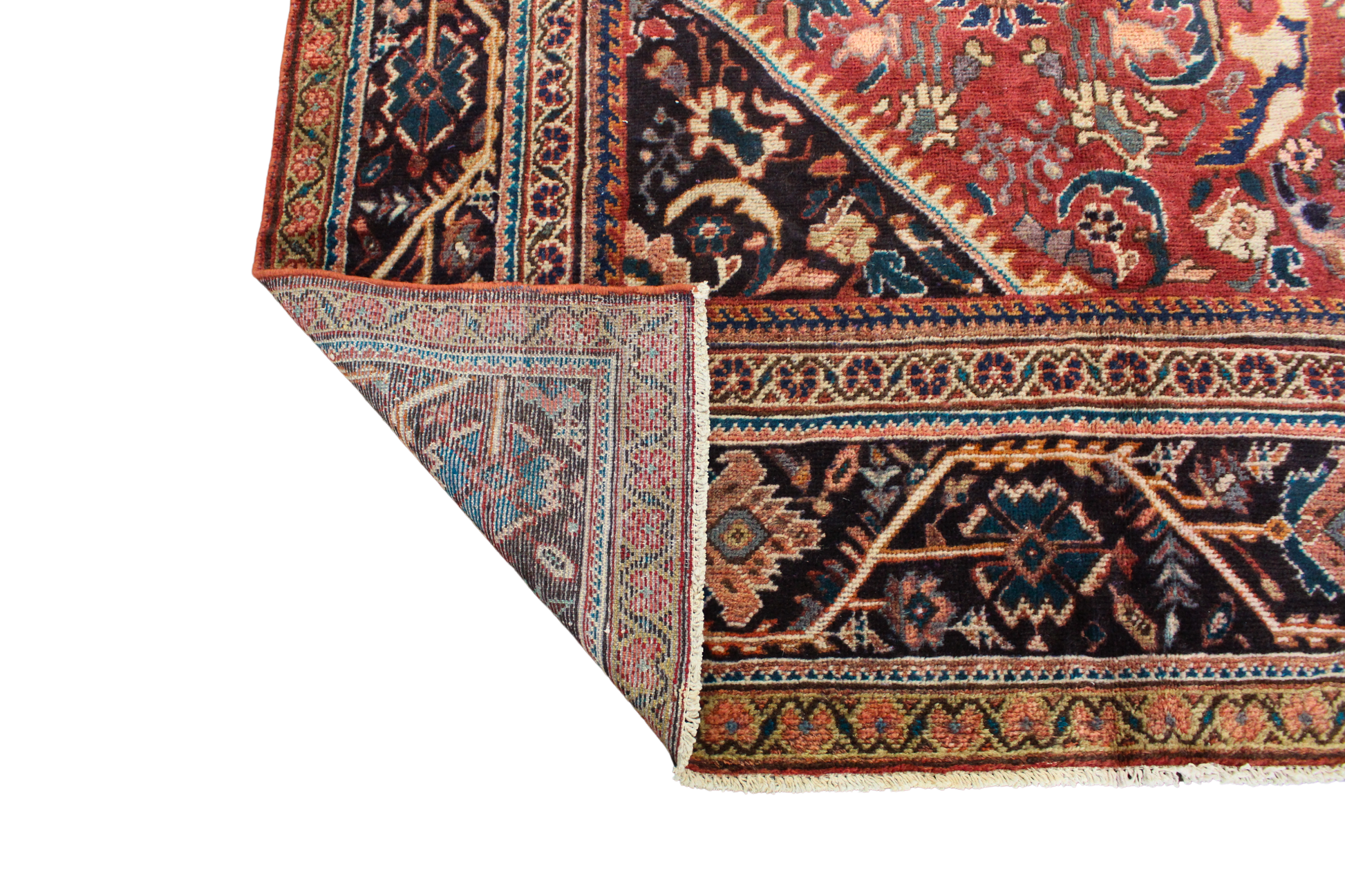 This richly detailed antique Mahal rug exudes rustic charm with its warm brick-red field and symmetrical floral arrangement. A central floral medallion emerges subtly from the densely patterned field, surrounded by botehs, stylized blossoms, and arabesques woven in deep indigo, ivory, soft teal, and coral. The elegant abrash in the field—a hallmark of hand-dyed wool—adds movement and character, highlighting the craftsmanship of its Persian village origins.