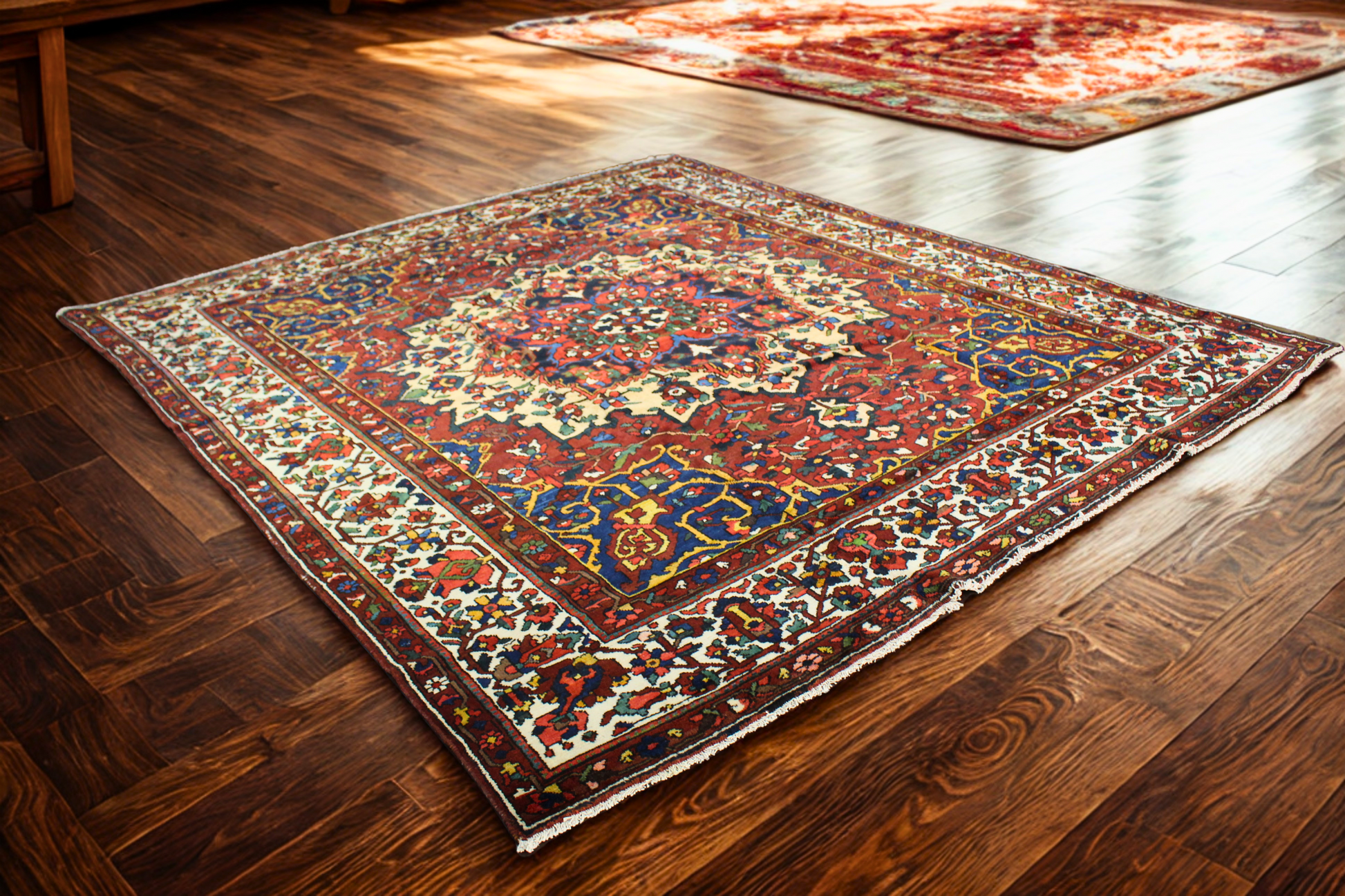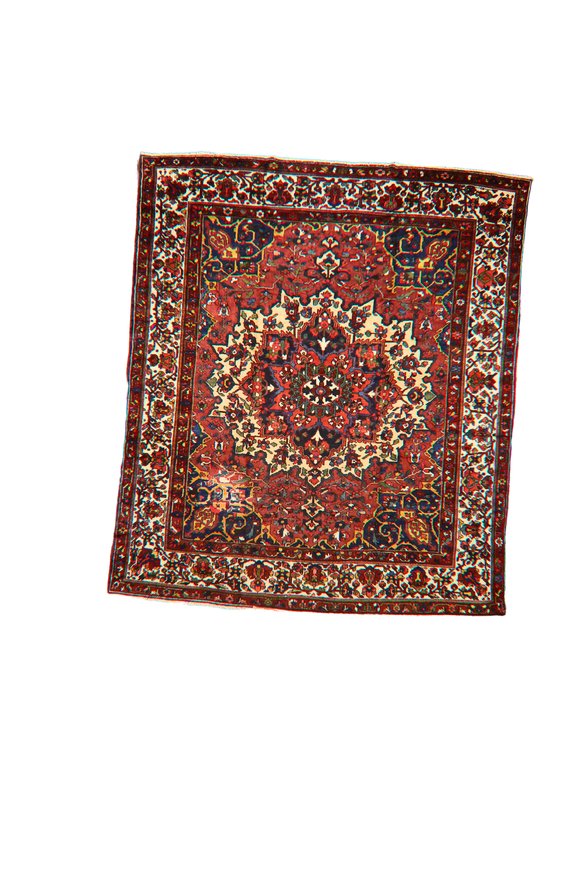 This antique Bakhtiari rug is a striking piece of tribal craftsmanship, featuring a bold central medallion design set against a rich crimson field. The intricate medallion radiates out in layers of navy, ivory, and coral, framed by stylized floral motifs and angular vines. The deep ivory corners echo the center’s boldness and bring strong visual contrast to the composition.