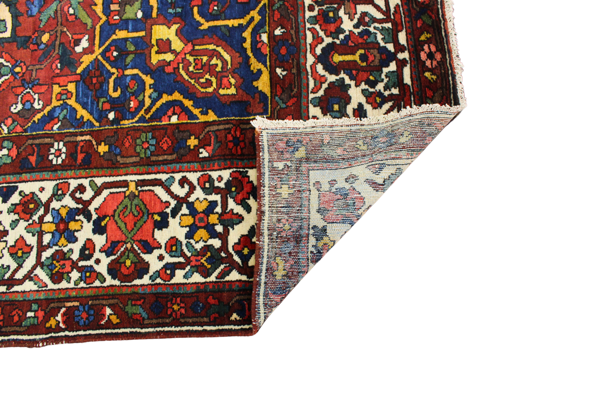 A richly detailed border in ivory surrounds the field with a sequence of rosettes and tendrils, typical of Bakhtiari design. Known for their durability and saturated vegetable dyes, Bakhtiari rugs like this one are ideal for adding classic elegance and depth to a living room, dining space, or office.