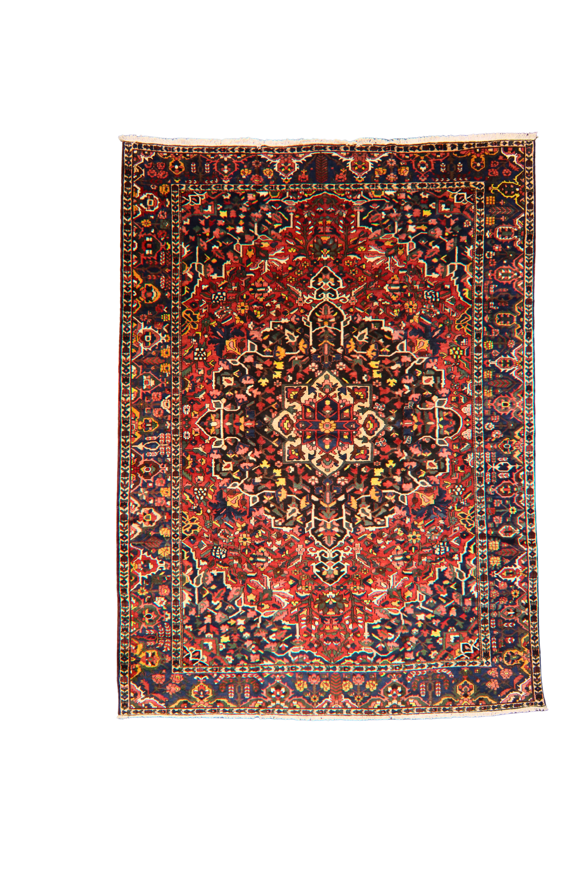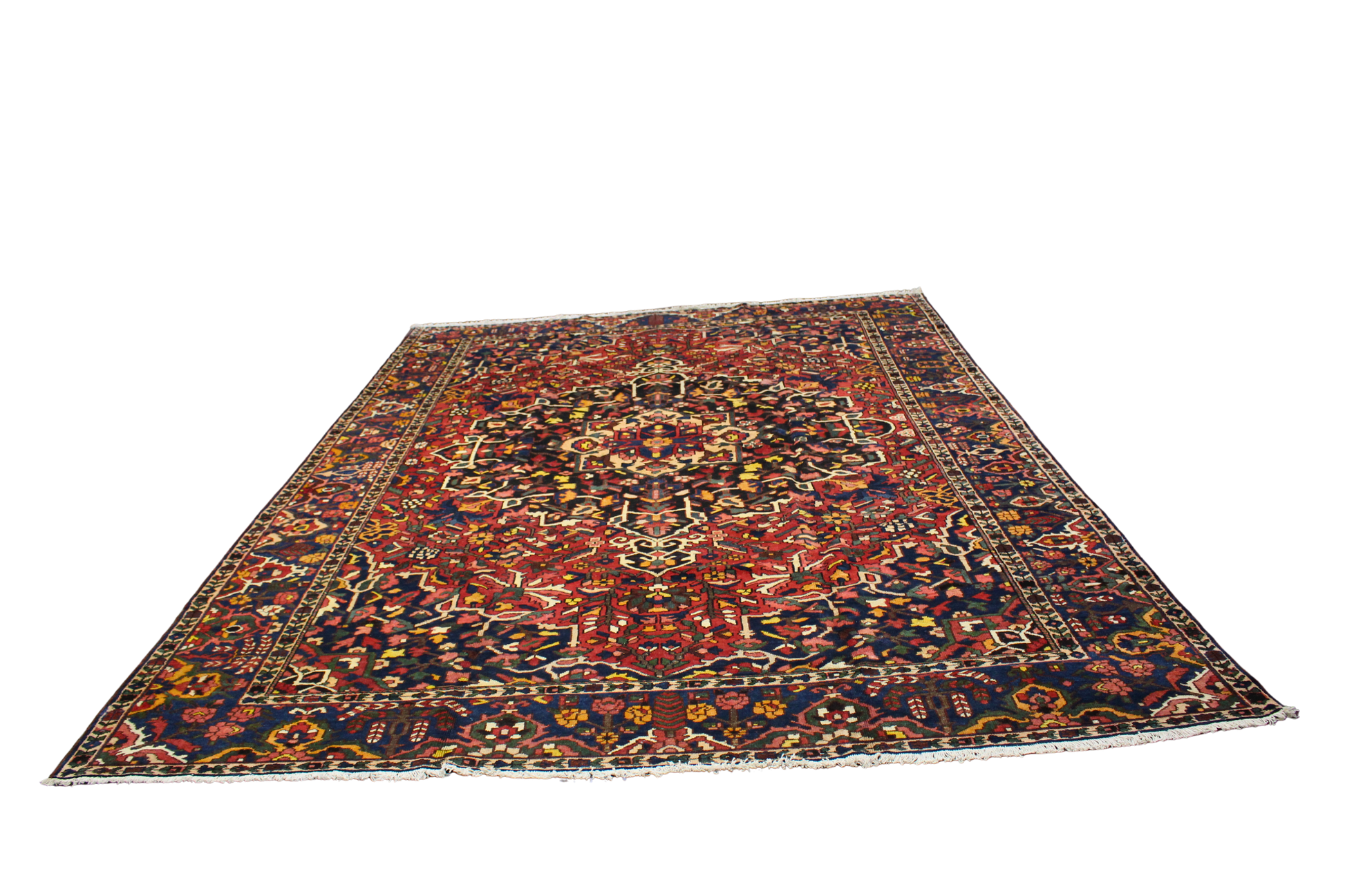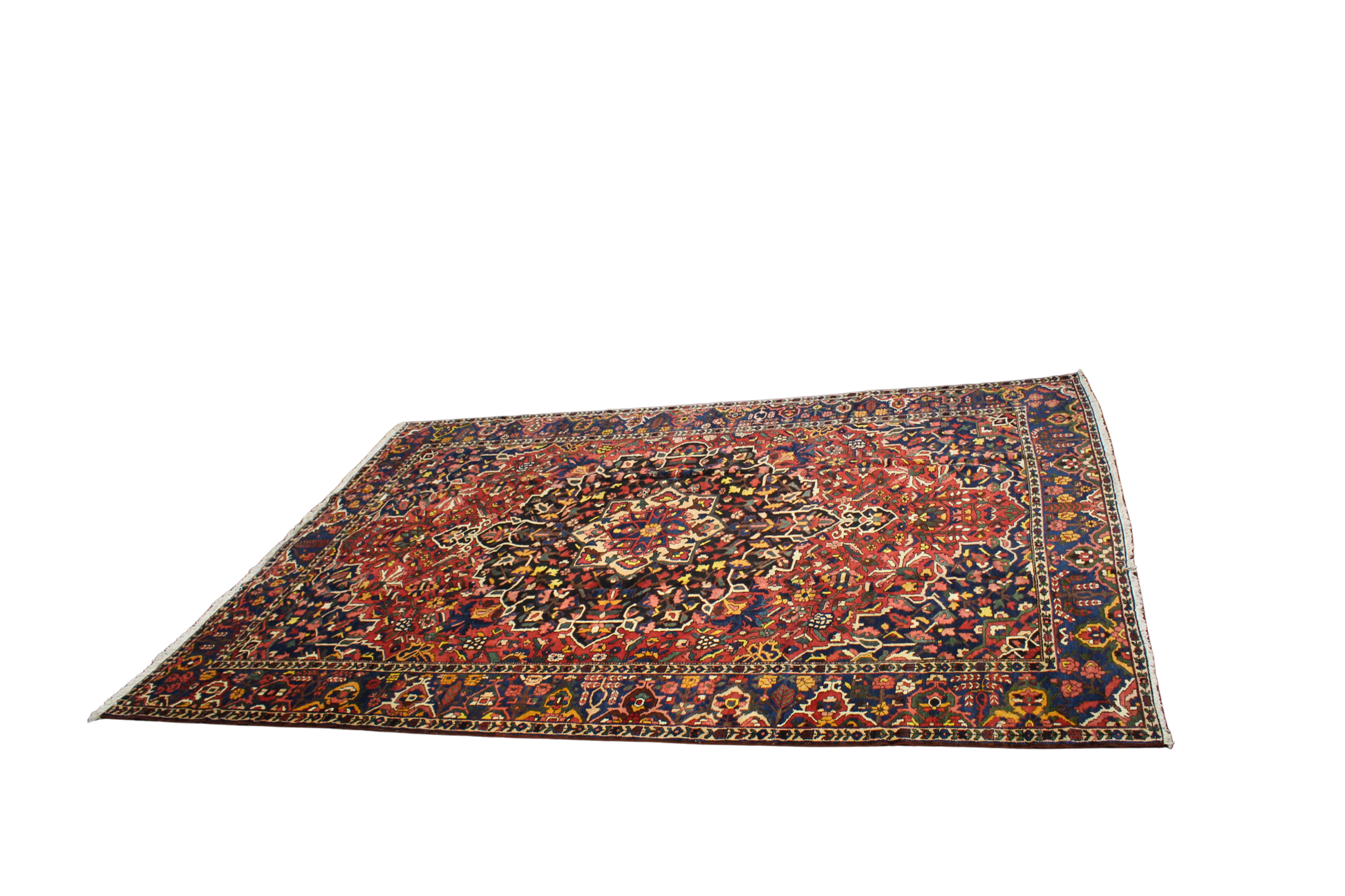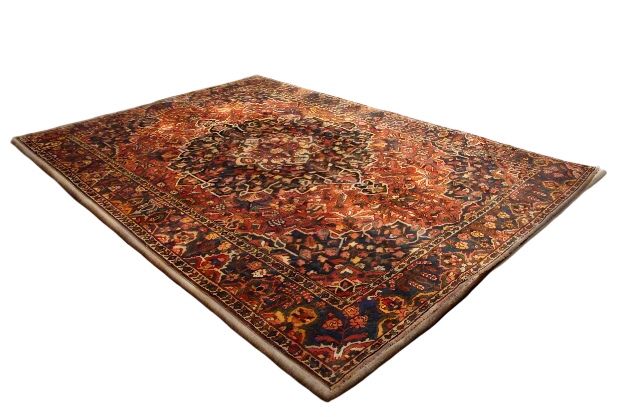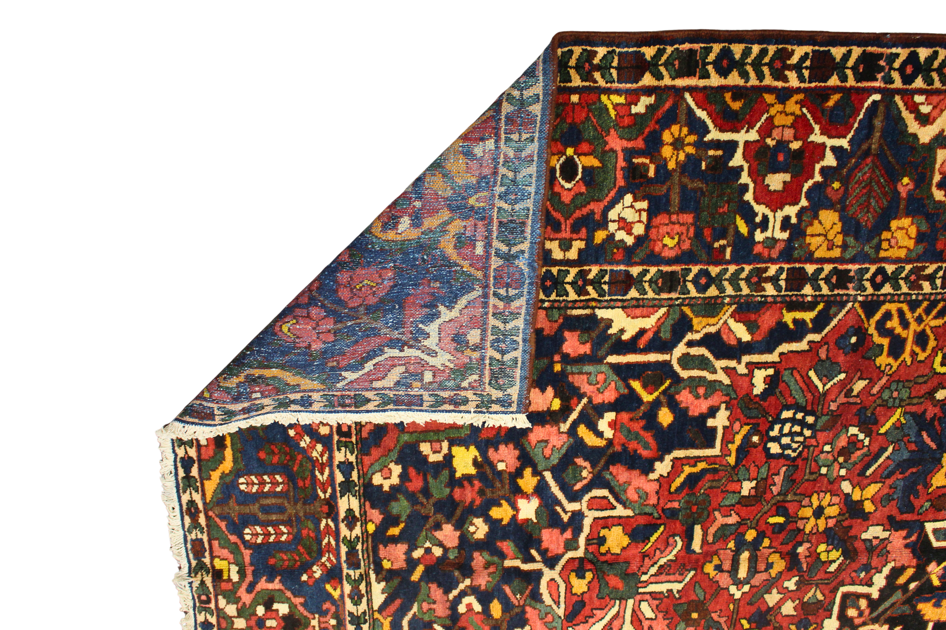 Rich in symbolism and woven with tribal pride, this antique Bakhtiari rug from Persia (10′6″ × 14′4″) stands as a testament to enduring craftsmanship and cultural heritage. The central ivory medallion, set against a midnight blue field, blooms outward in layers of crimson vines, saffron rosettes, and intricate foliage, all woven with the confident geometry that defines the Bakhtiari aesthetic.