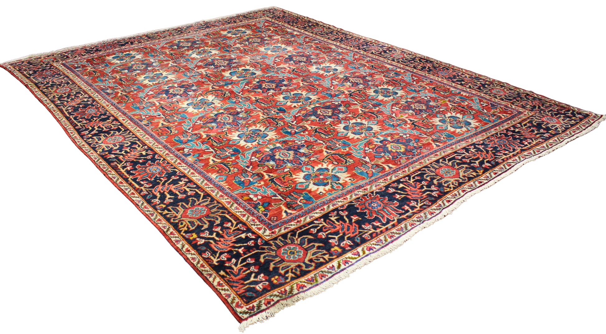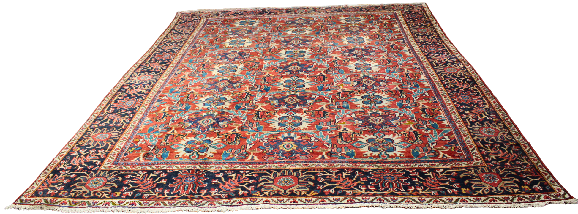 With an effortlessly rhythmic composition, this antique Persian Mahal rug (10.6 × 13.6 ft) captures the poetic charm of traditional village weaving. The field features a stylized allover floral lattice — blooming rosettes arranged with precise balance — lending a visual cadence that feels both regal and inviting.