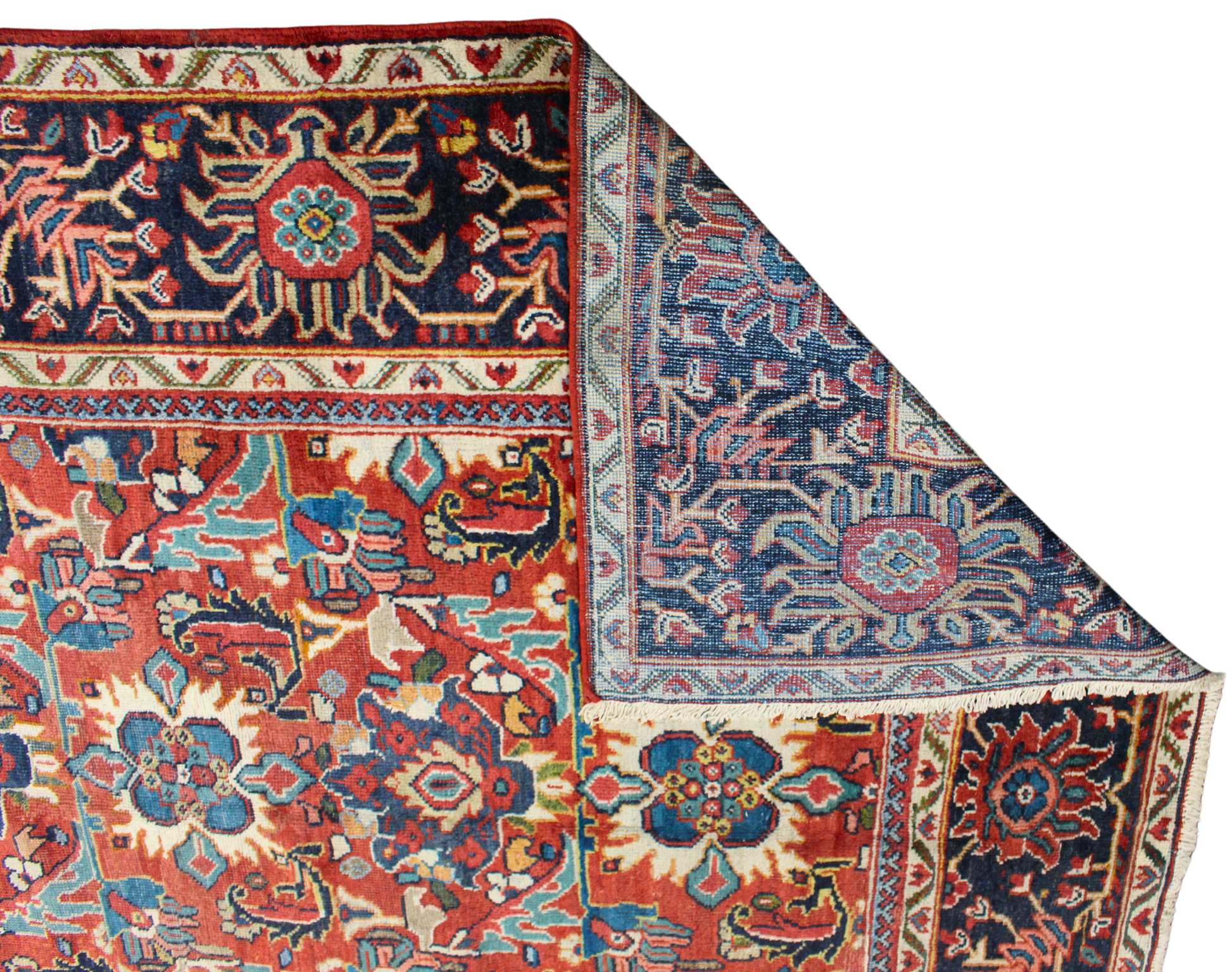 Rendered in rich reds, midnight blues, teal, and ivory, the color palette evokes a dignified warmth. The spandrels and borders are filled with bold palmettes and angular vines, framing the inner garden with bold geometry and mature contrast. This piece is a classic example of the region’s love for grand scale and floral repetition.
